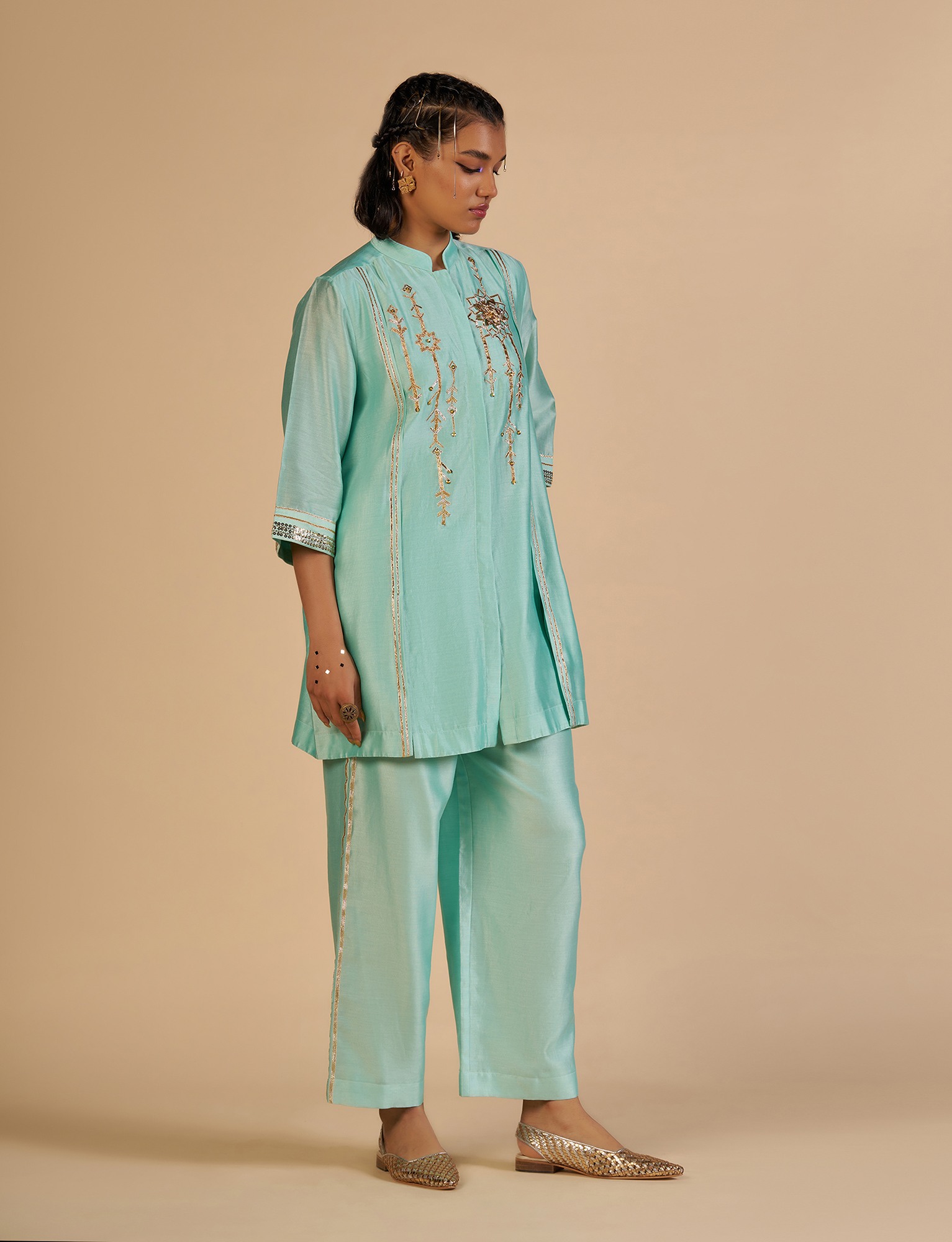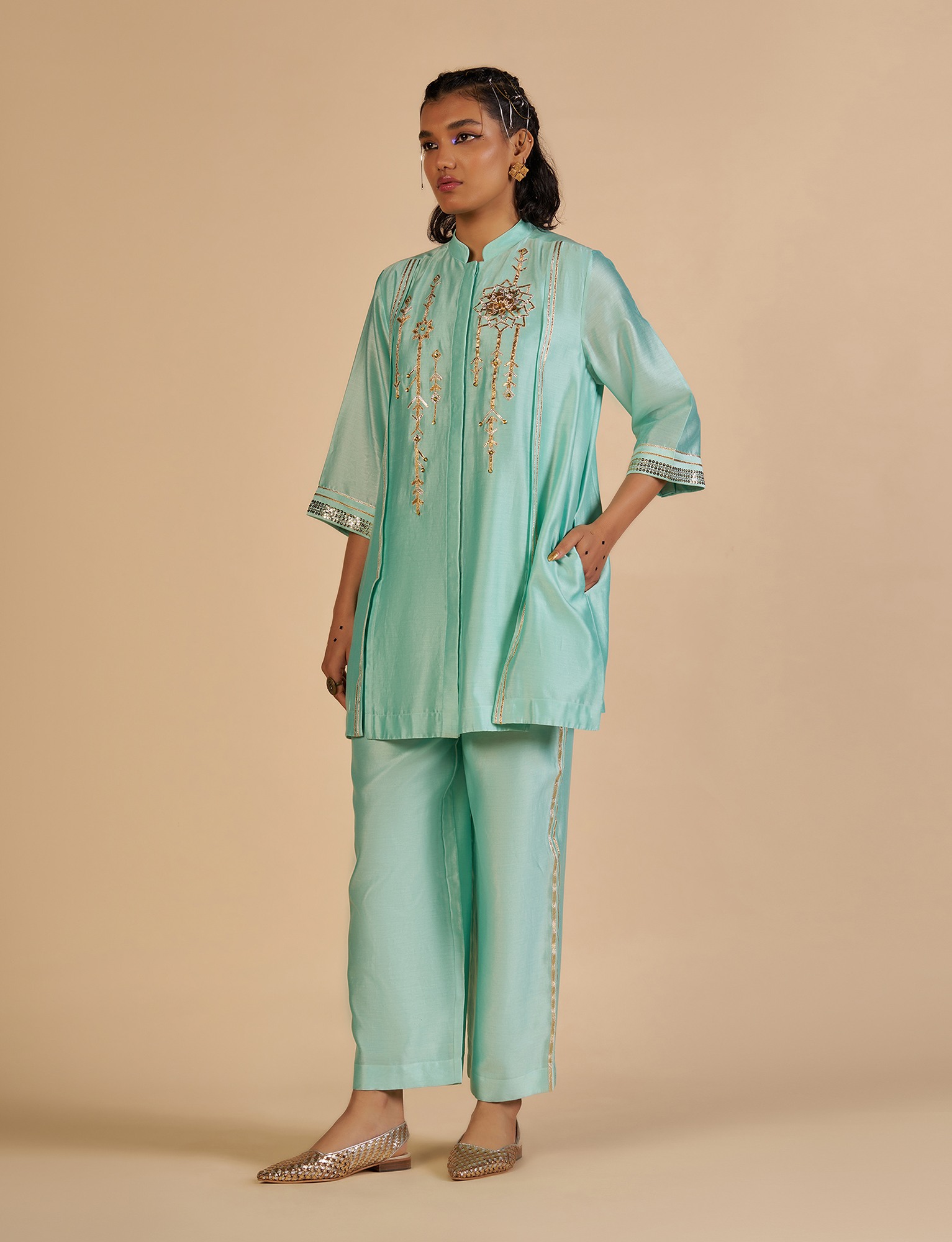 Aqua silk chanderi straight shirt with 3/4th sleeves, pleating detail with gota work and sequin embroidery on the front, with a beautiful hand made 3D gota flower.