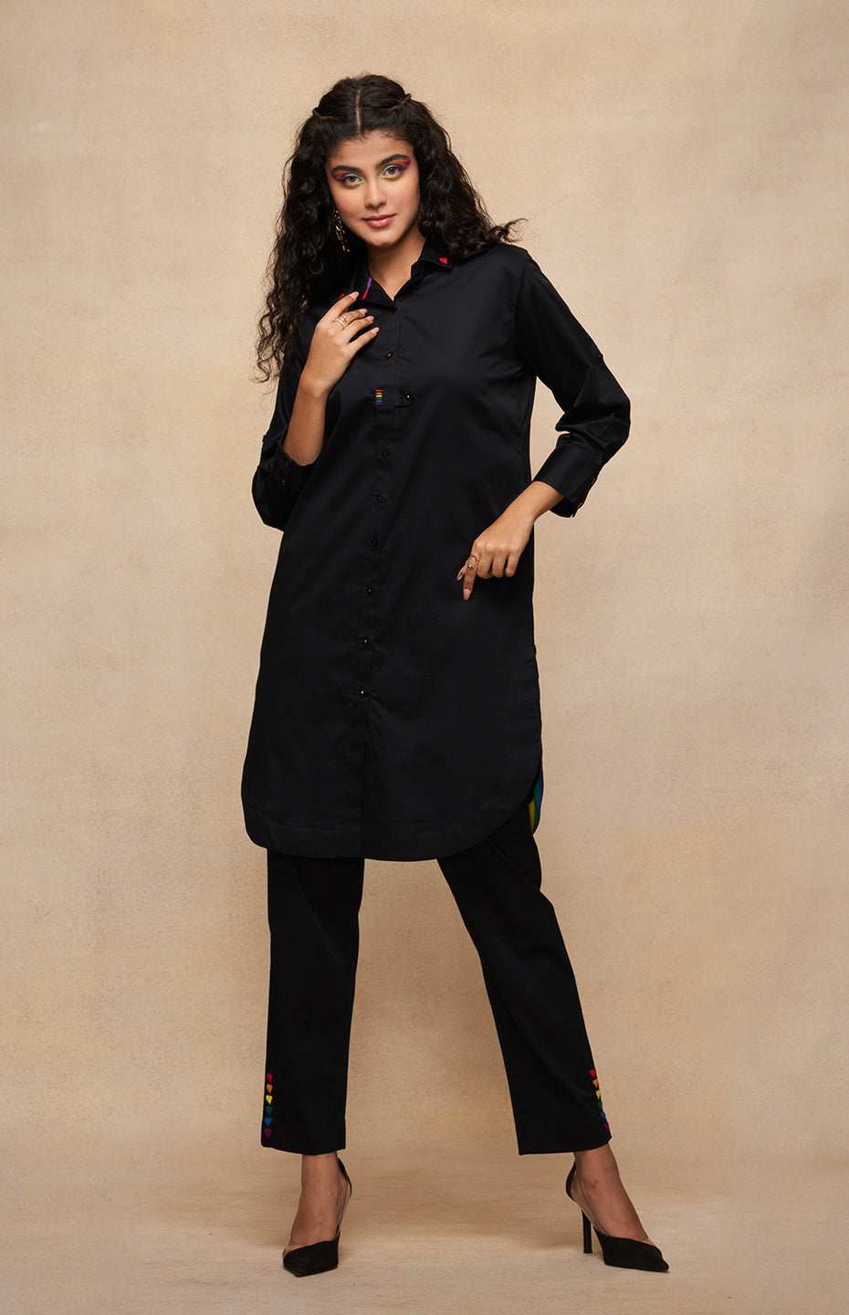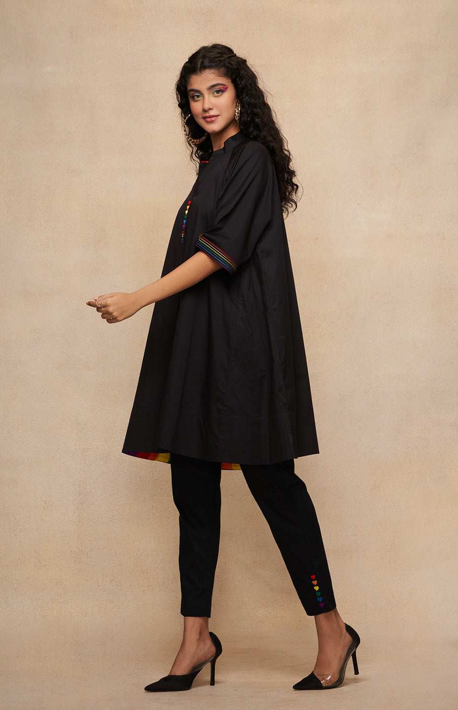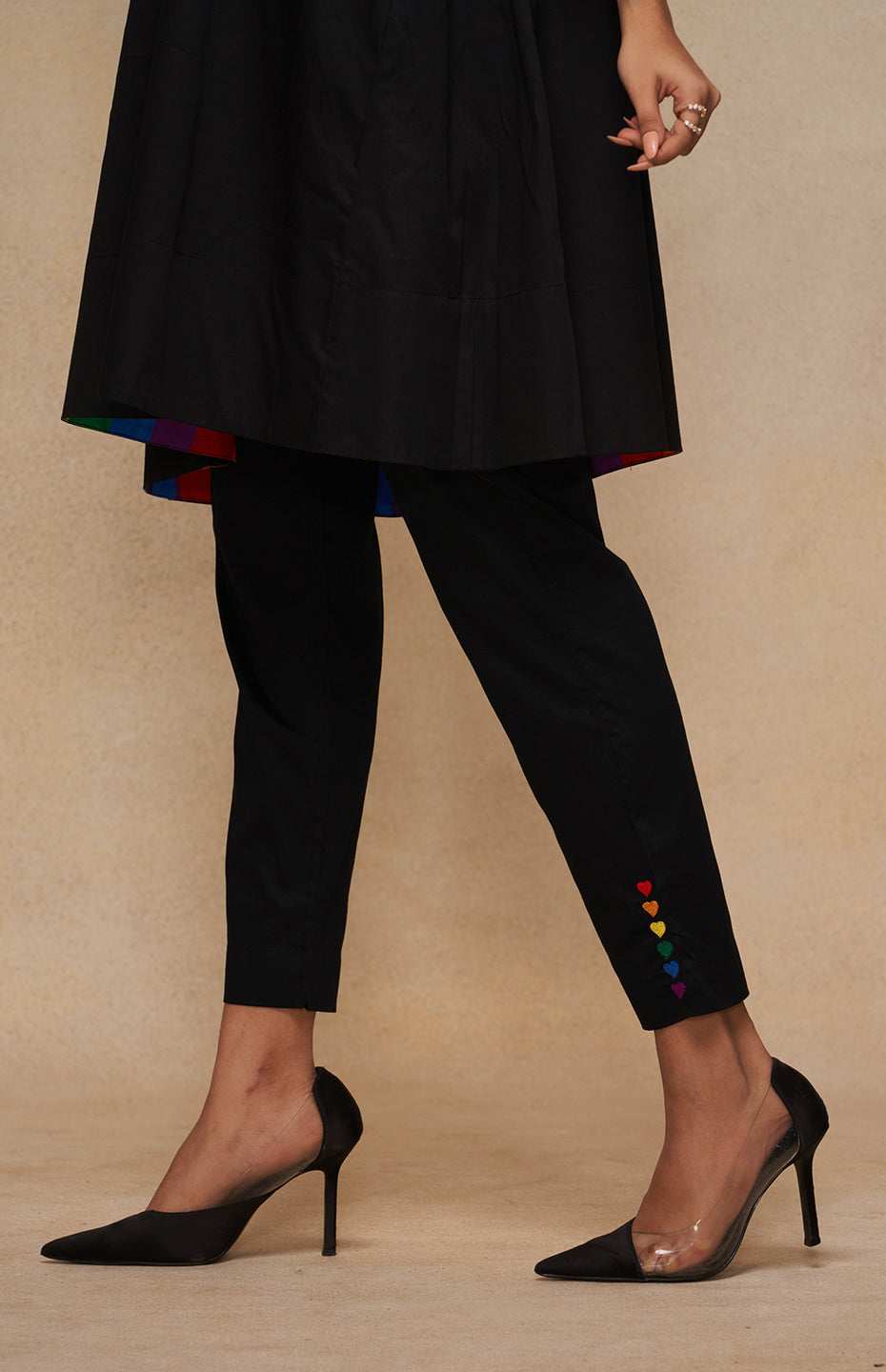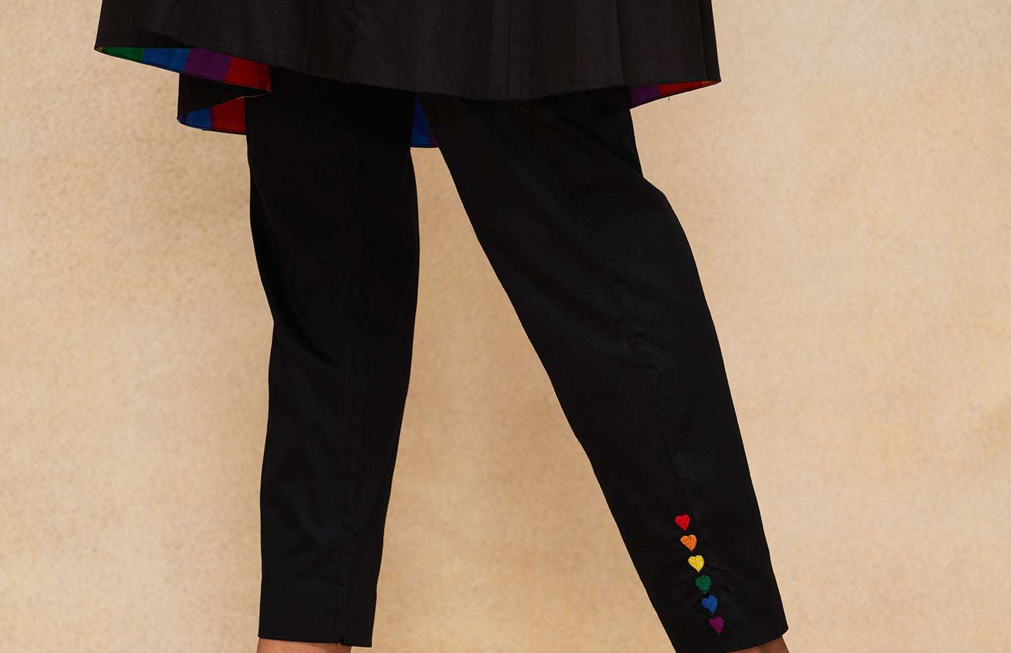 Our Pencil Pants are a testament to the power of simplicity with a twist. On the backdrop Black fabric, the Pride-coloured embroidered hearts add an element of surprise and playfulness. Designed to providing a slimming fit while providing maximum comfort, these pants embody the idea of standing tall and proud. Pair them with a long shirt or with our matching tunic for a complete ensemble.