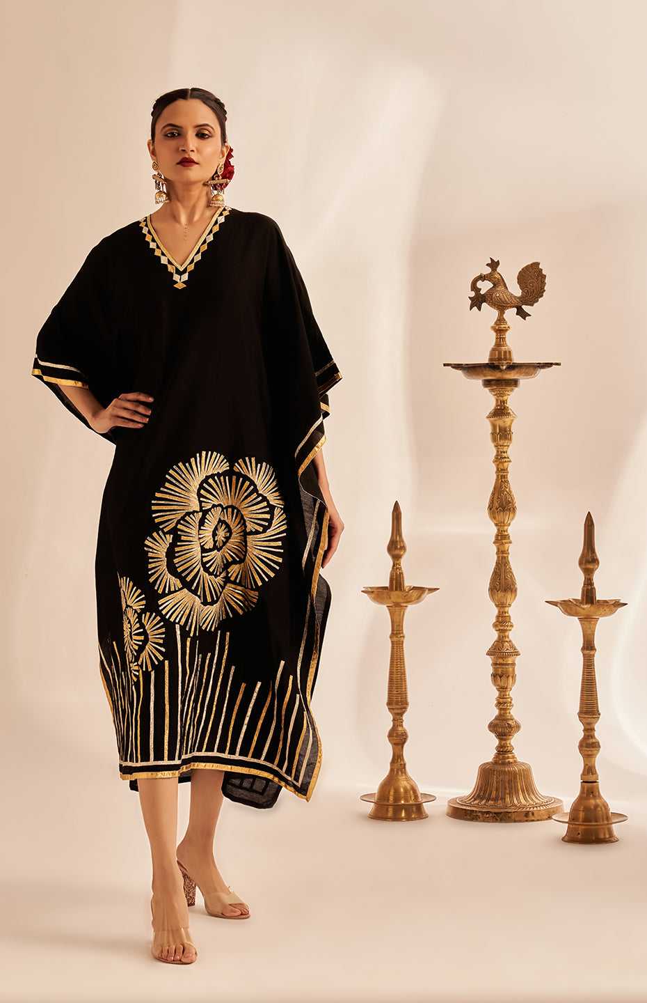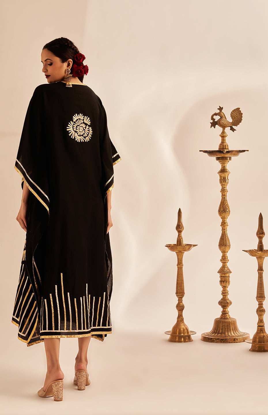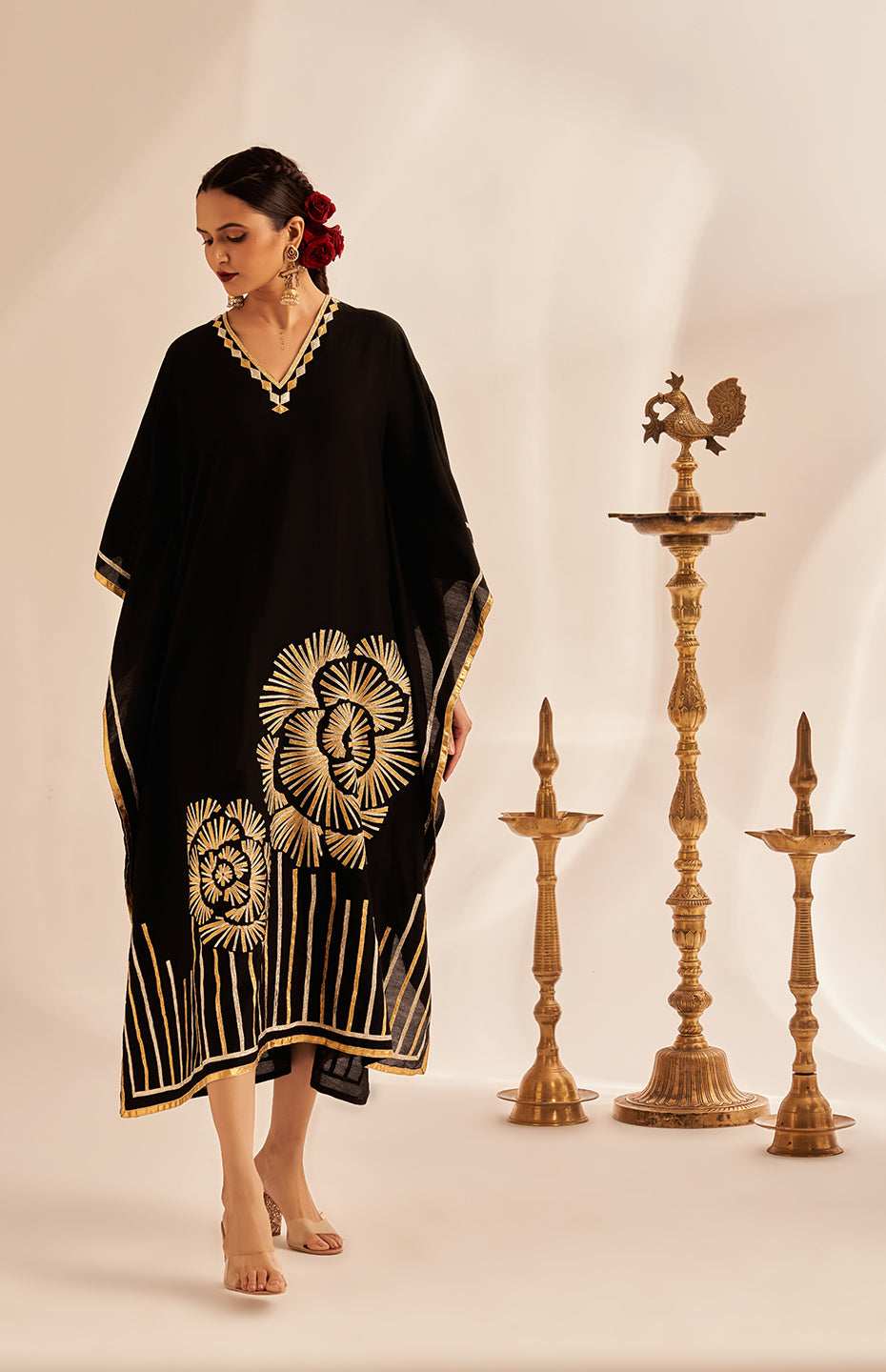 Our Kaftan from the Rose Gota collection captures the glamour and comfort of flowy silhouettes and features a unique take on the classic Gota detailing.