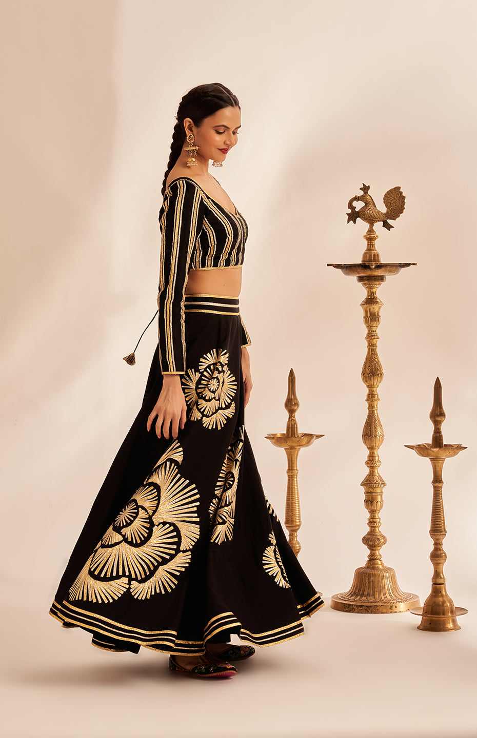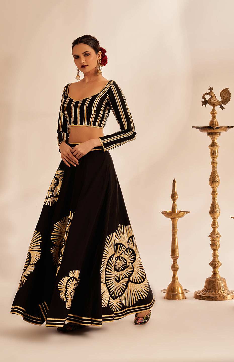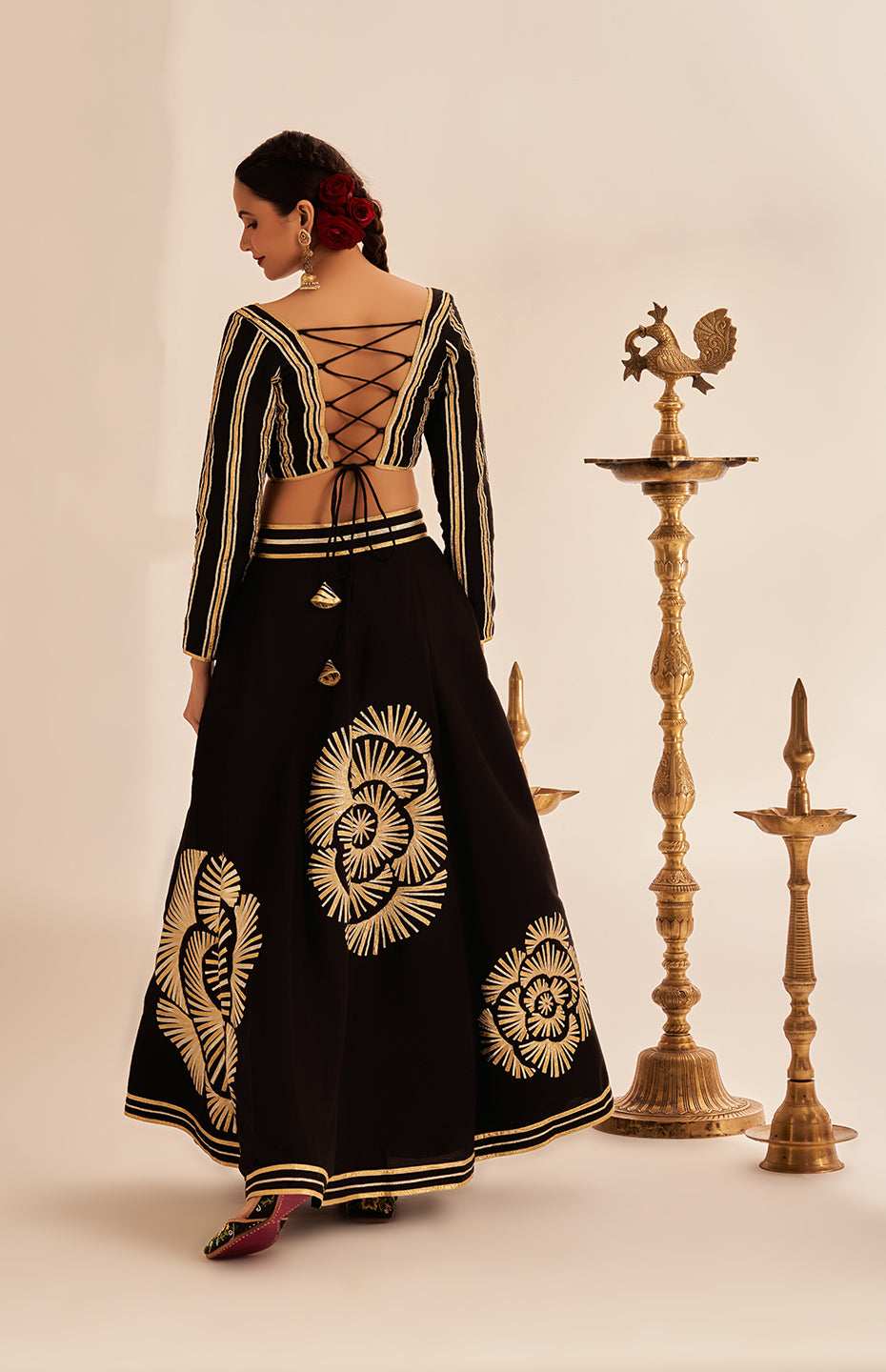 Our Kali Skirt from the Rose Gota collection is a true work of art. It features the brand's signature classic Gota detailing, reimagined with a stunning Rose motif that is sure to turn heads.