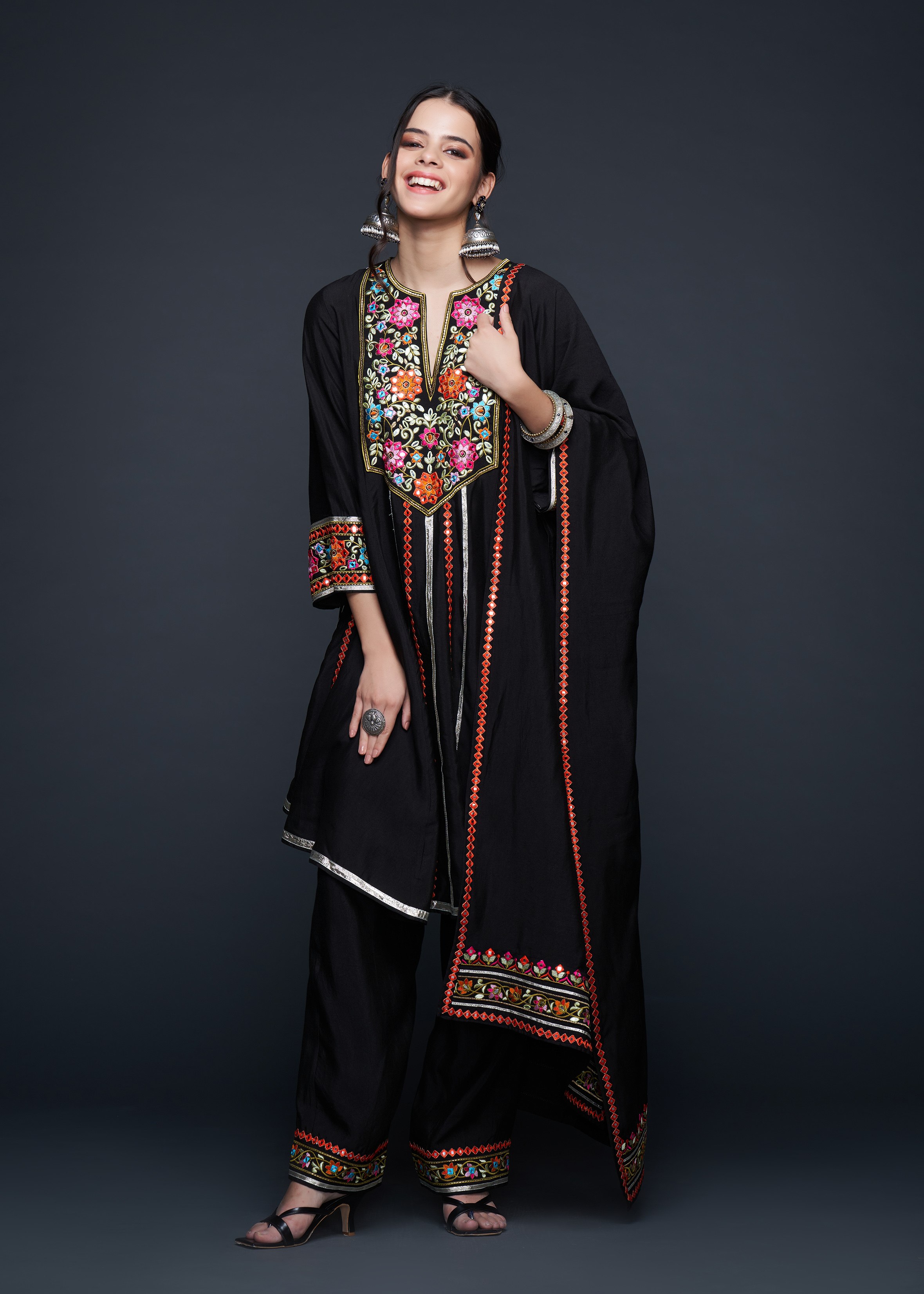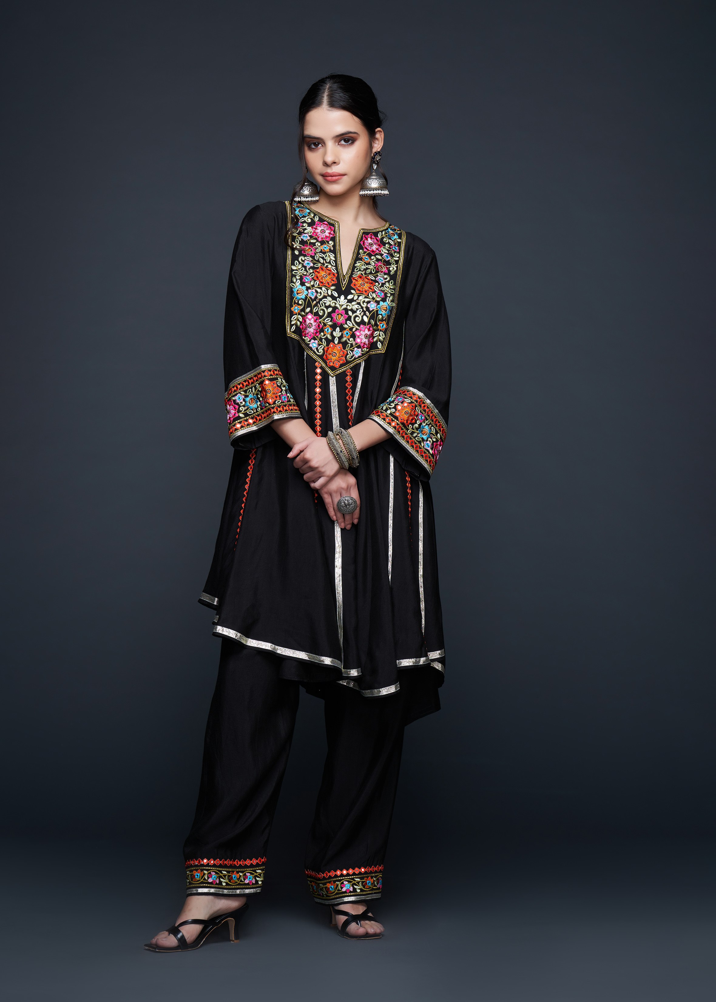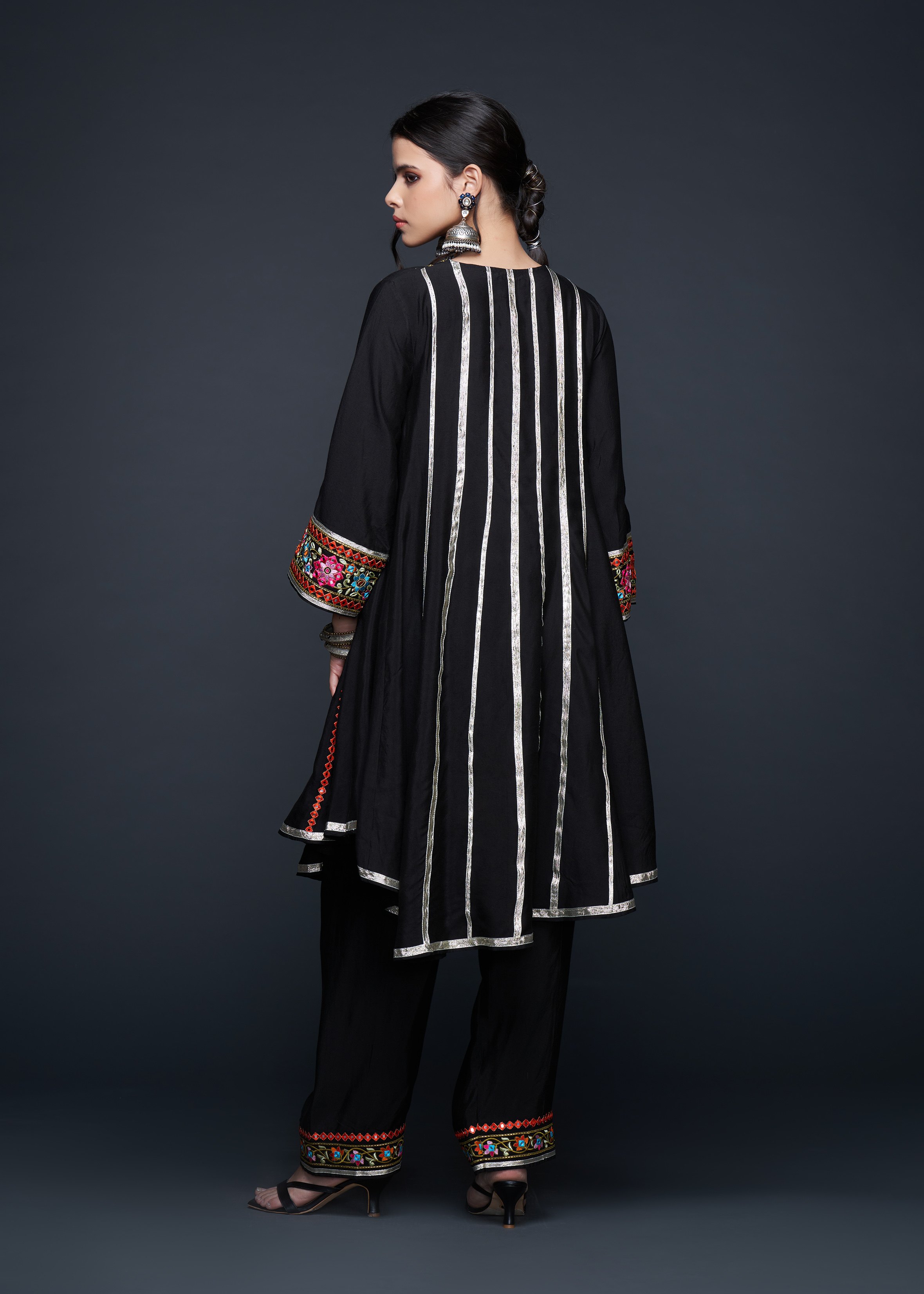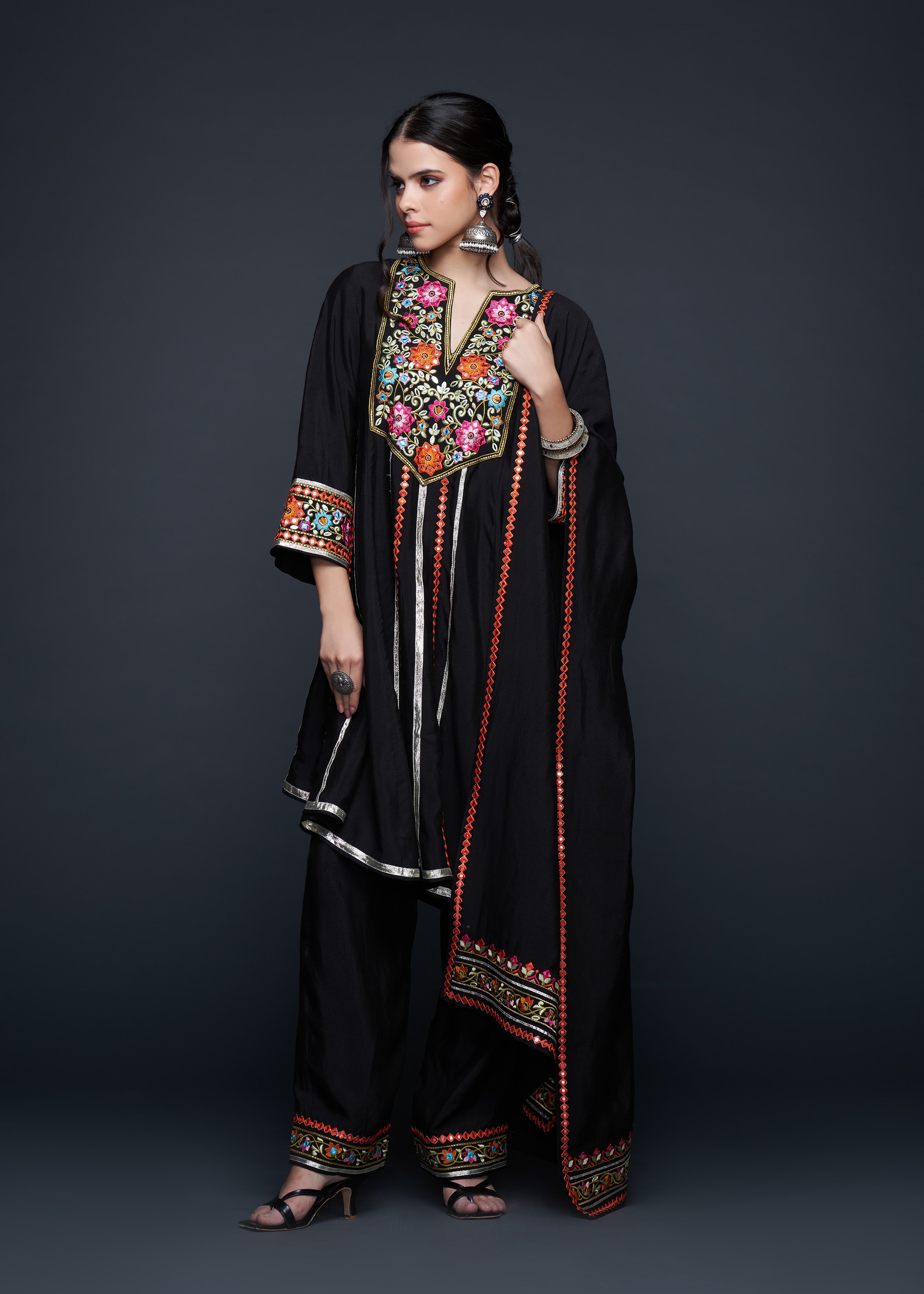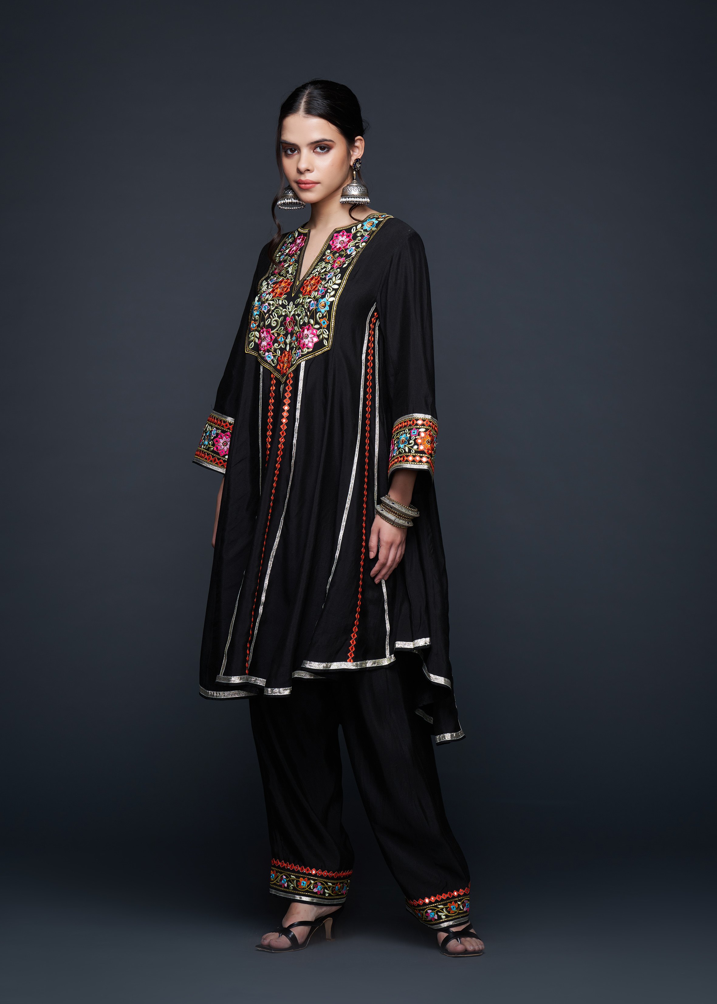 This stunning Kali Kurta is the epitome of elegance, designed with a sophisticated rounded V-neck that leads into a beautifully flared silhouette. The kurta showcases exquisite craftsmanship with its subtle embellishments, perfect for those seeking a blend of tradition and contemporary style. Its flowing design and delicate fabric make it an ideal choice for any occasion.