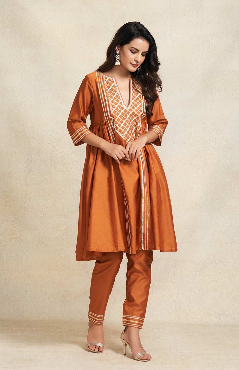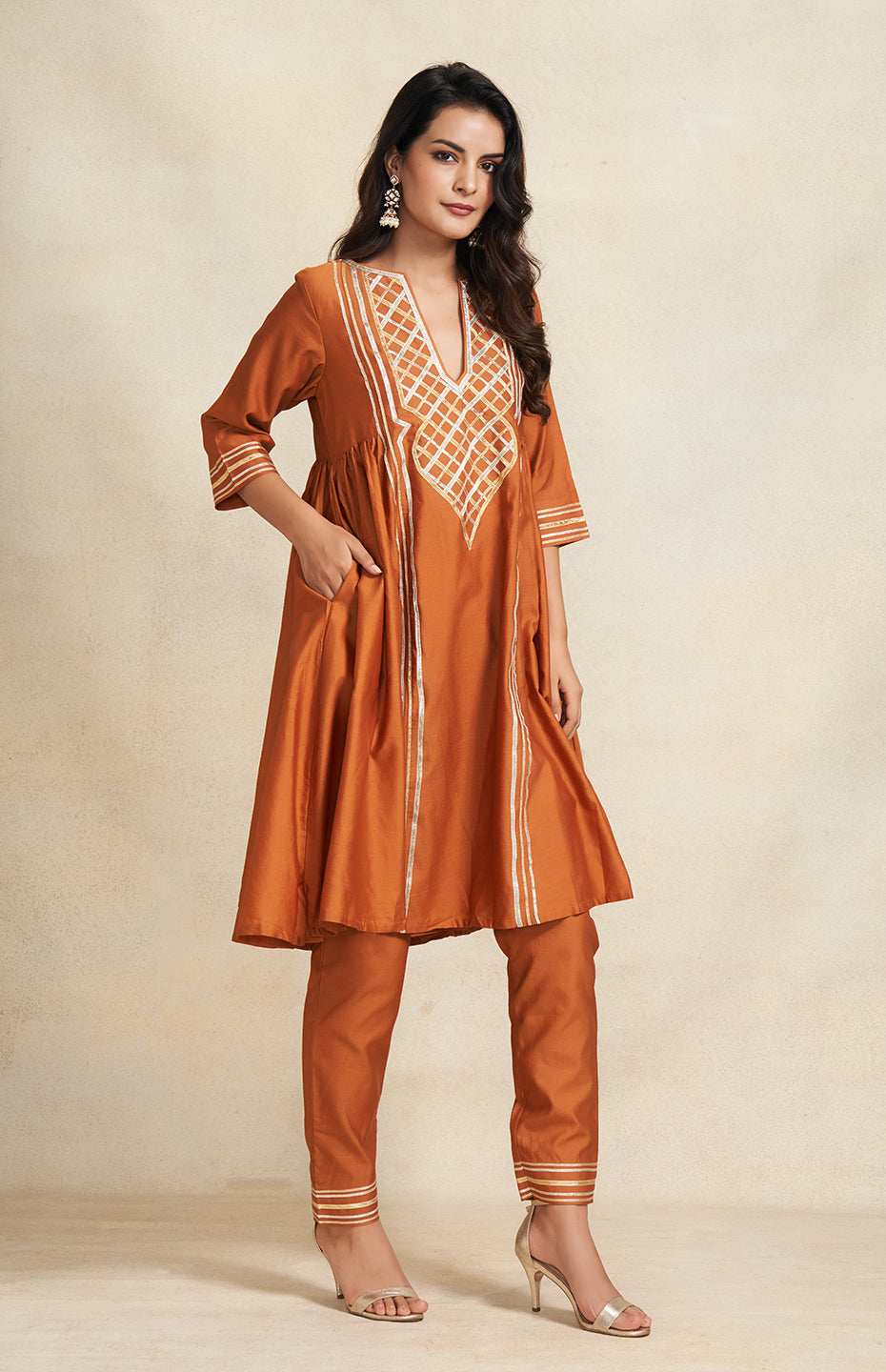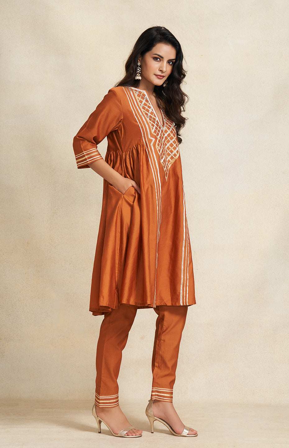 Fluidity meets finesse in this gathered kurta. The intricate Gota yoke is a testament to craftsmanship, while the 3/4th sleeves keep it effortlessly stylish.