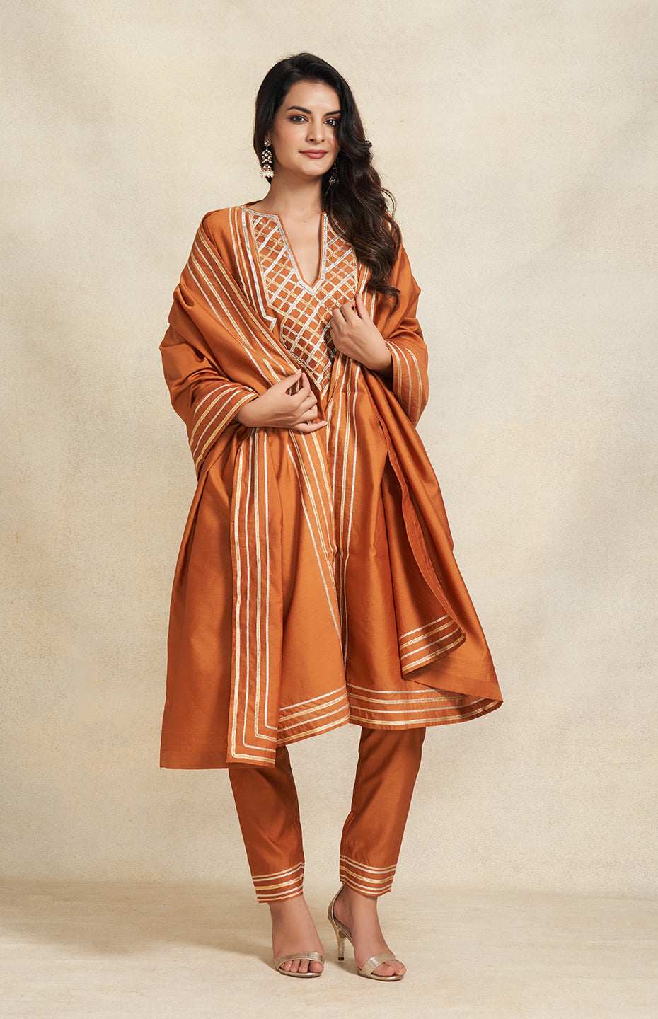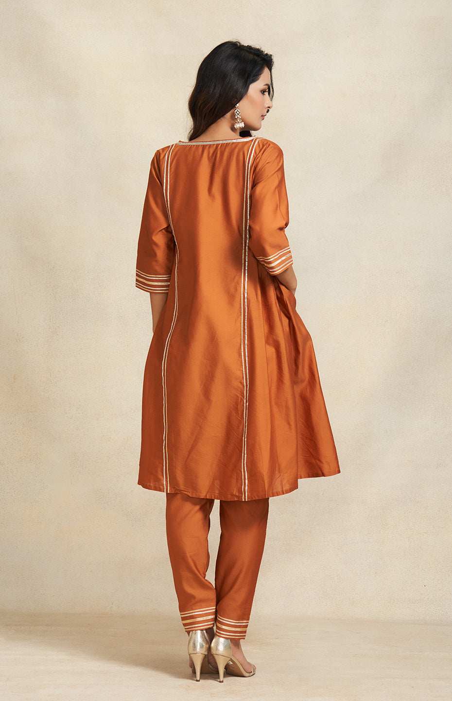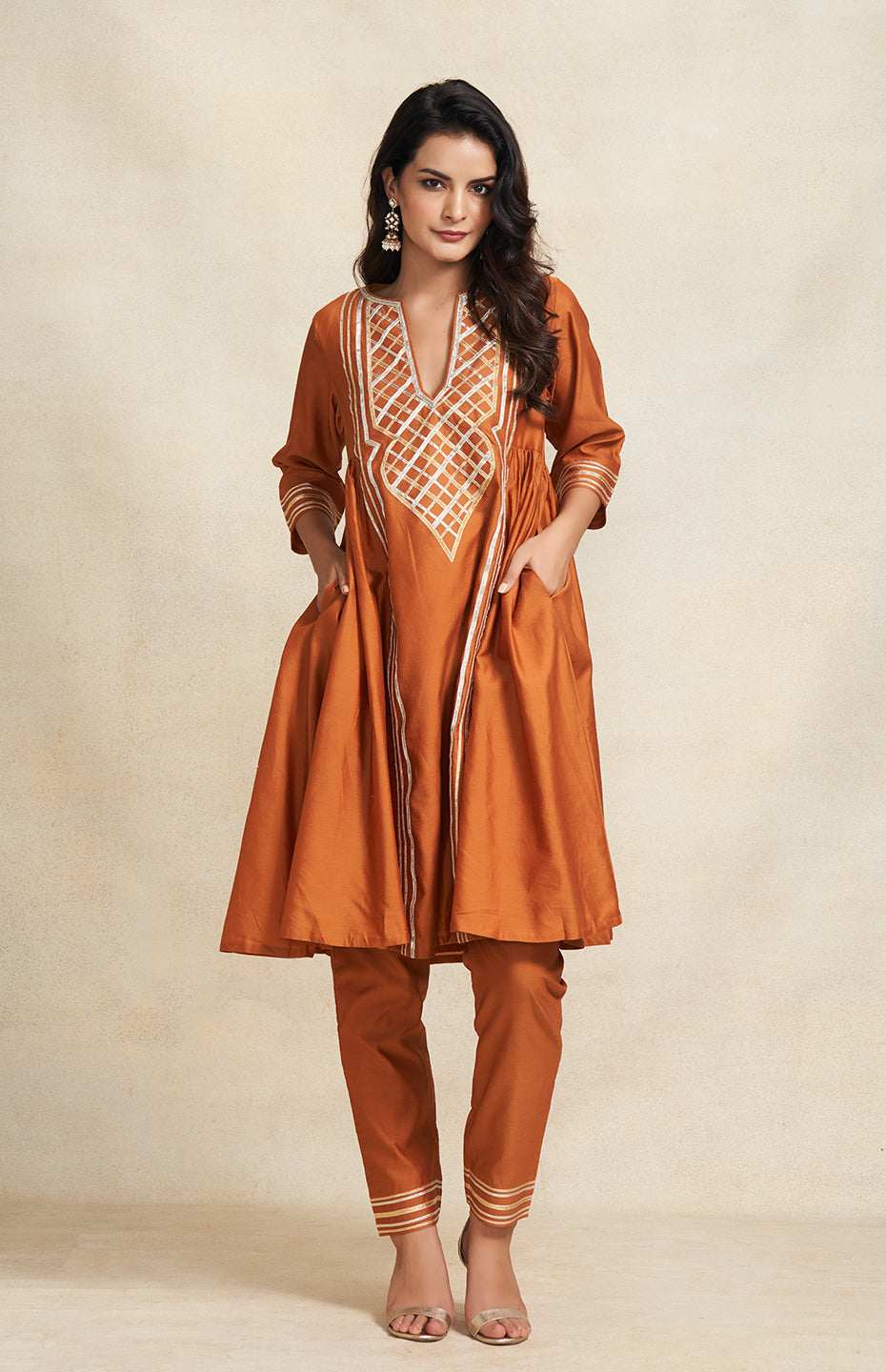 Fluidity meets finesse in this gathered kurta. The intricate Gota yoke is a testament to craftsmanship, while the 3/4th sleeves keep it effortlessly stylish.