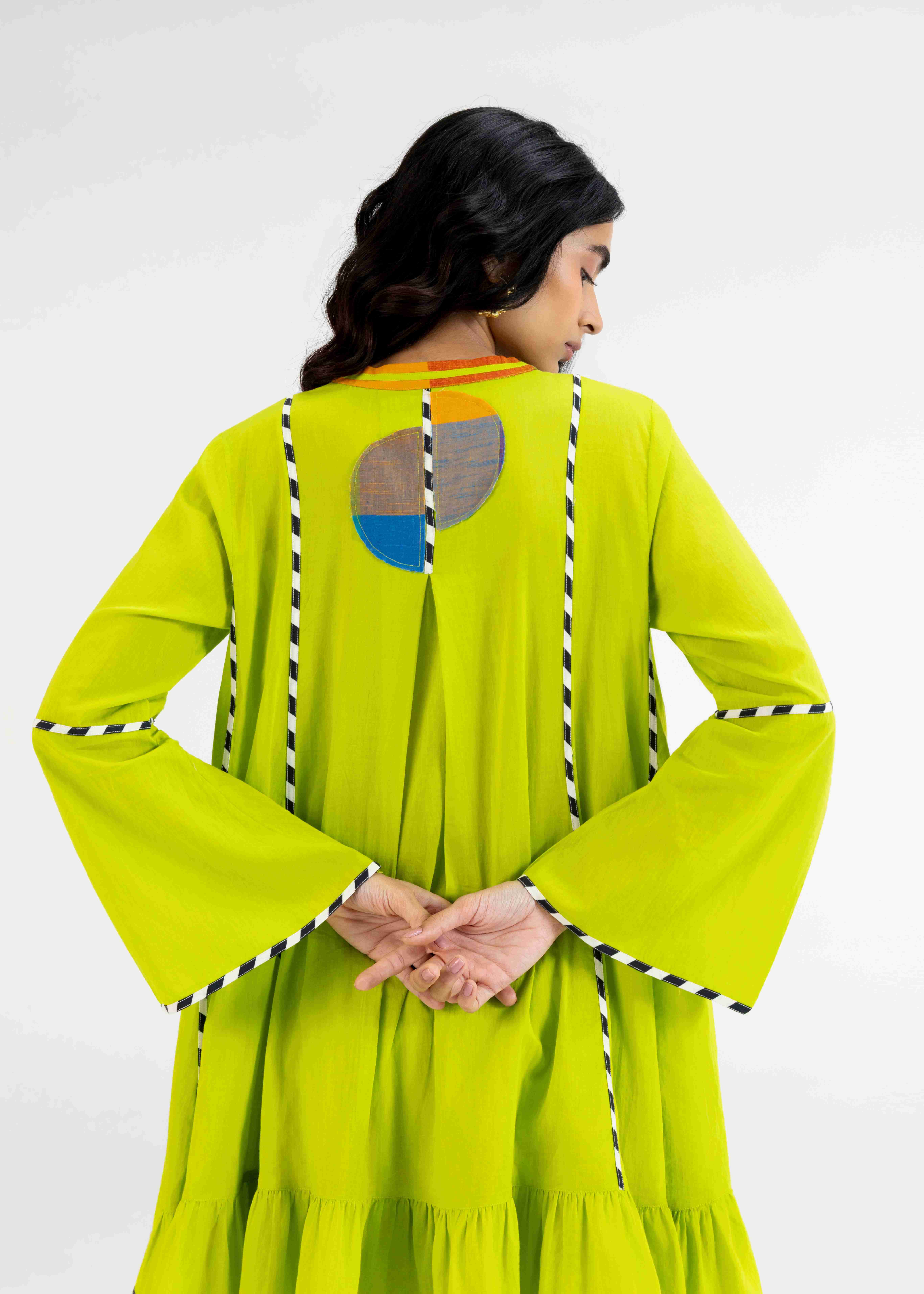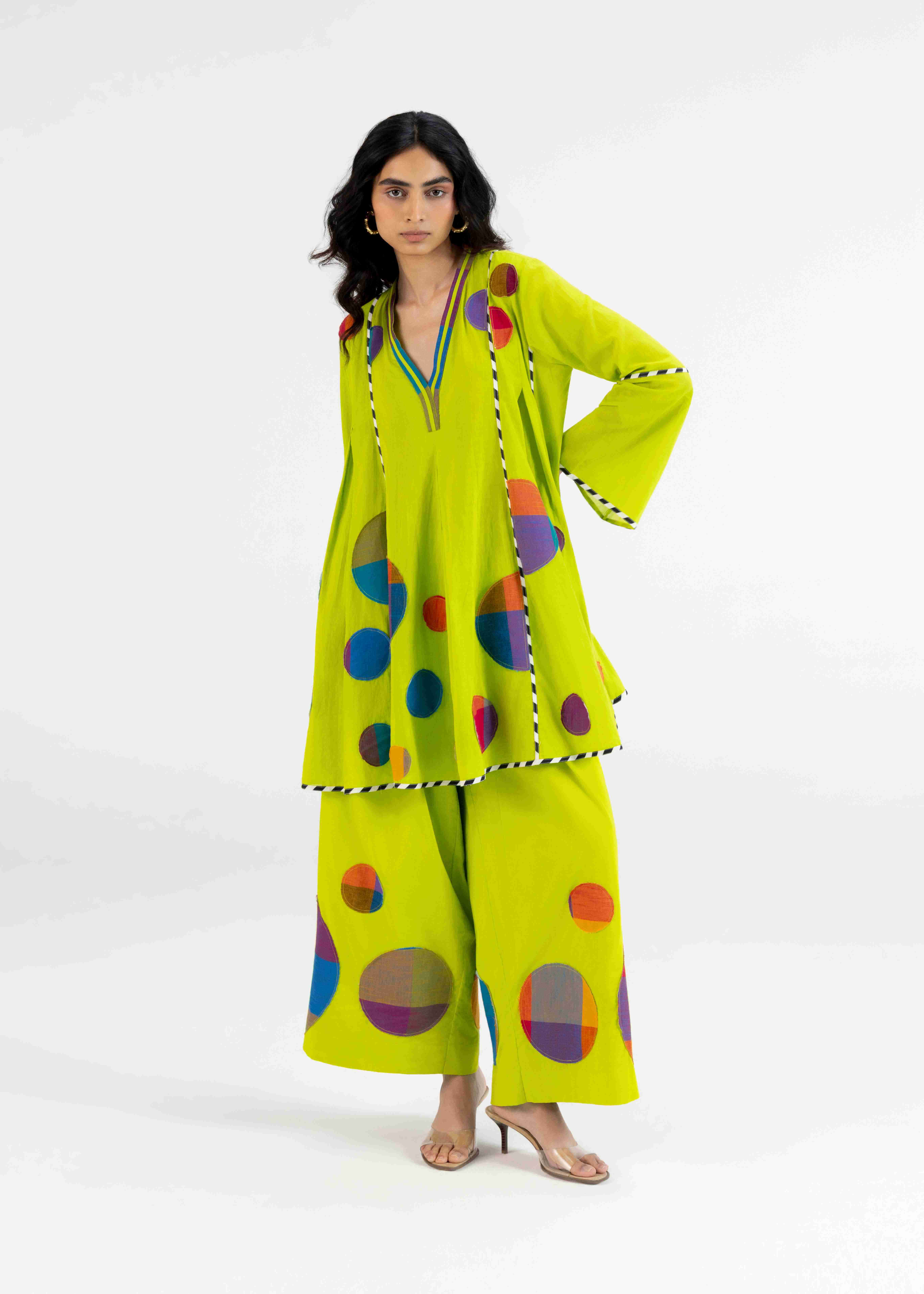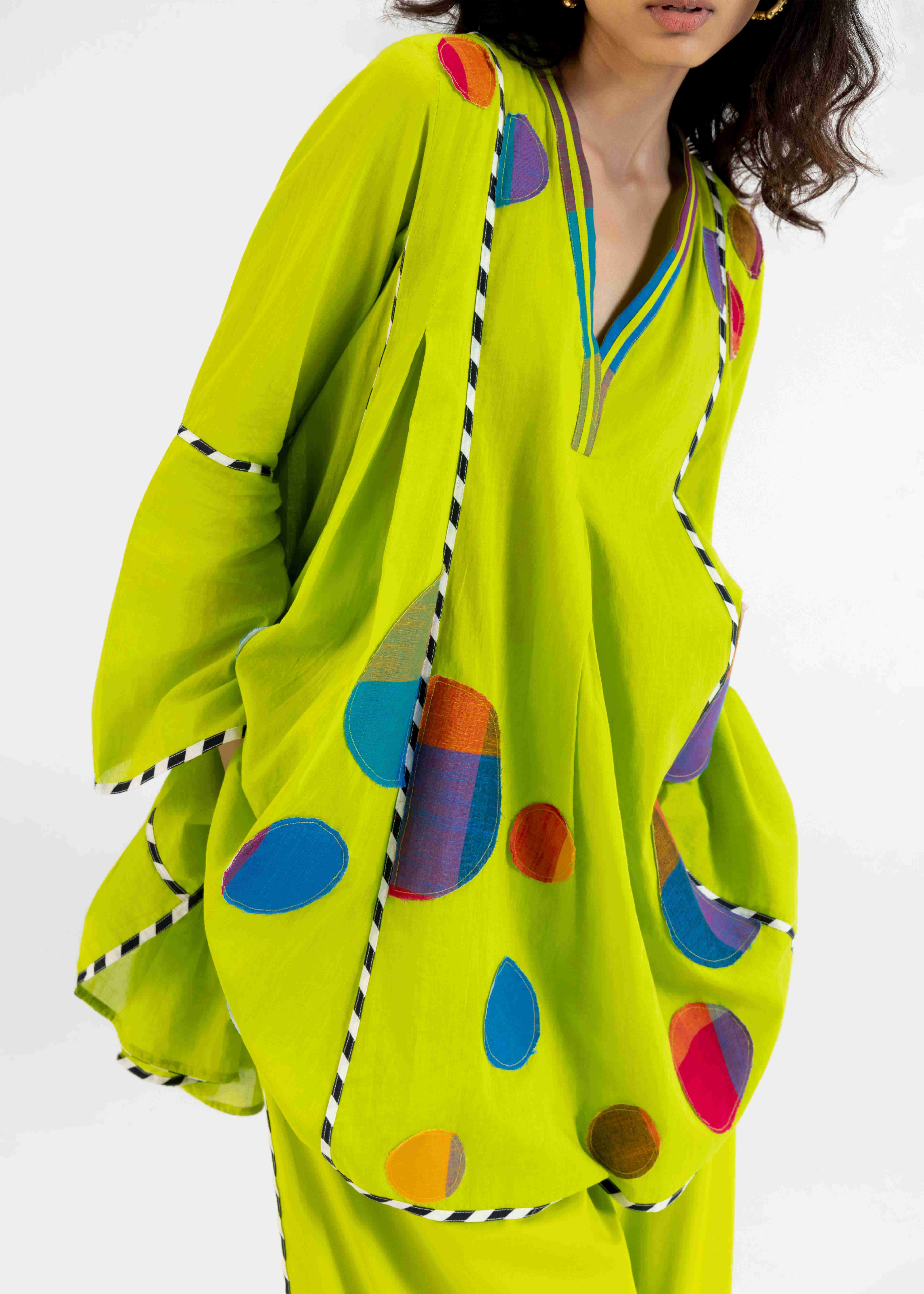 Lime Green Panel Tunic Crafted In Vibrant Hues, This Style Features Playful Multicolor Handloom Polka Applique, Highlighted With Monochrome Printed Piping Fluid Silhouette For Effortless Every Day Wear Style