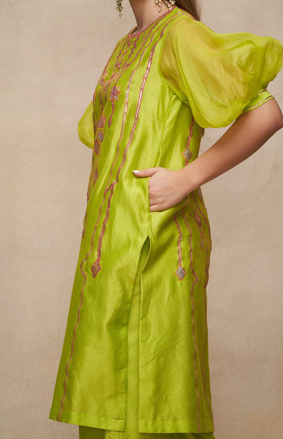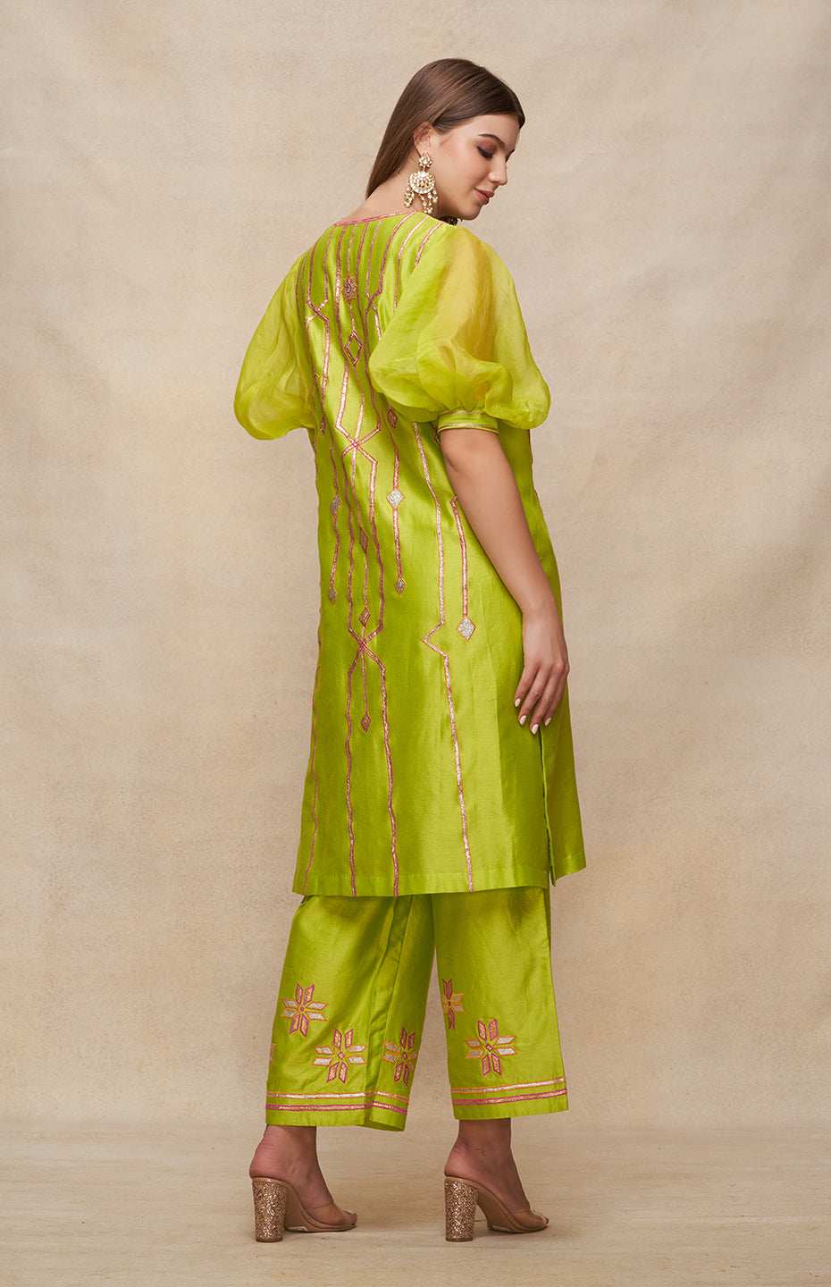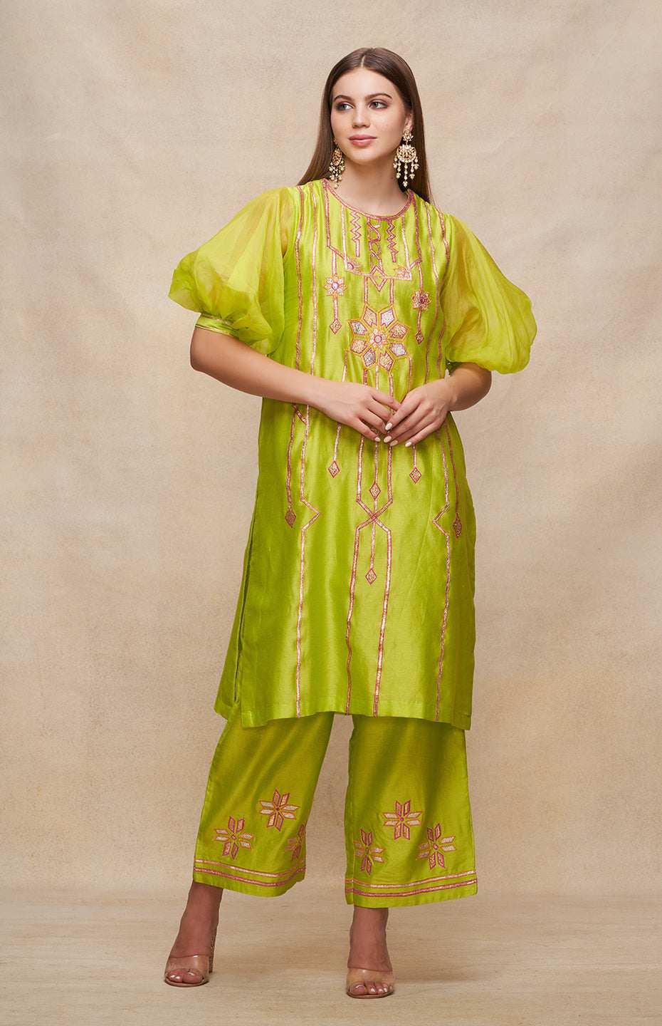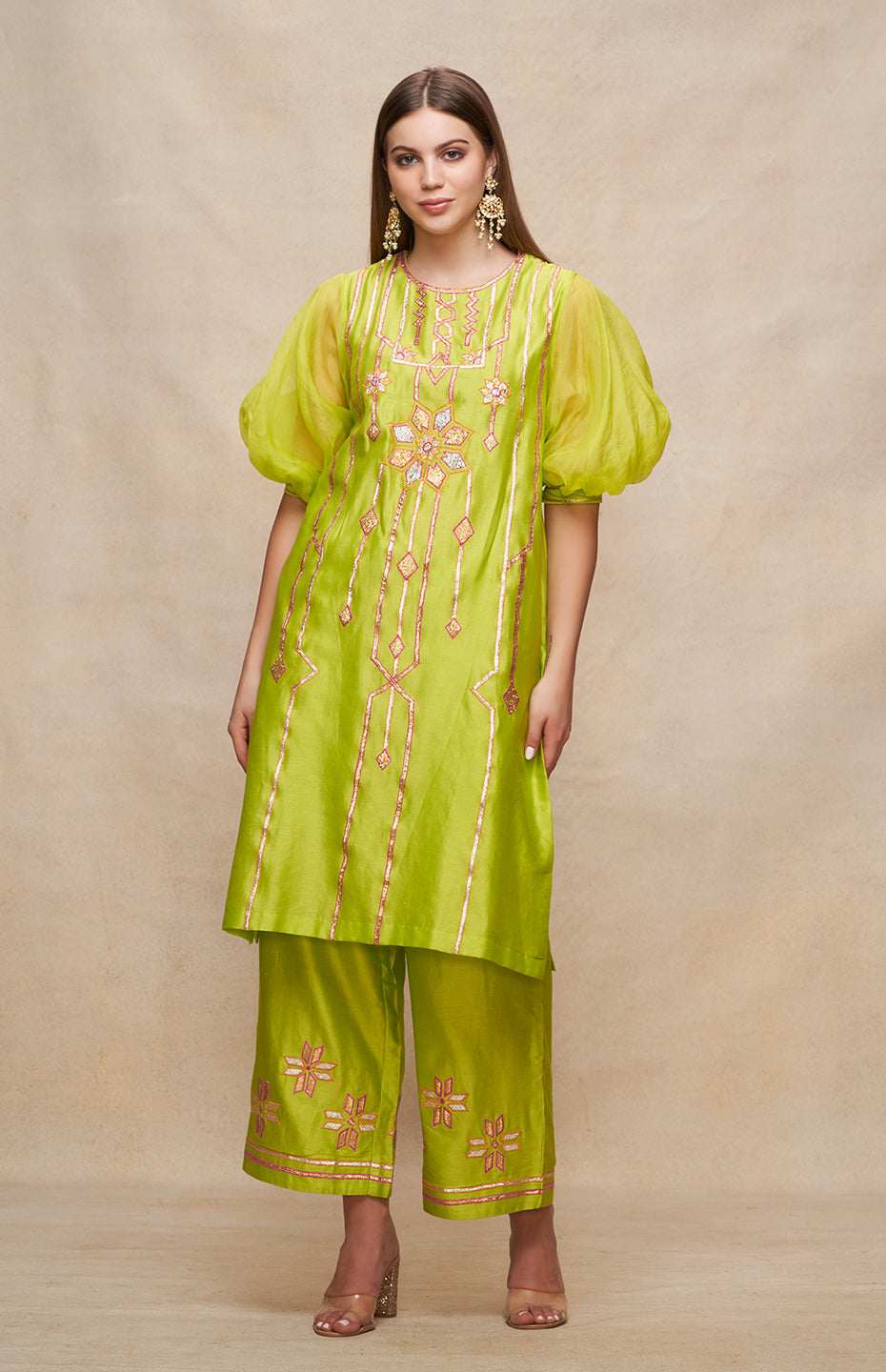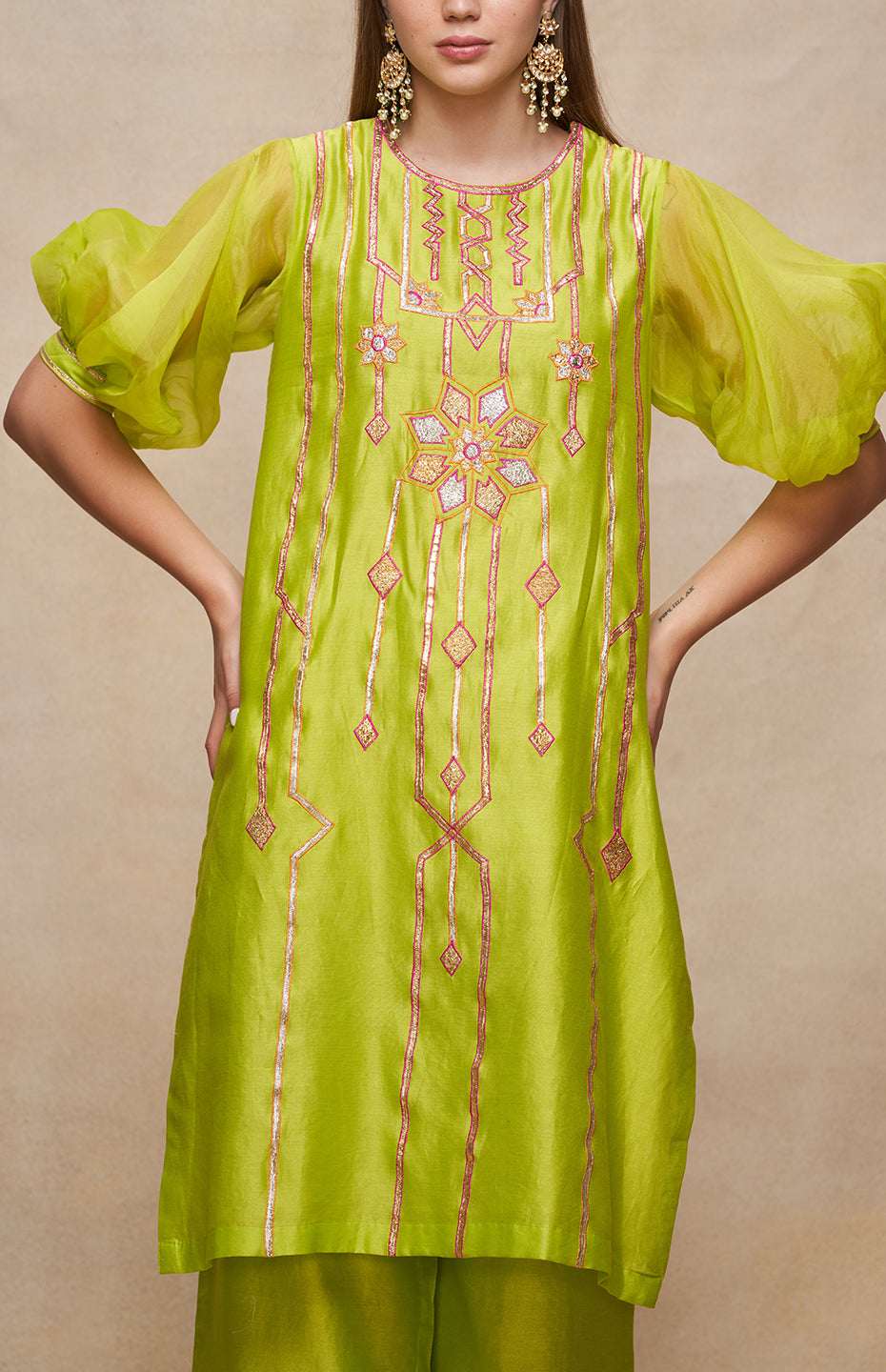 This fully gota embroidered kurta with organza puff sleeves is a mainstay for the festive season.
