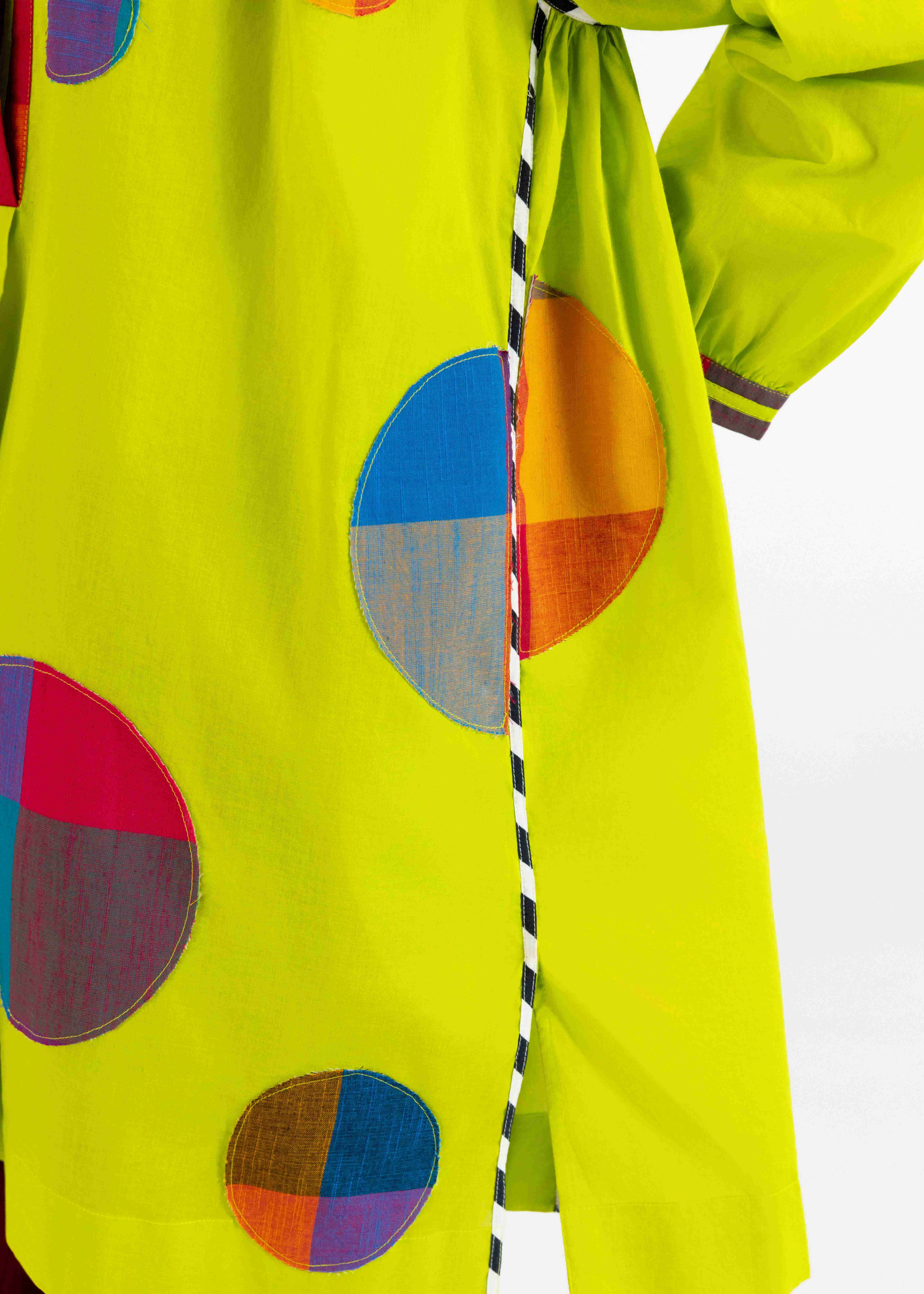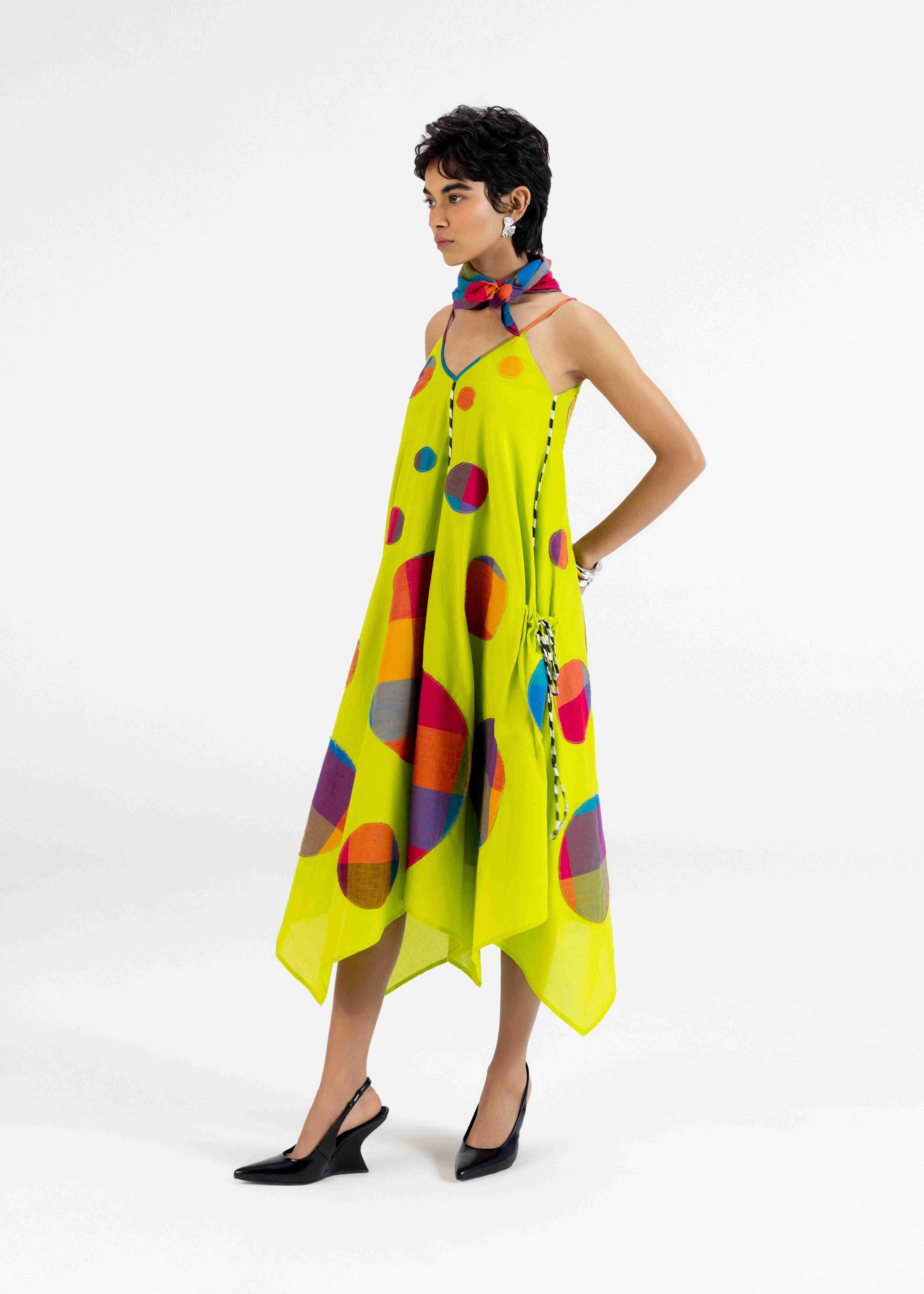 A Refreshing Lime Green Sun Dress Designed For Warm Days, This Style Features Playful Multicolour Polka Appliqué, Highlighted With Monochrome Printed Piping. Light, Comfortable And Effortlessly Chic For Casual Outings Or Holidays