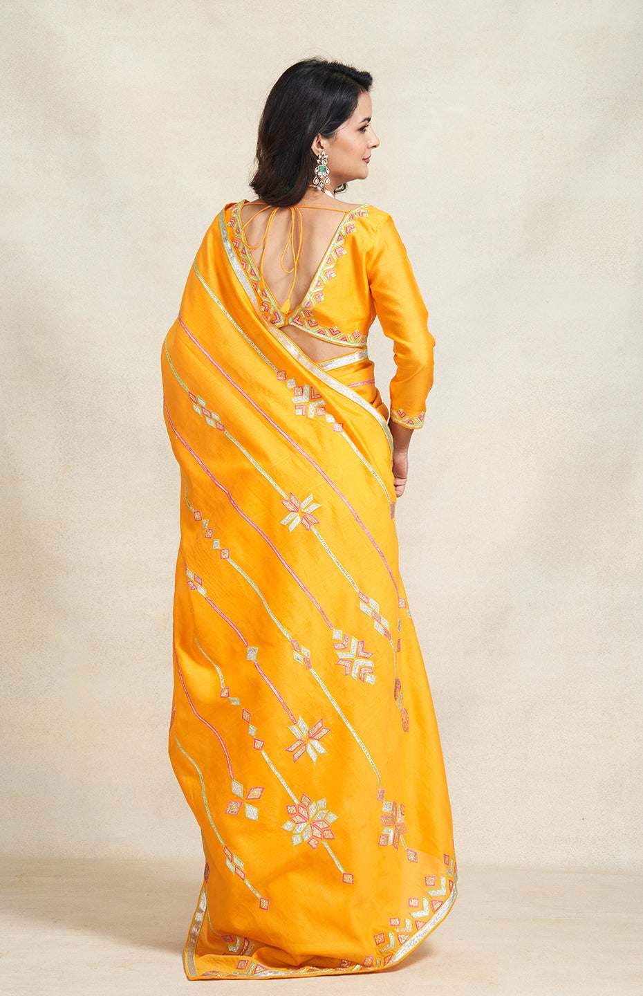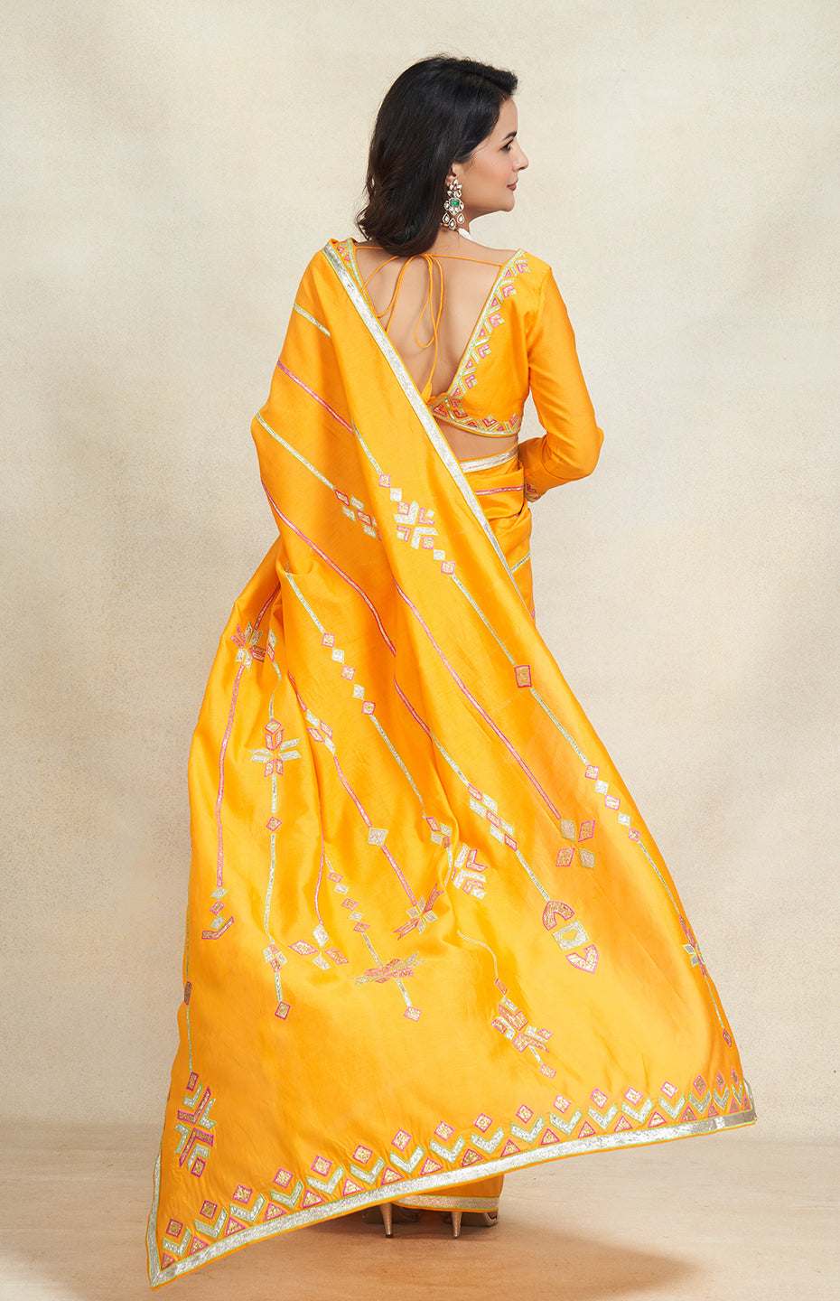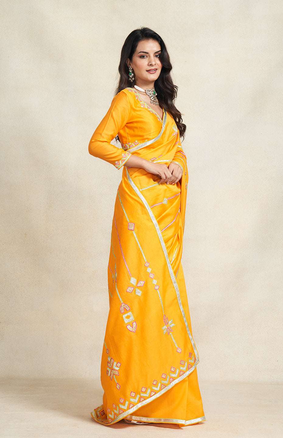 This is a must-have saree for the festive season. Beautiful gota and resham embroidery spanning the length of the saree's pallu.