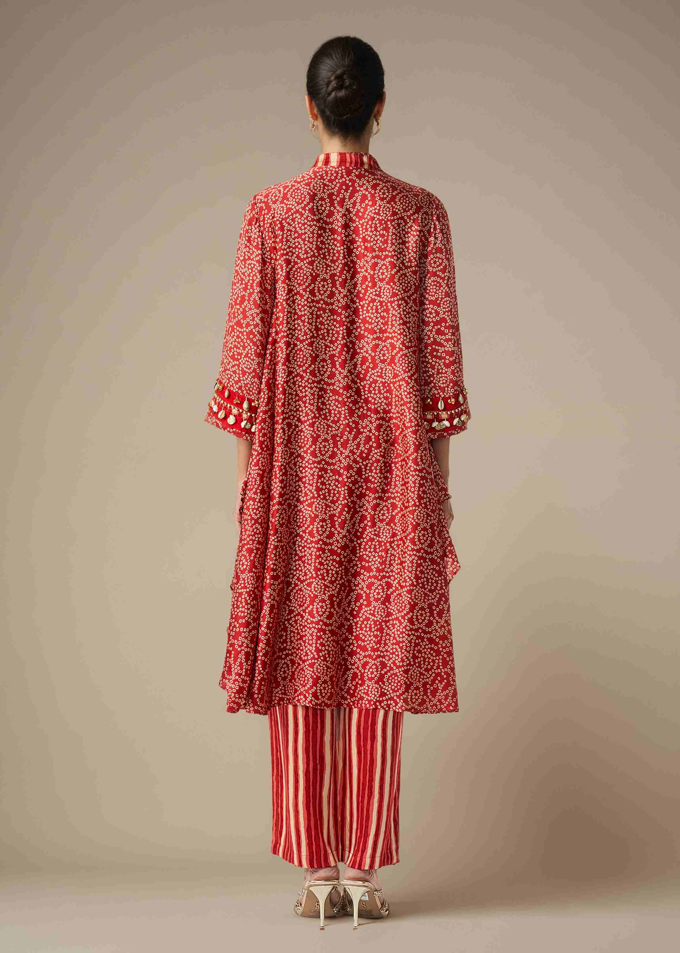 The D-shaped kurta is adorned with ghungroos, coins, and seashells, echoing the Boho Bandhani spirit. Its relaxed tailoring makes it ideal for long workdays or festive evenings.