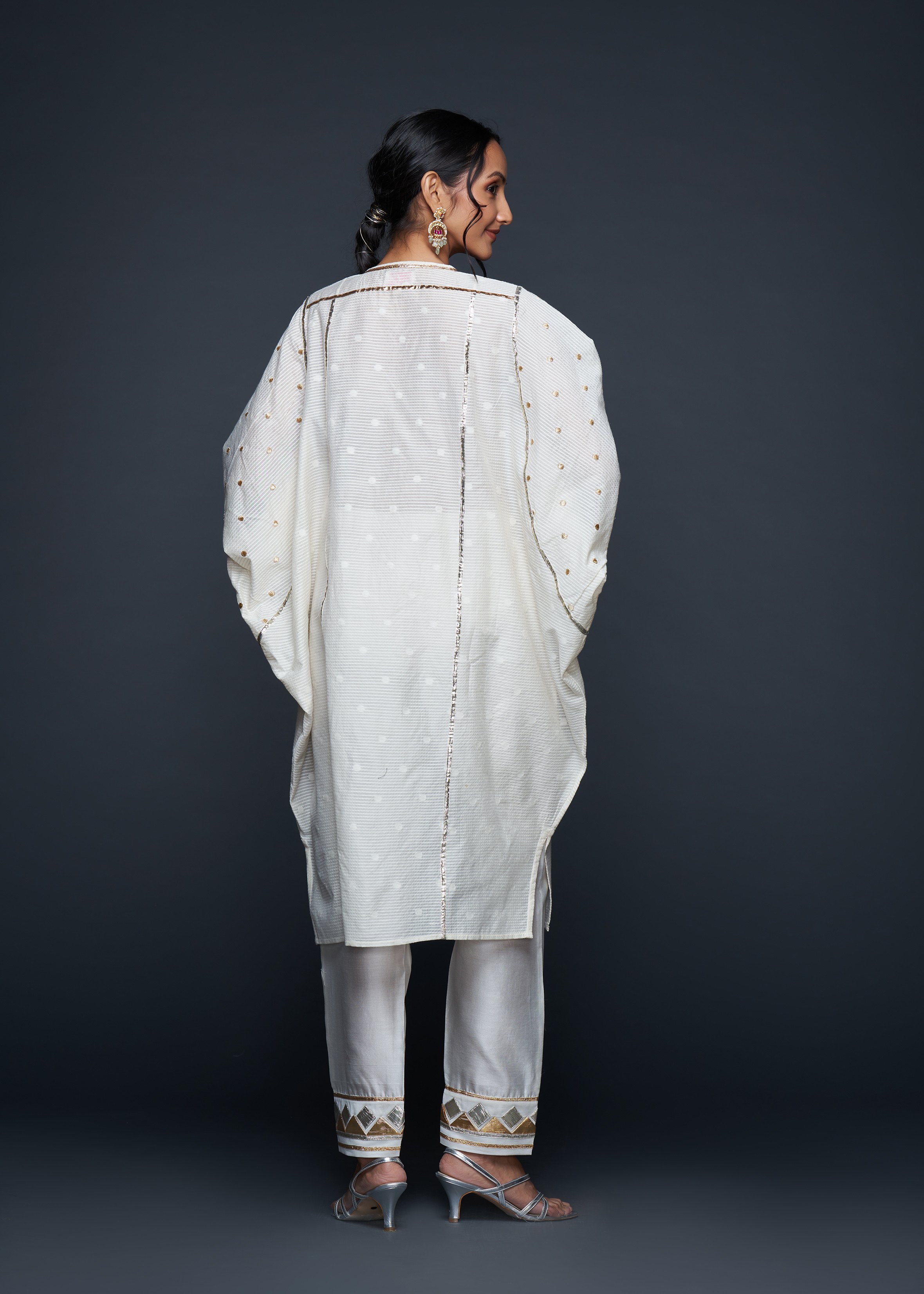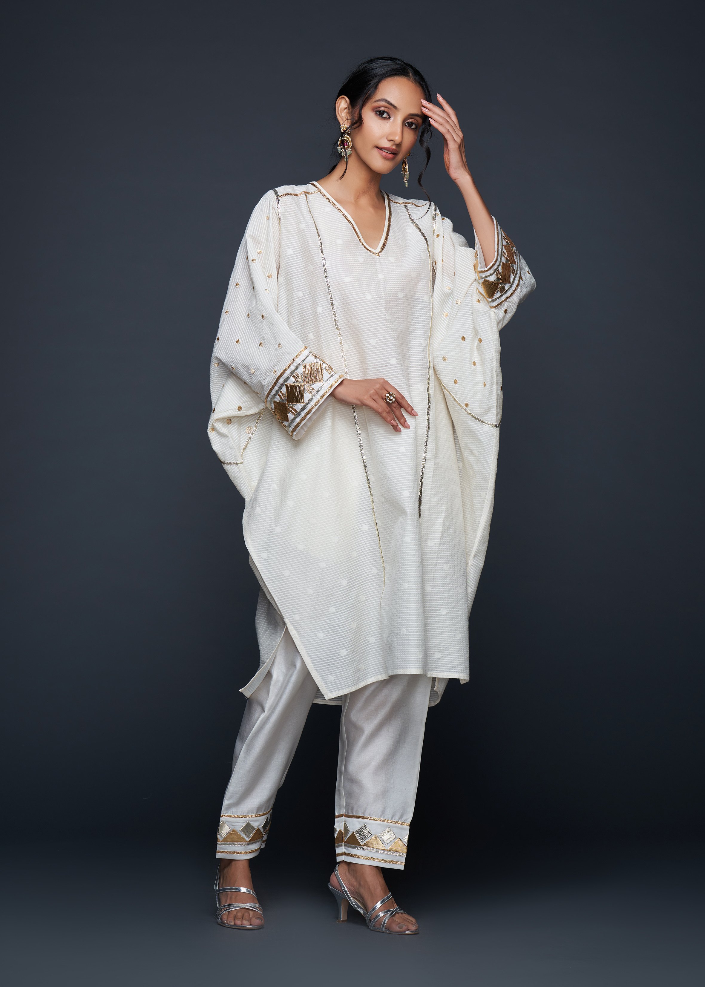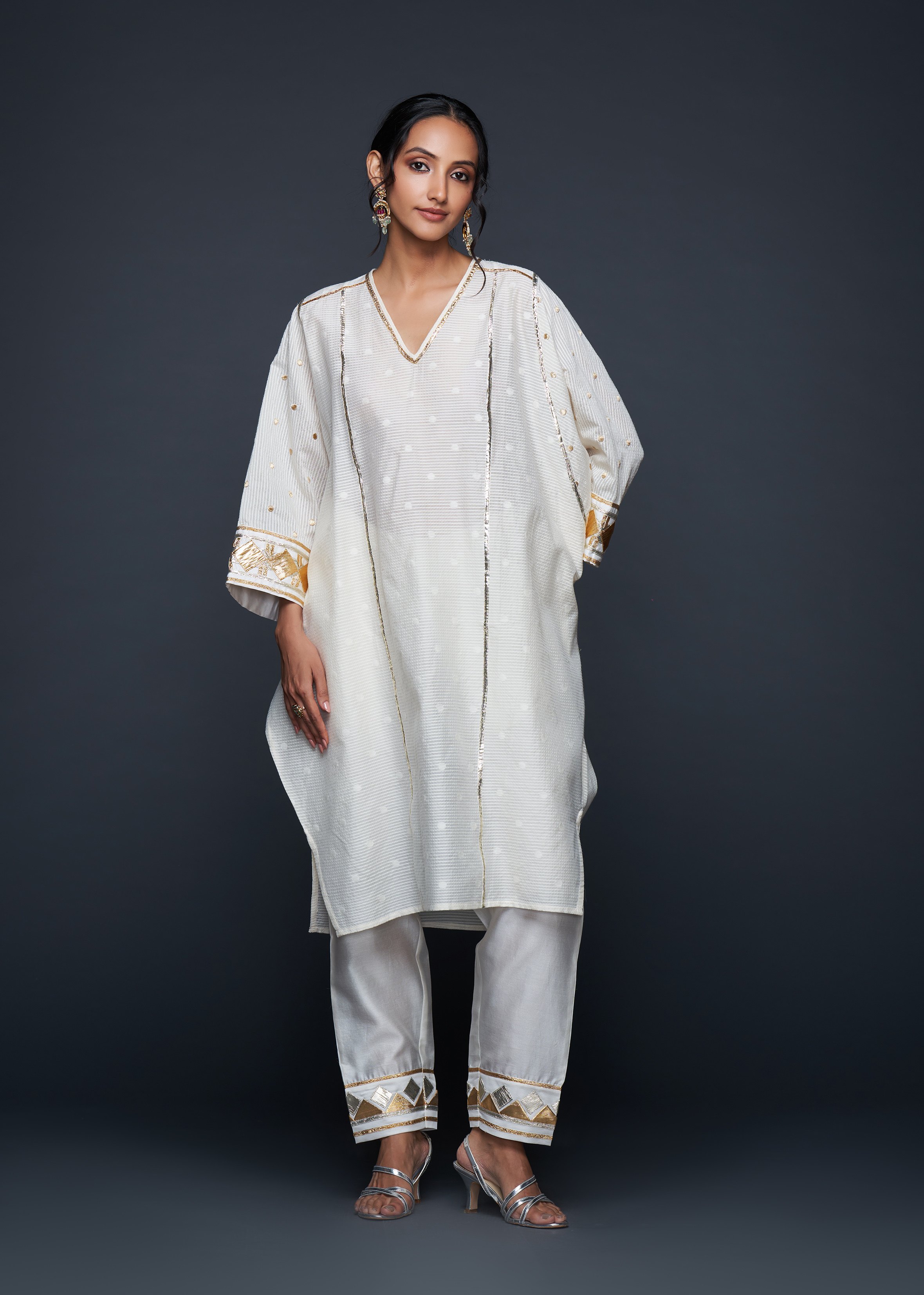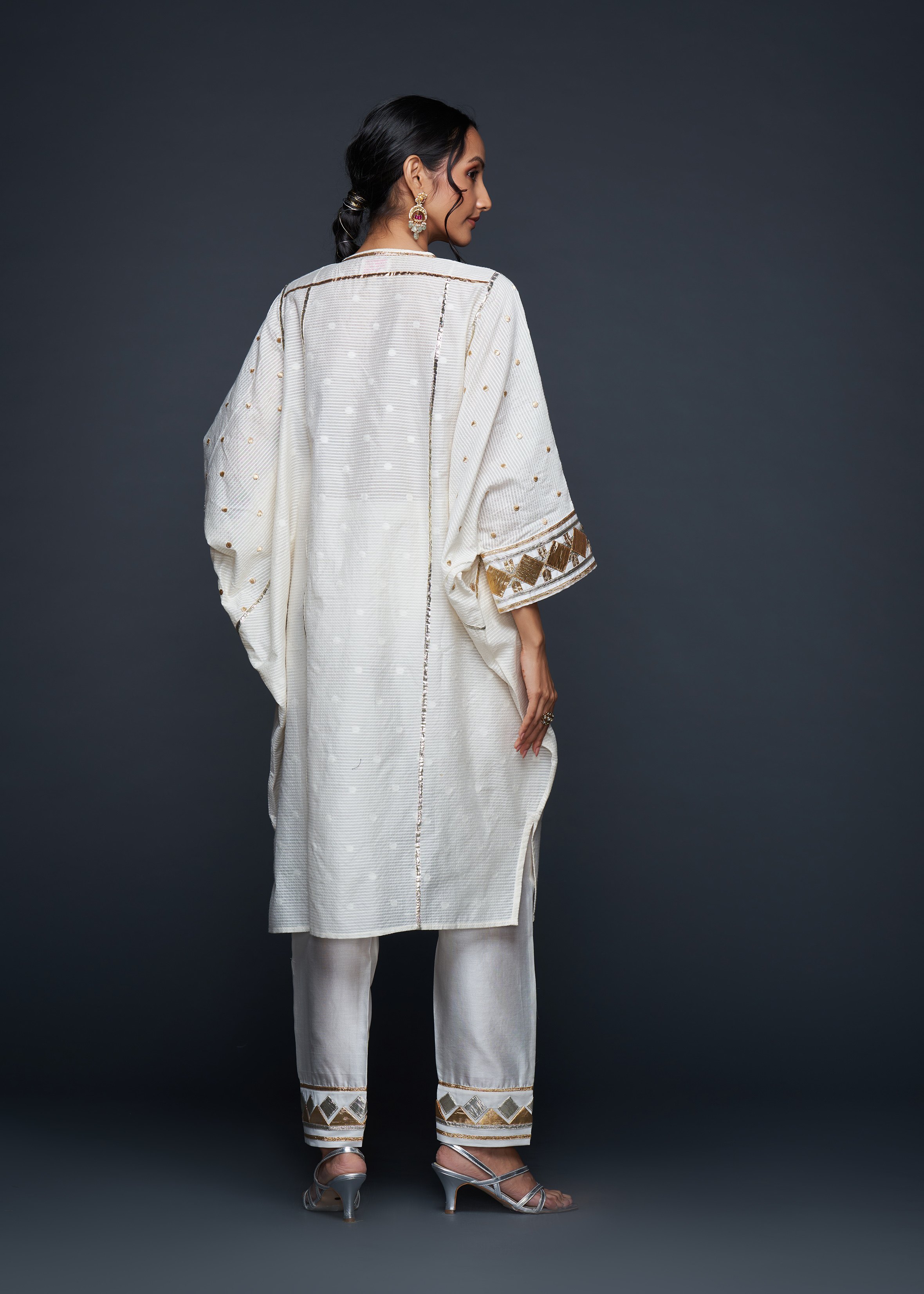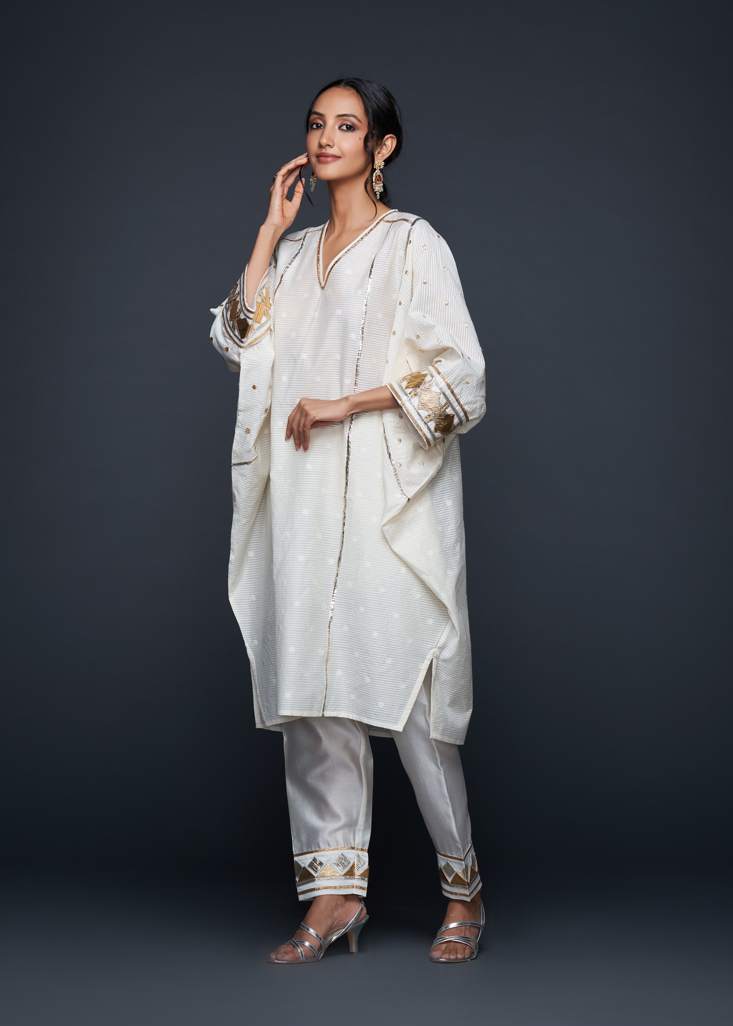 Our Kaftan, in luxurious Chanderi Jamdani, is a statement of effortless elegance. The gota mithai appliqués add a festive touch to the relaxed silhouette.