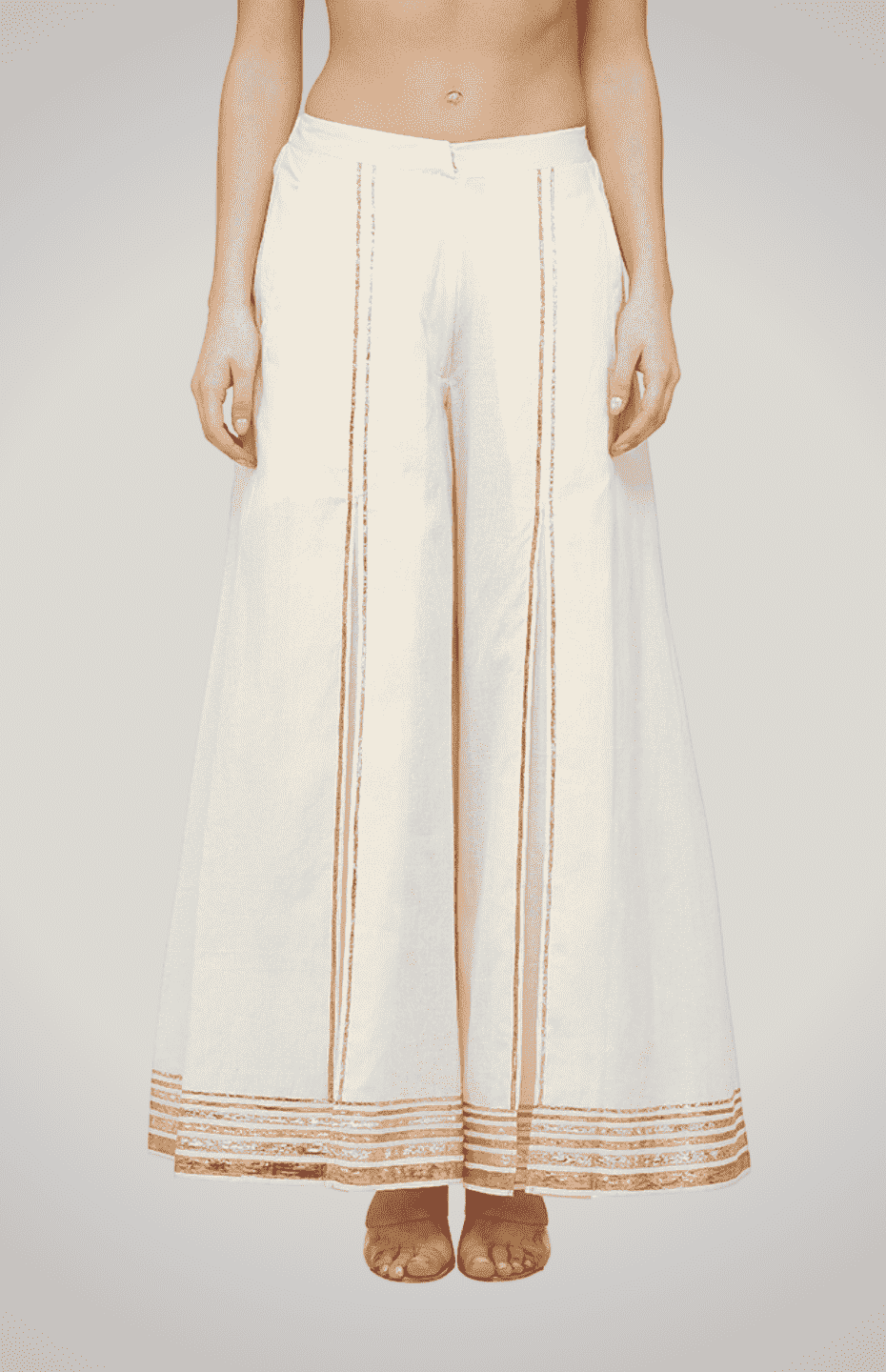 An off-white inverted go-dart flared palazzo with classic Abu Sandeep gota detailed hemline.