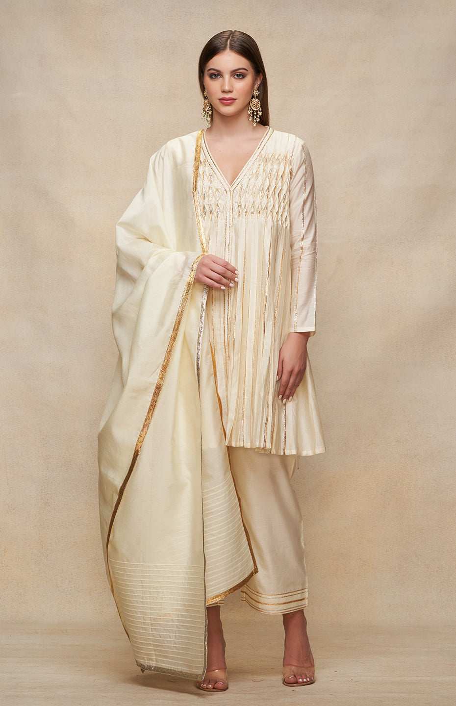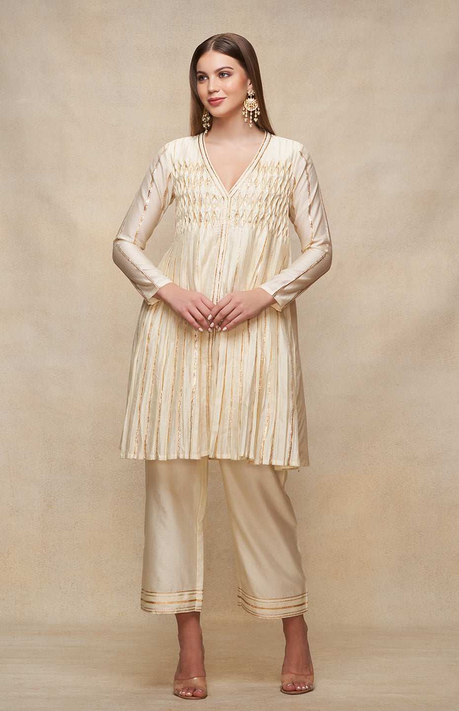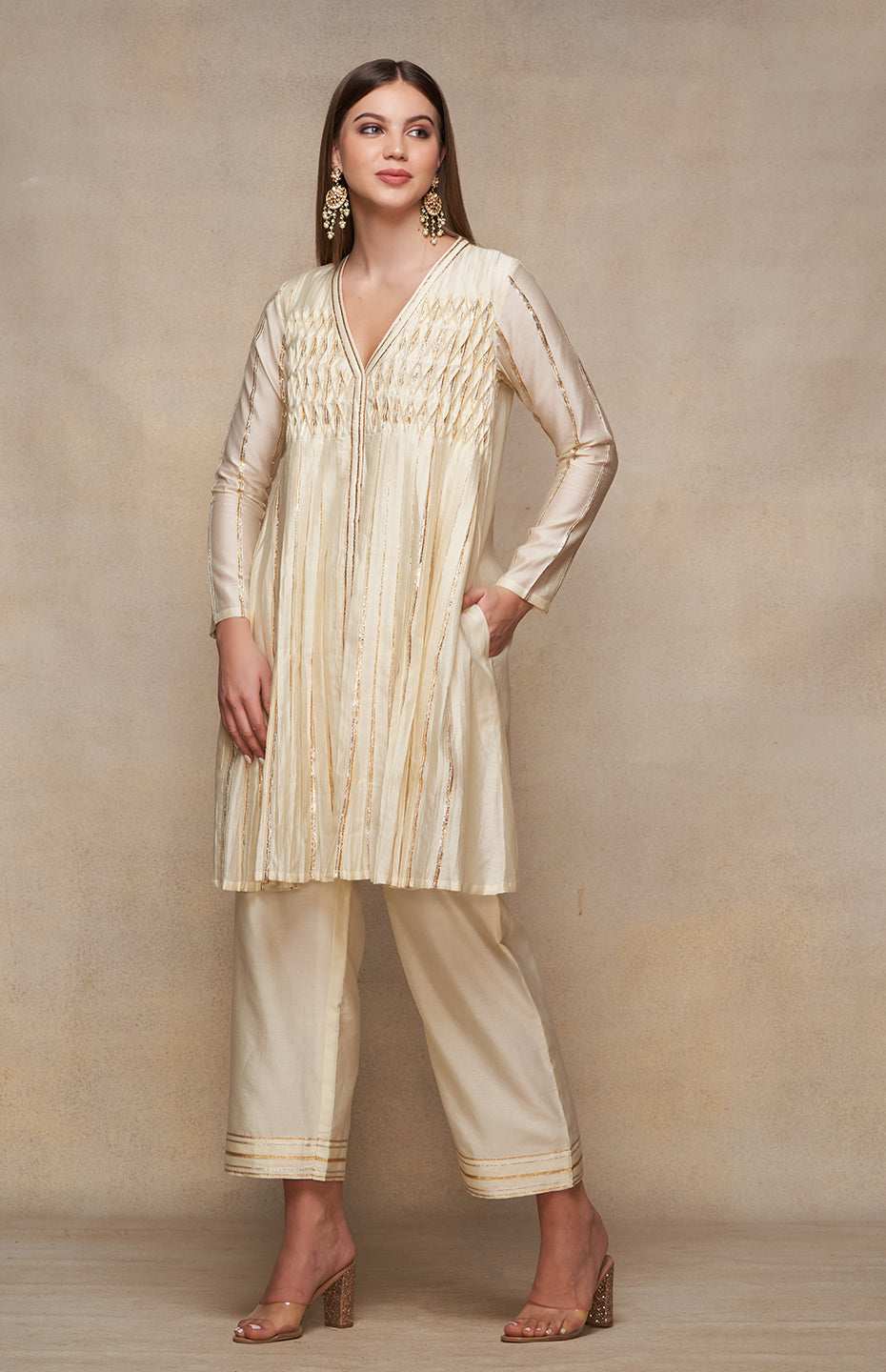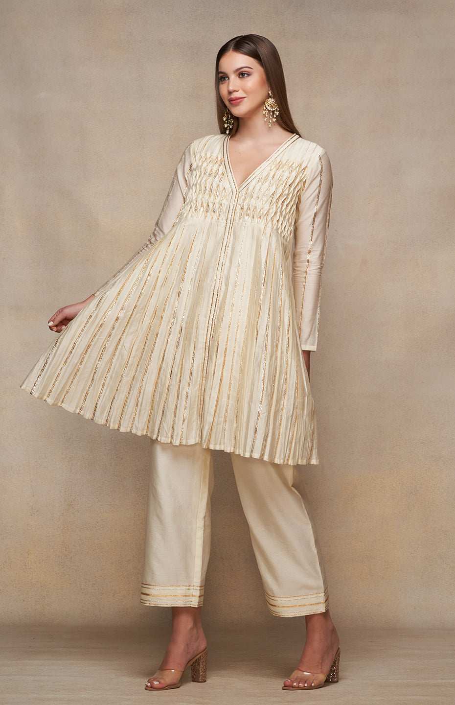 Elevate your style quotient with this deep V-neck, full-sleeved kurta dress. The knee-length silhouette boasts an ornate pleated Gota yoke, accentuating its charm. Best paired with straight pants, this dress is a nod to contemporary chic with a hint of tradition.