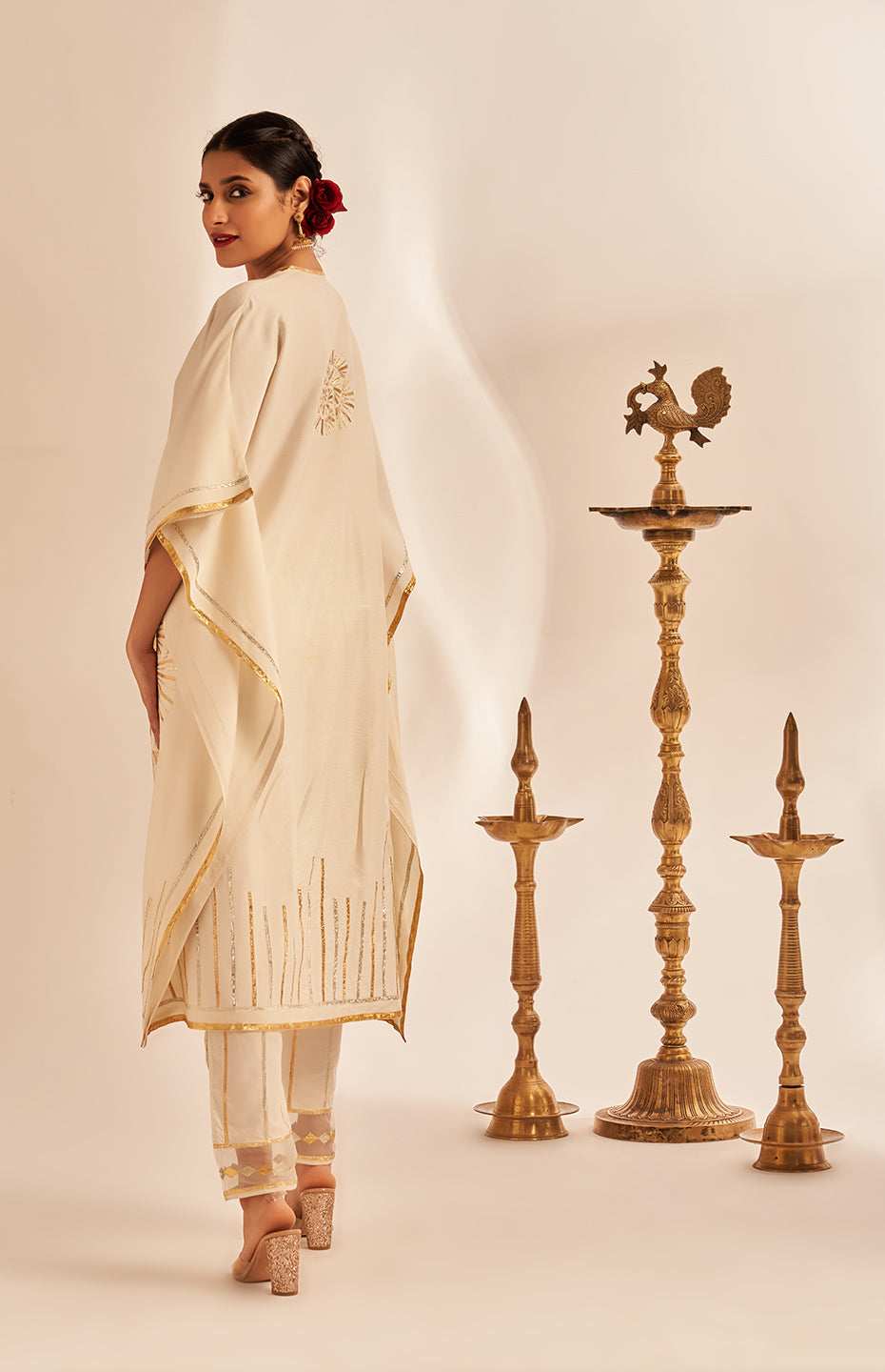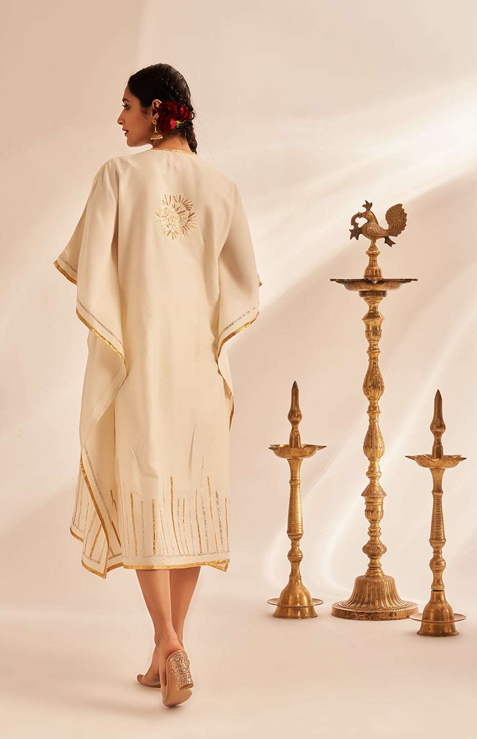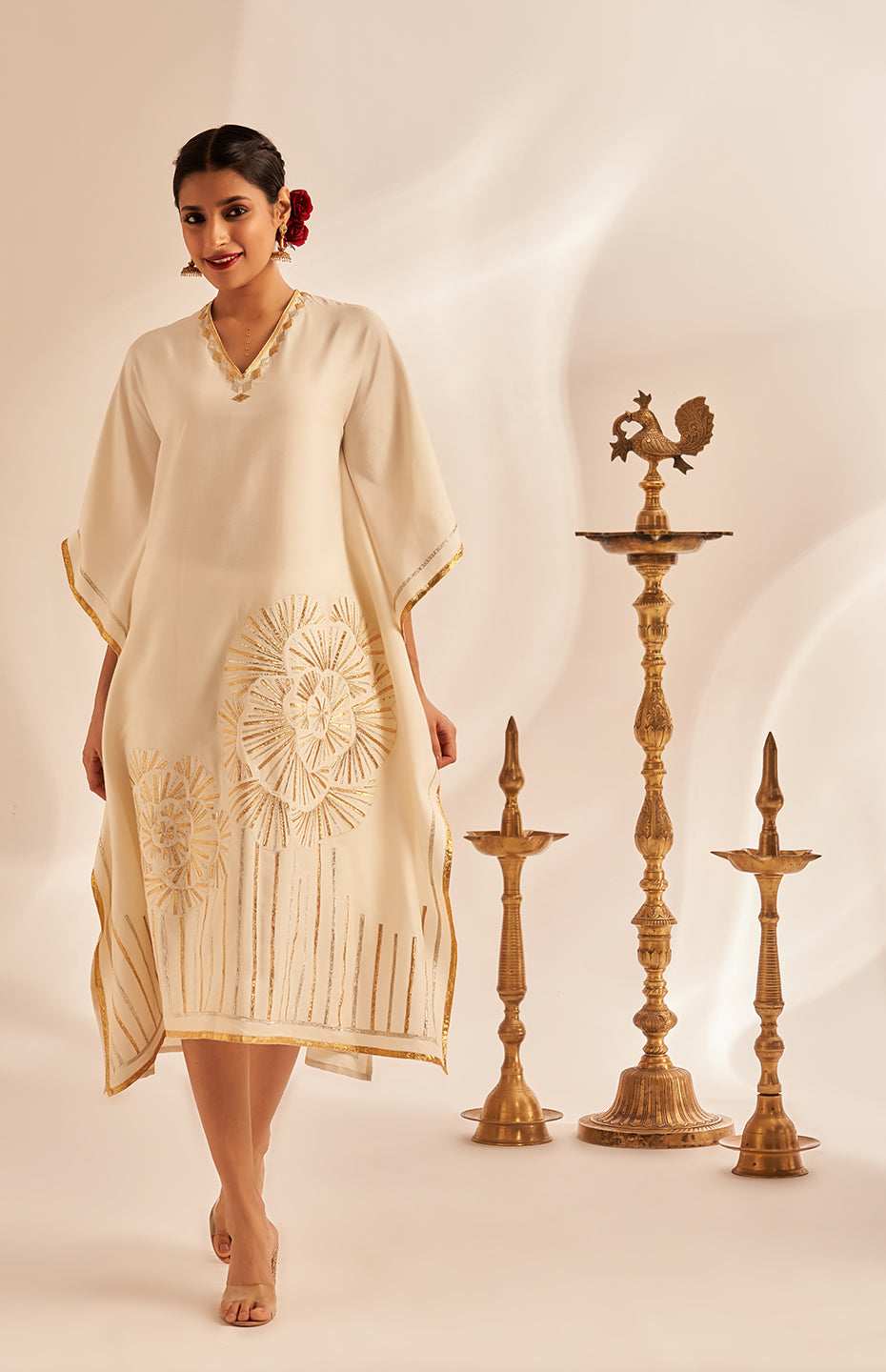Our Kaftan from the Rose Gota collection captures the glamour and comfort of flowy silhouettes and features a unique take on the classic Gota detailing.