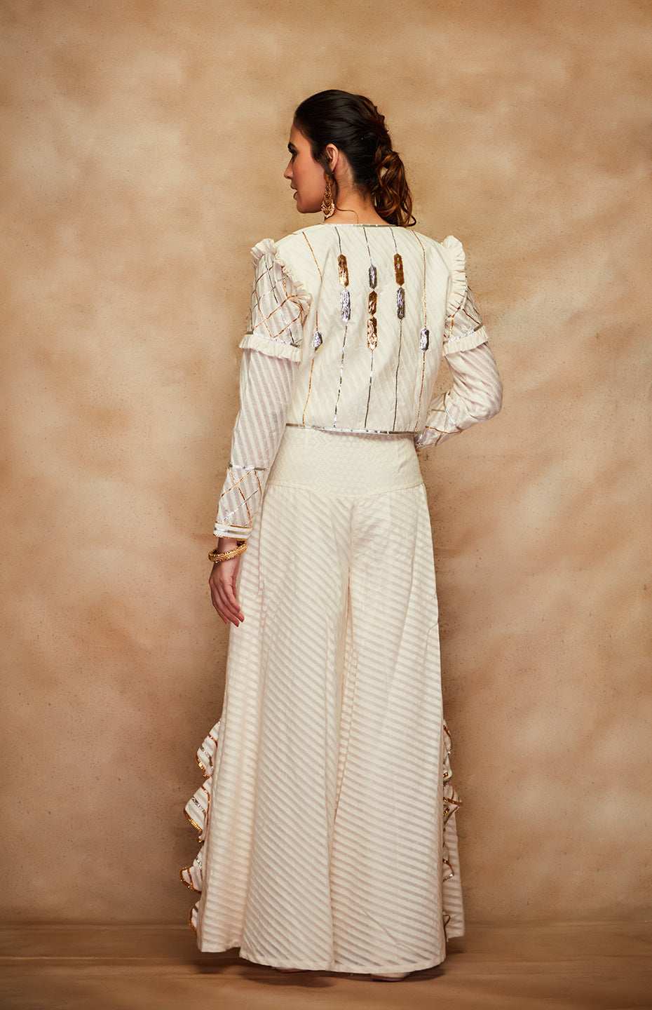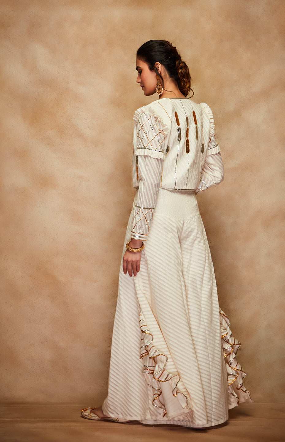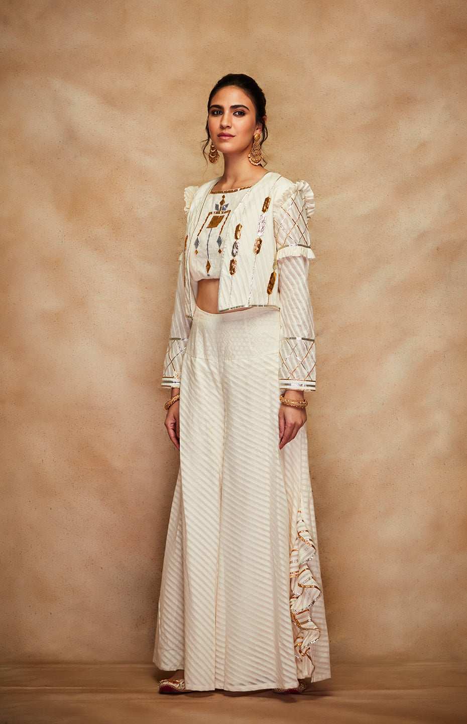 Front open short jacket with a jaal design made of gota and ruffle detail on the sleeves