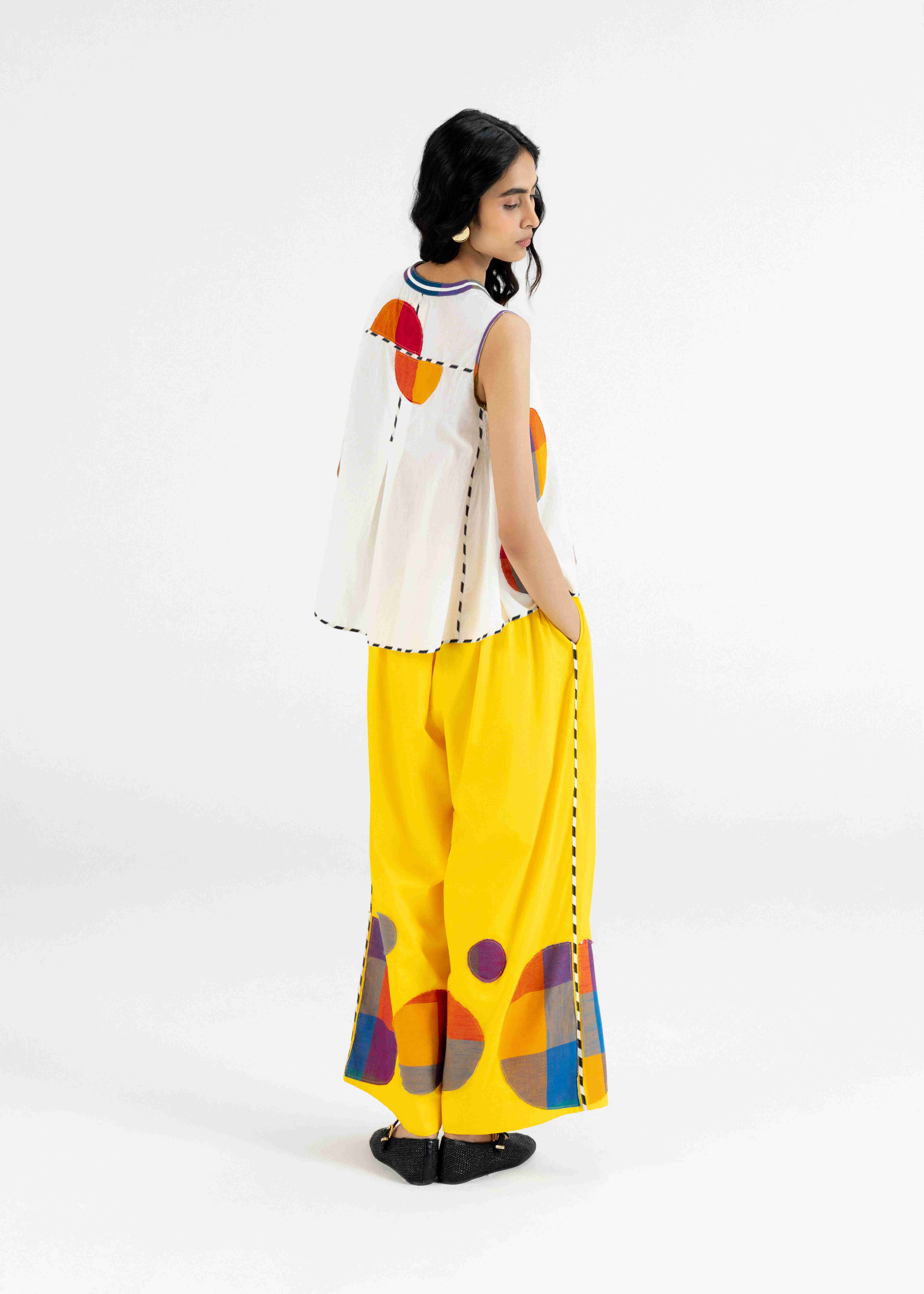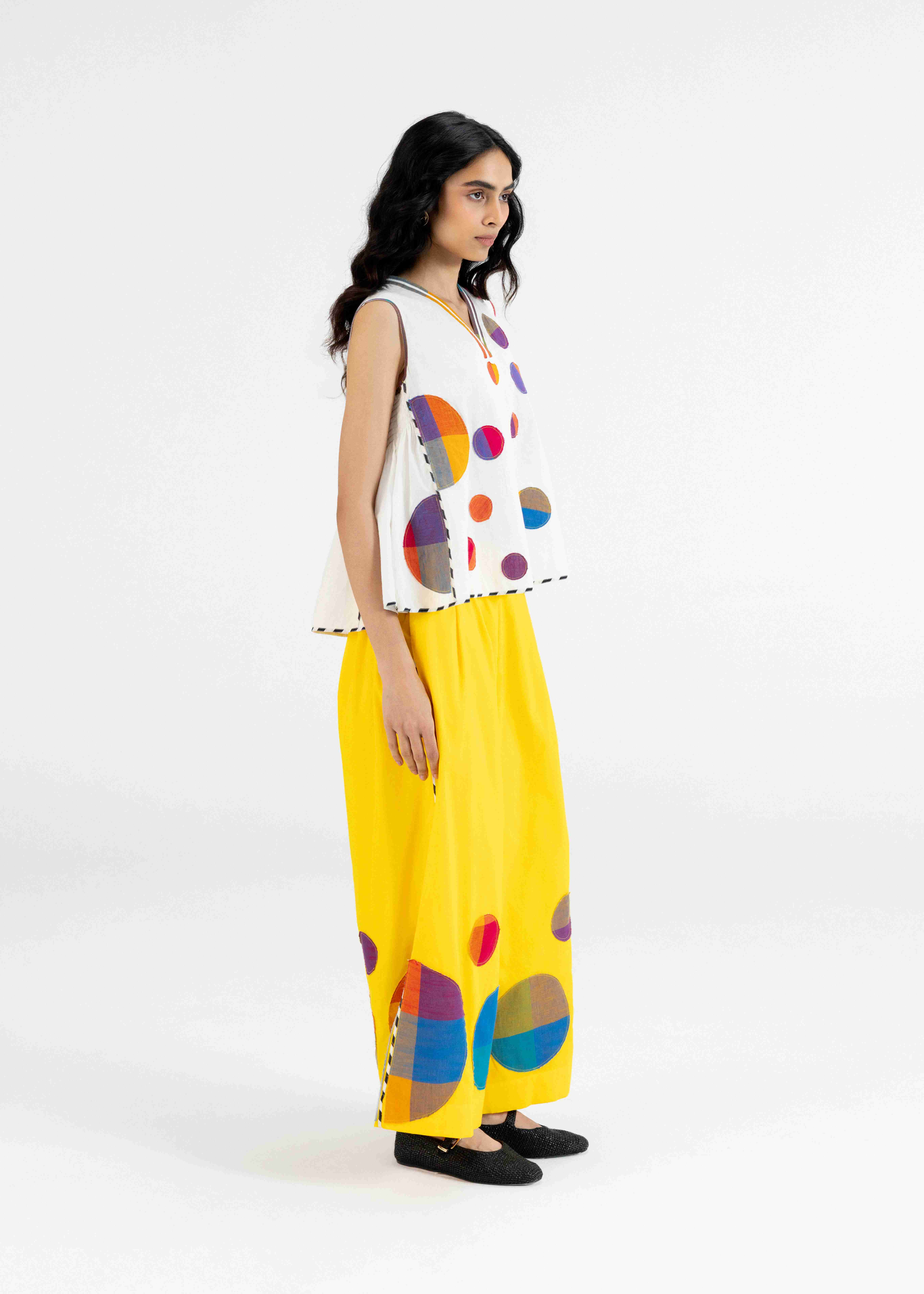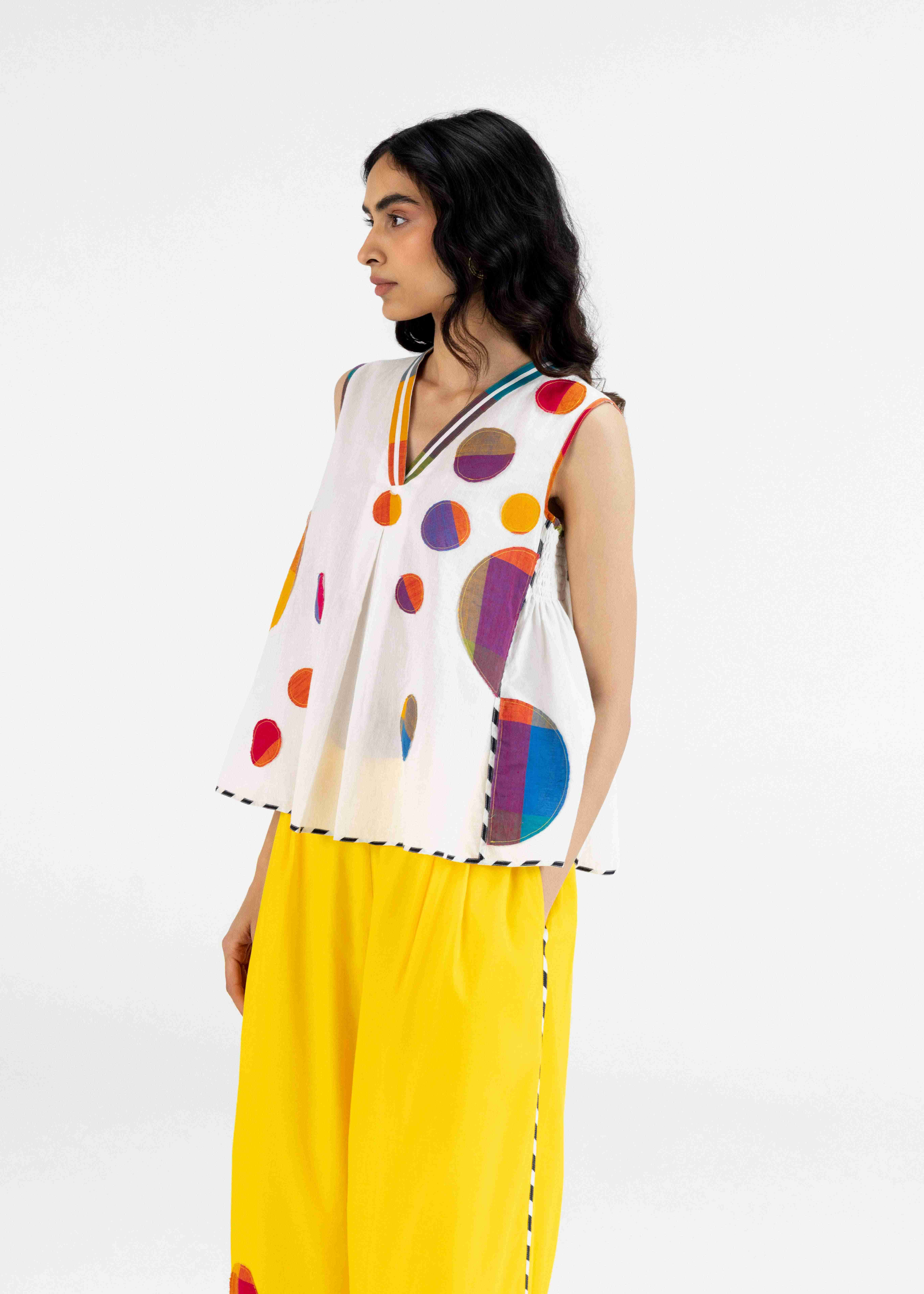 A Stylish Off White Sleeveless Smock Detail Top Designed With Multicolour Polka Appliqué And Monochrome Printed Piping Detail For A Playful, Comfortable And Chic Look