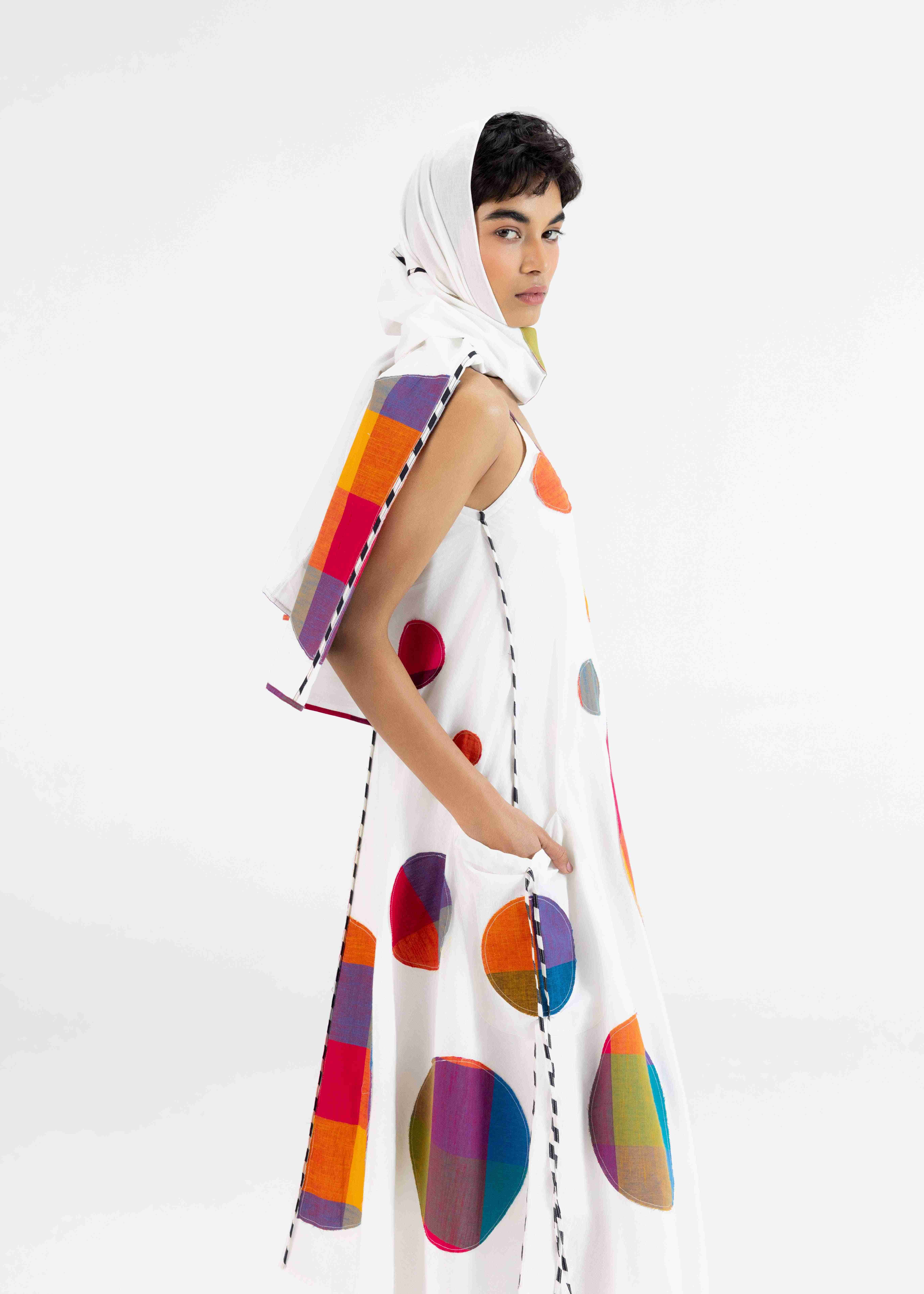 A Versatile Off White Stole Crafted To Compliment Both Casual And Evening Outfits, Featuring Multicolour Polka Appliqué With Monochrome Printed Piping That Enhance Modern And Playful Touch To Any Ensemble