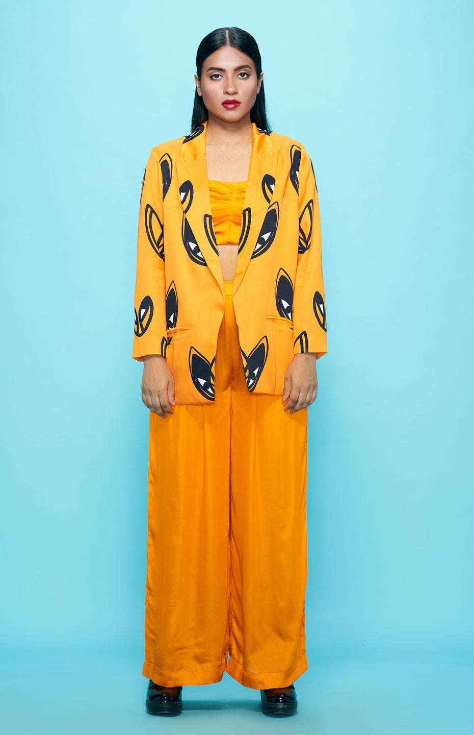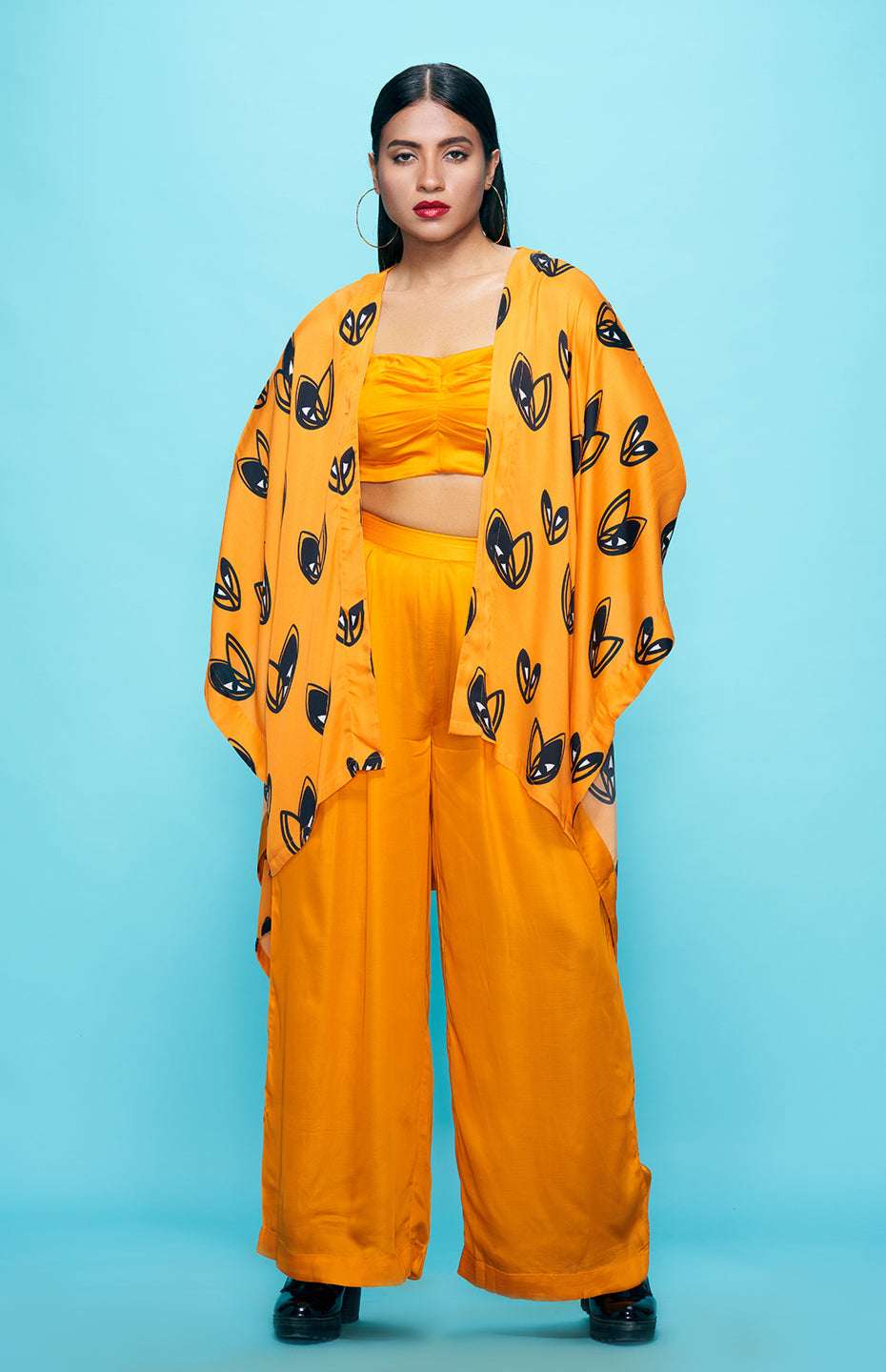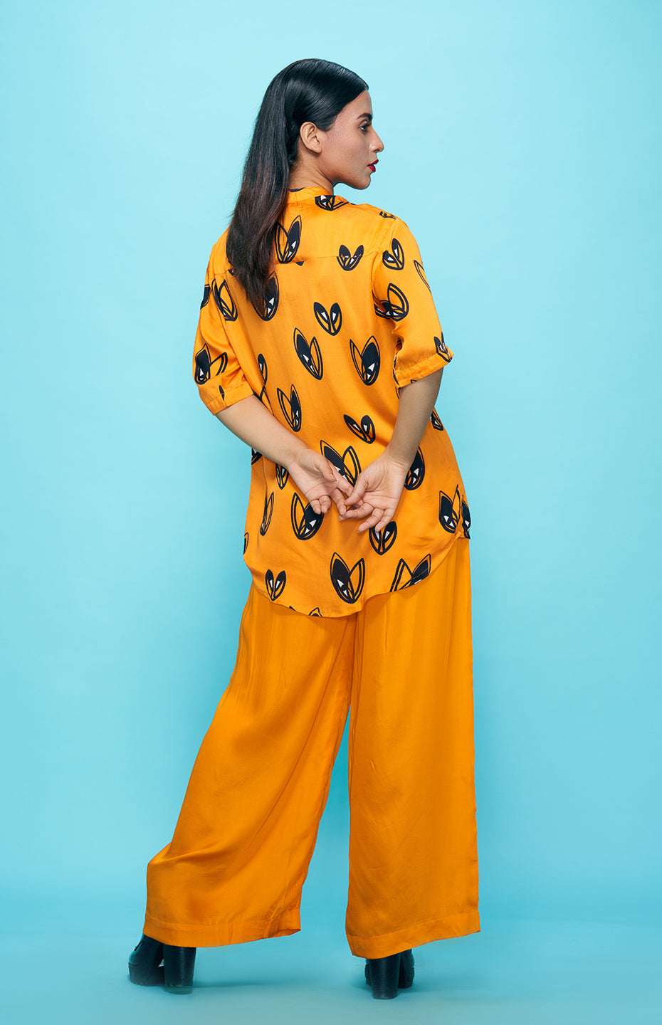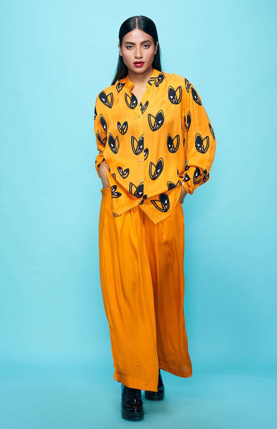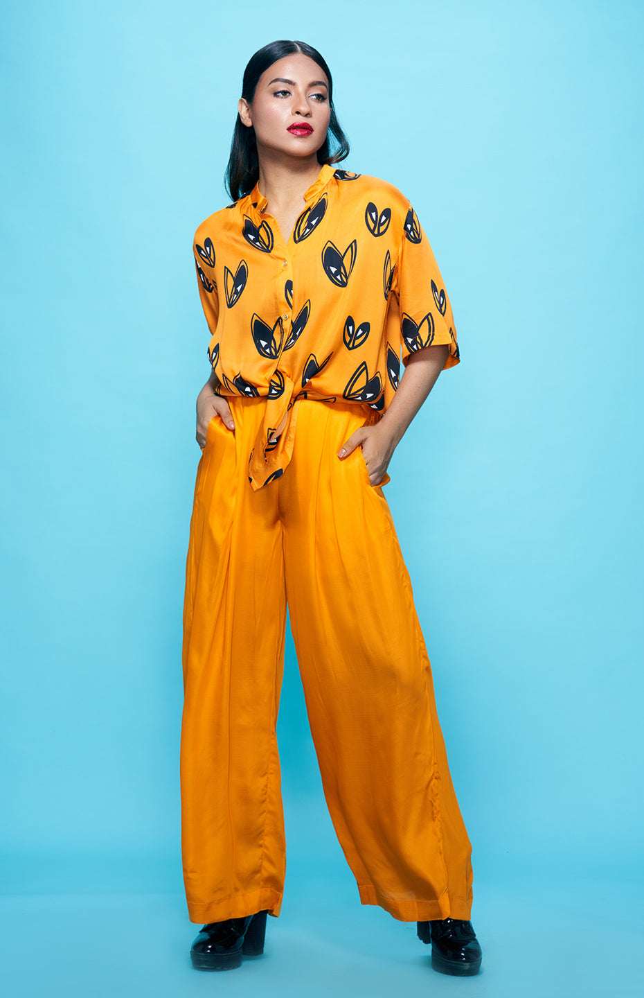 Complete your Pop Hearts look with these stylish and comfortable high-waisted pants. Made from the same luxurious Viscose Satin fabric as the rest of the collection, these pants offer a break from the playful heart motif while still maintaining the collection's overall aesthetic. The high-waisted design and flowy silhouette make these pants comfortable and versatile, perfect for dressing up or down.