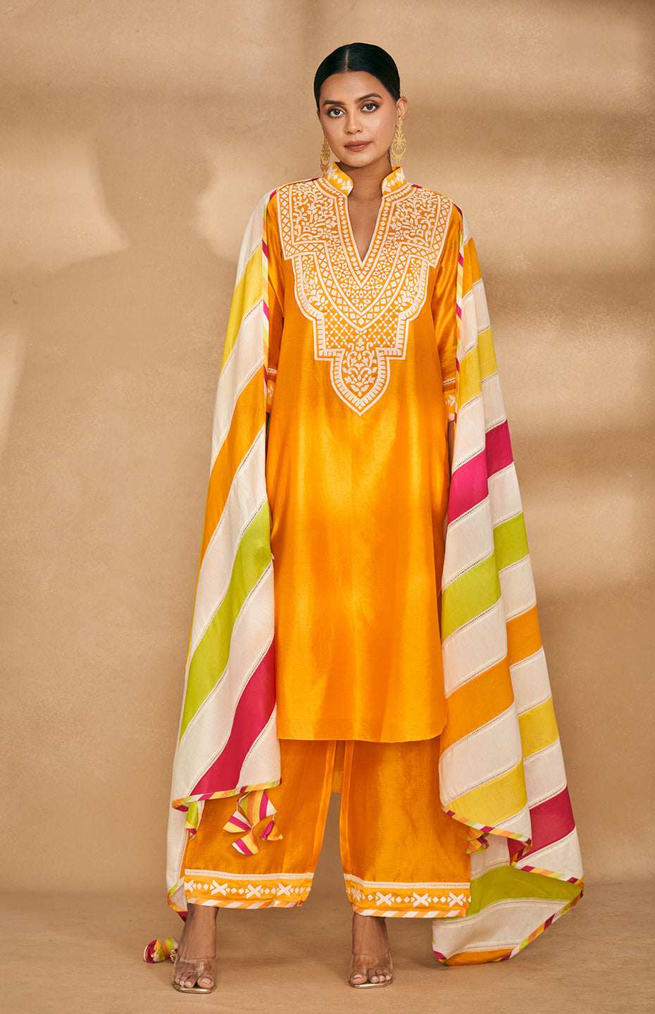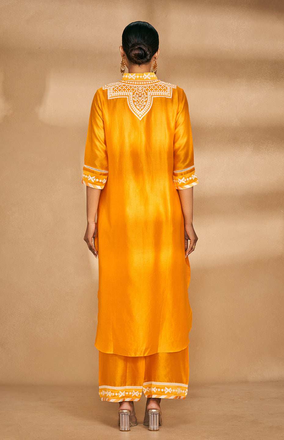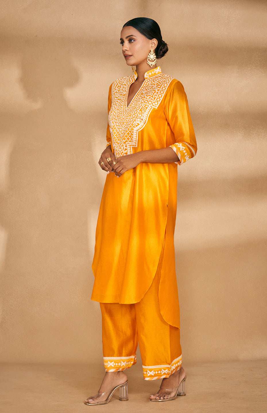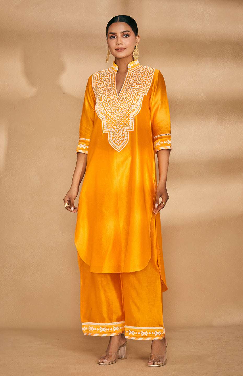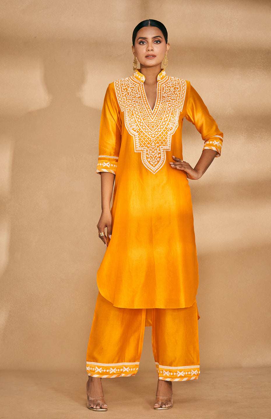 Our Collared Kurta, adorned with intricate appliqué work on the yoke, offers a fusion of tradition and contemporary style. This kurta is lined in mul around the bodice. You can choose to pair this with our bottoms, stoles.