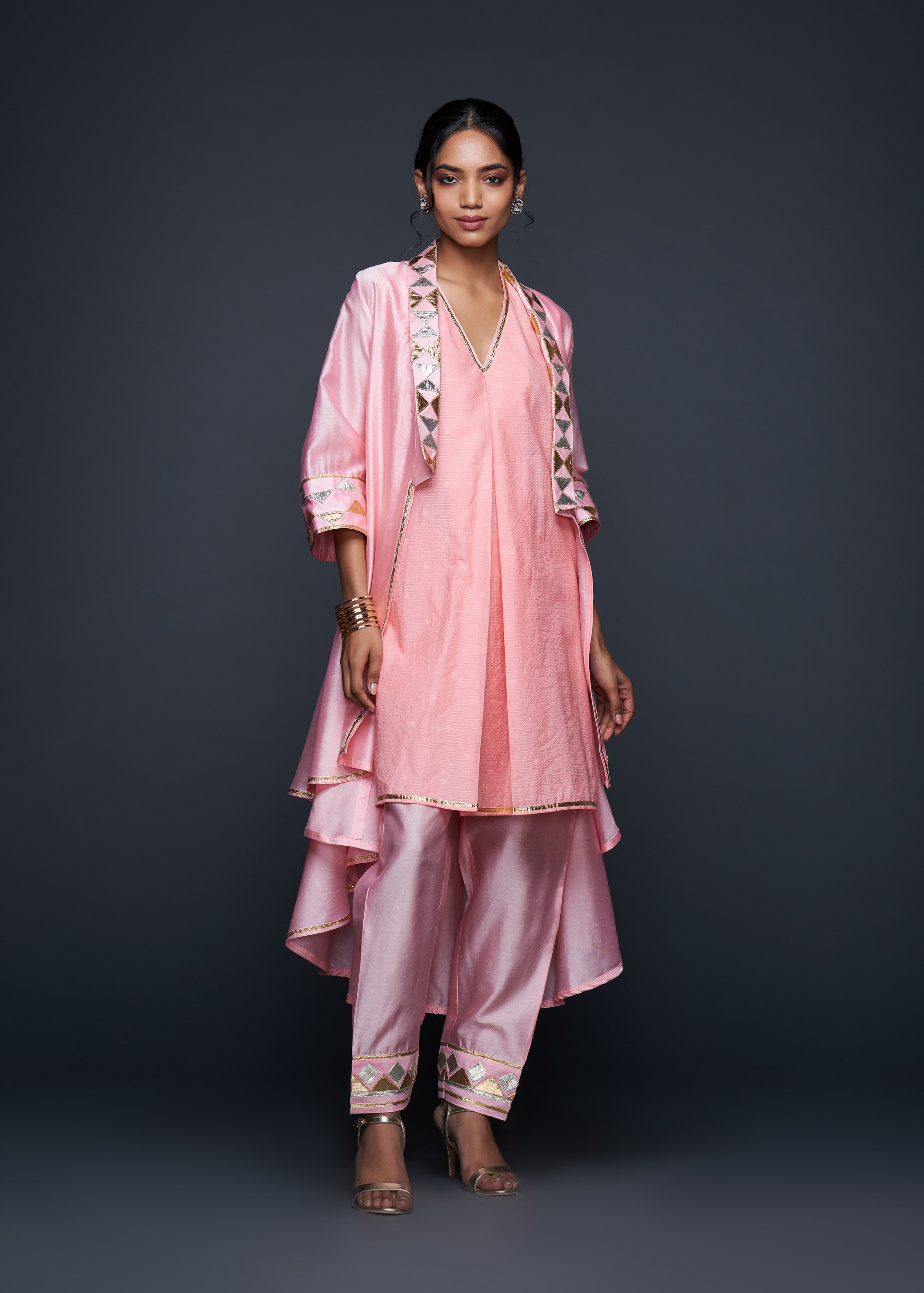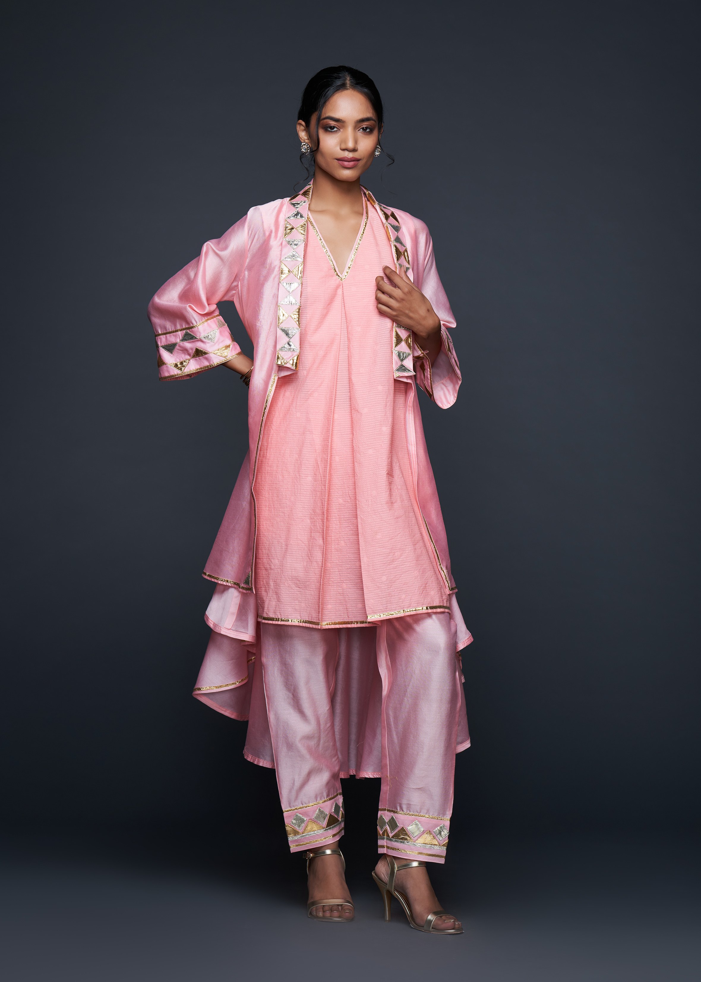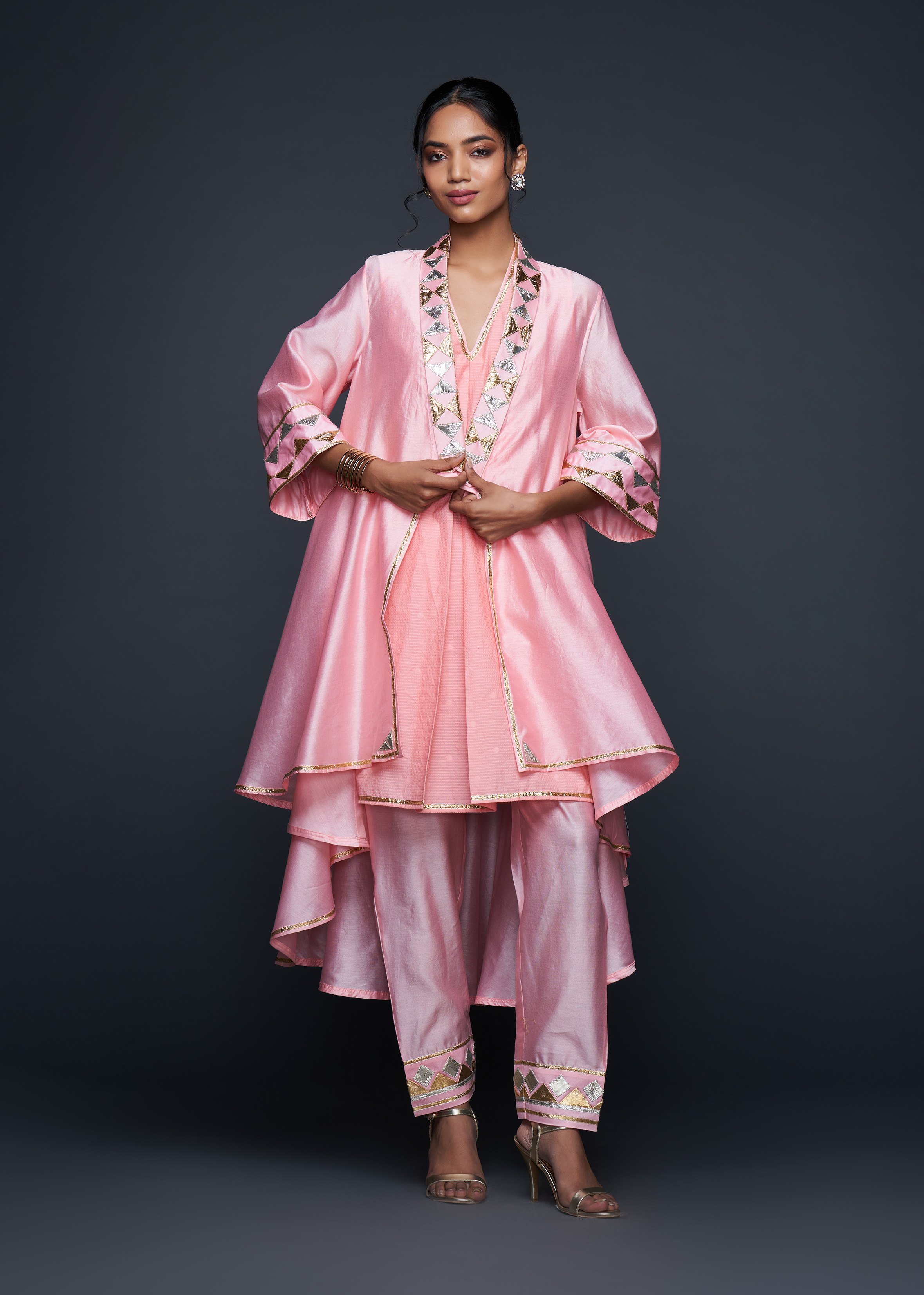 This Coat Set, including an inner slip, represents the pinnacle of layered elegance. The gota appliqués offer a contemporary twist on traditional attire.