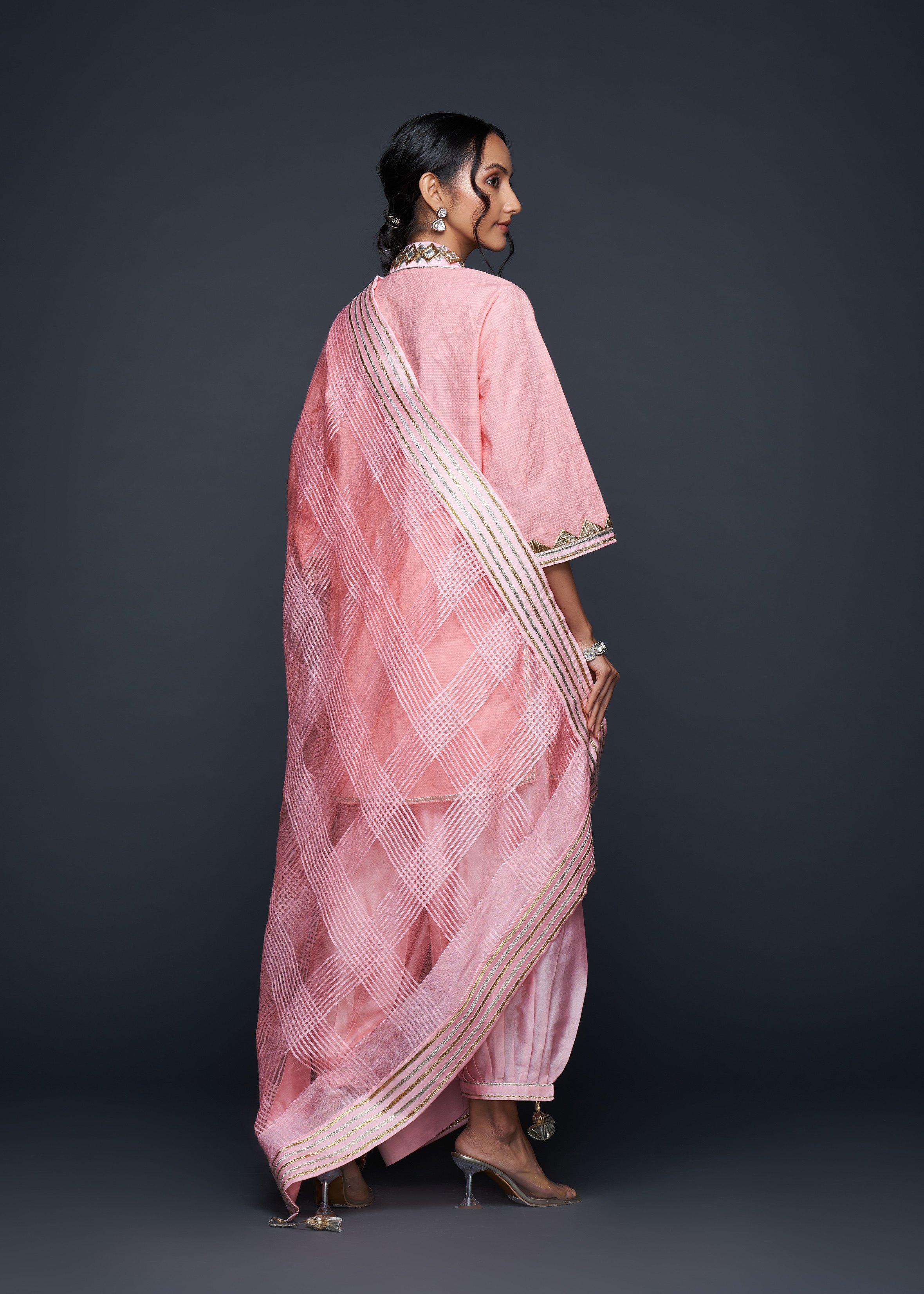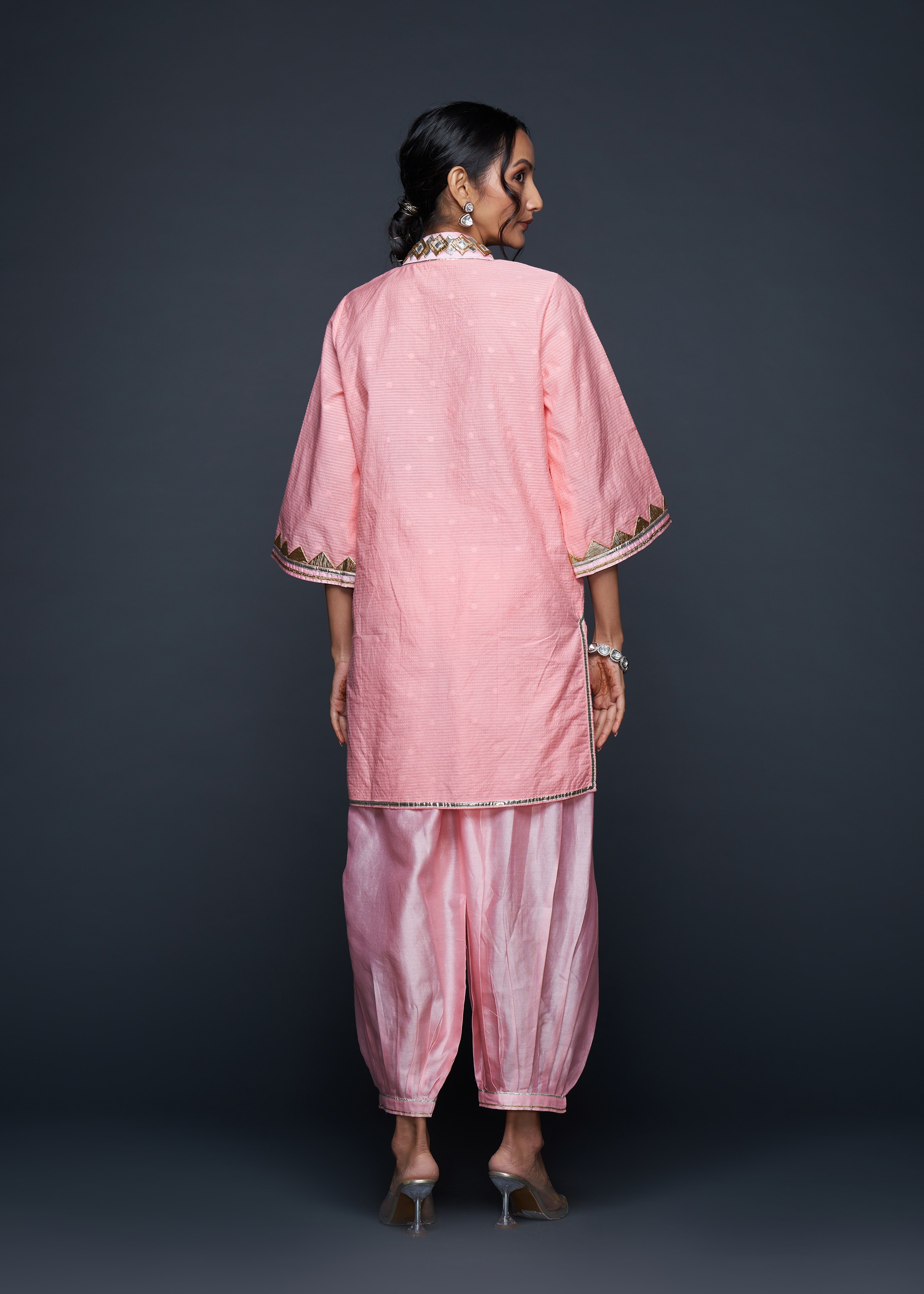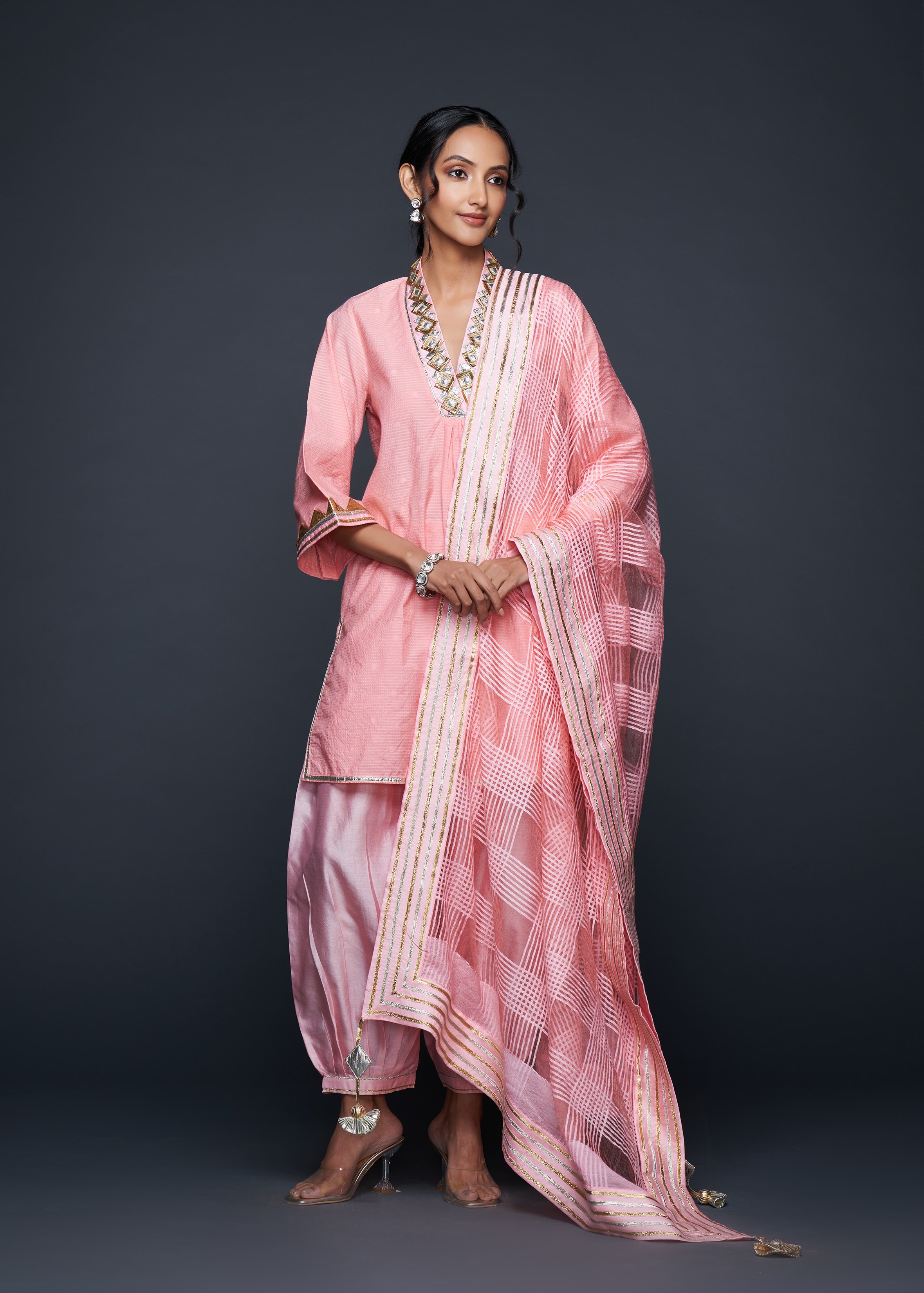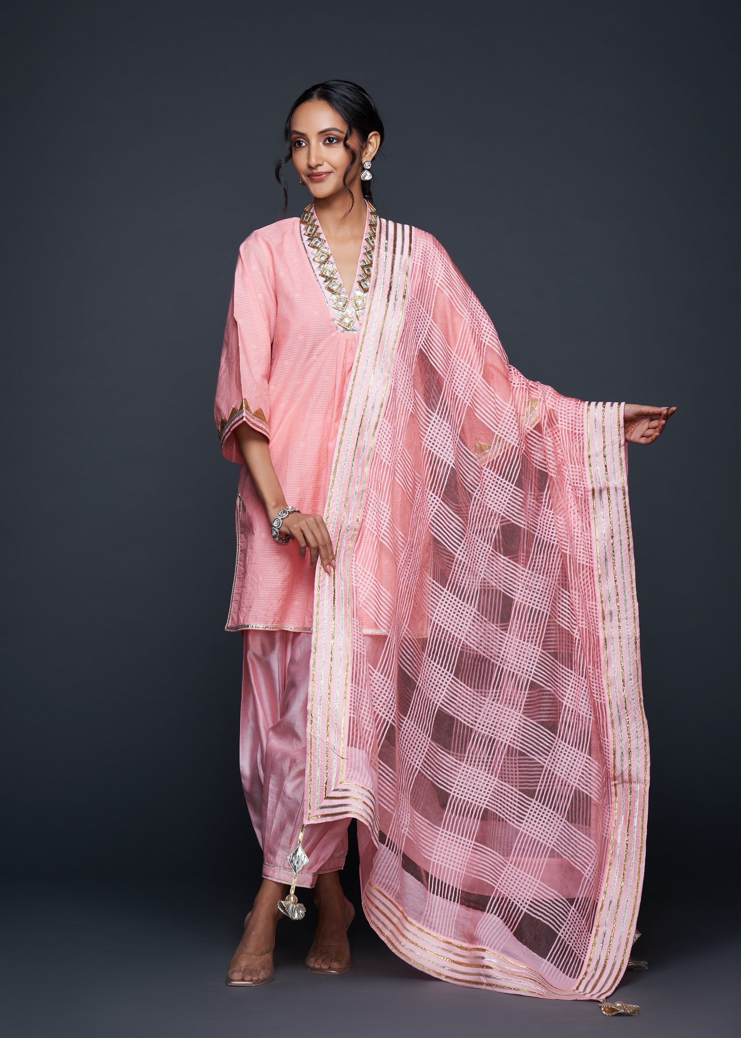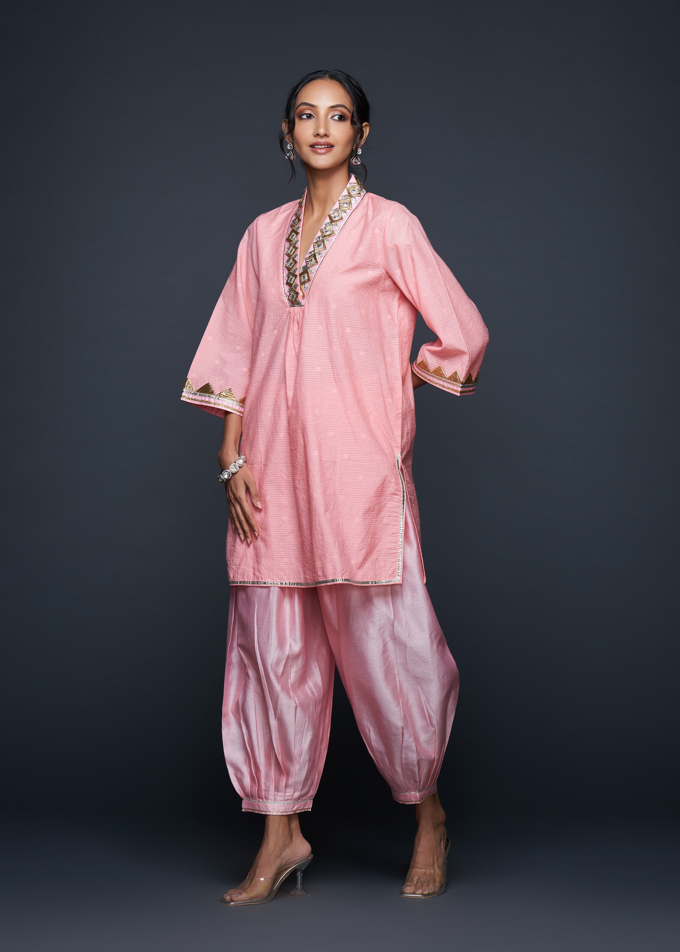 Designed to pair seamlessly with the Salwar, this Short Tunic merges modern silhouettes with traditional gota appliqués, embodying casual elegance.