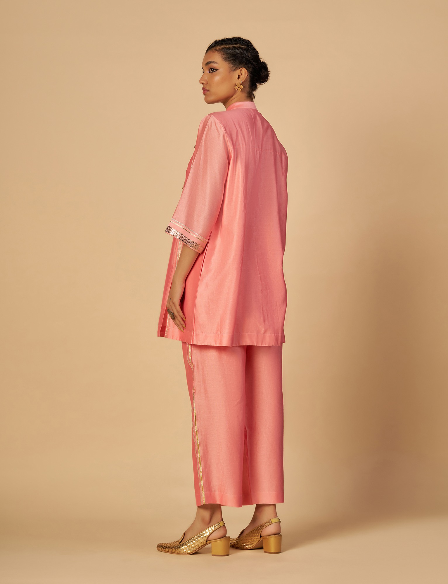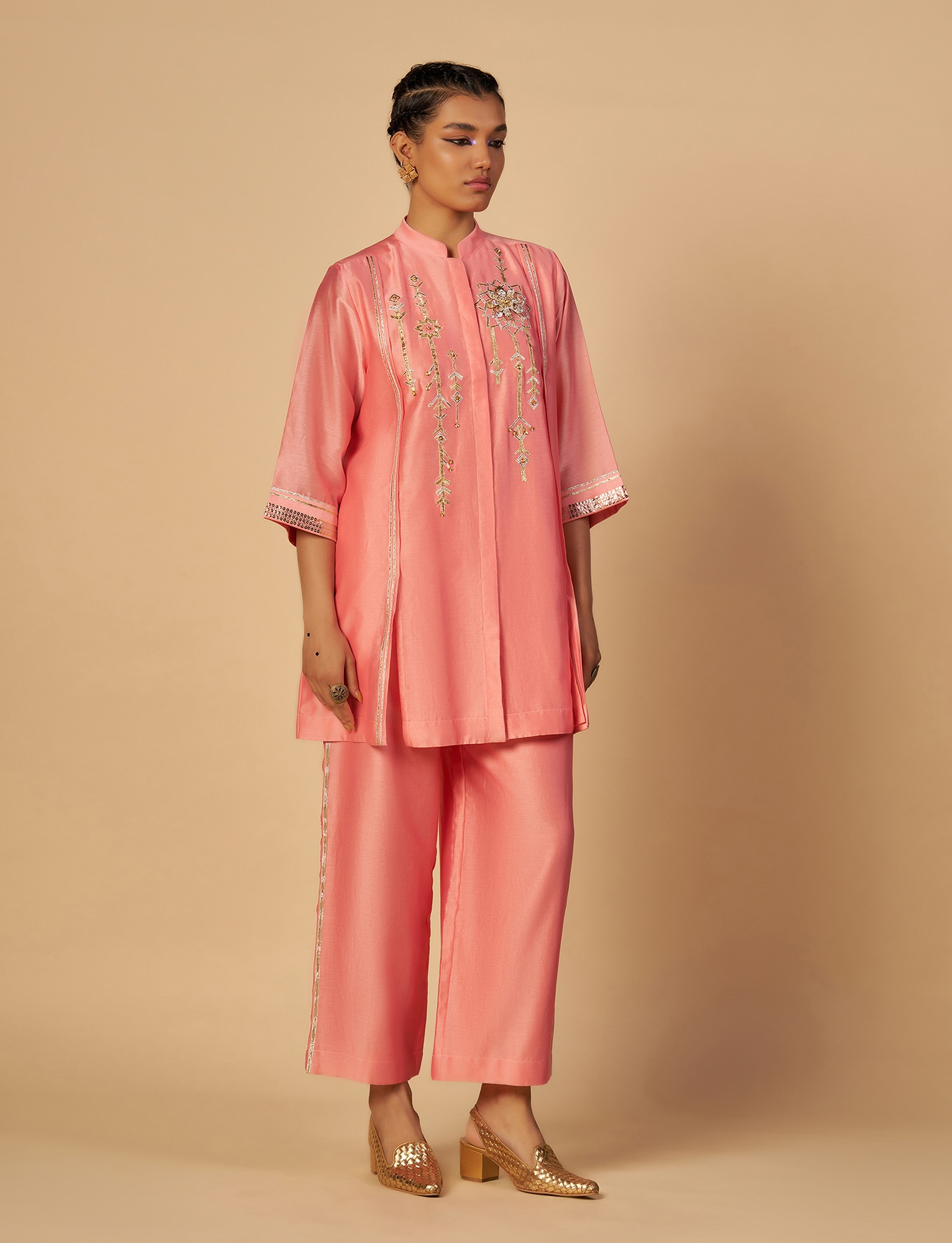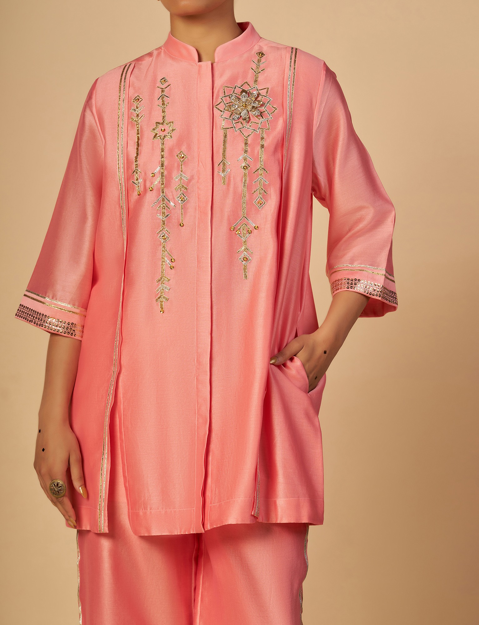 Pink silk chanderi straight shirt with 3/4th sleeves, pleating detail with gota work and sequin embroidery on the front, with a beautiful hand made 3D gota flower.