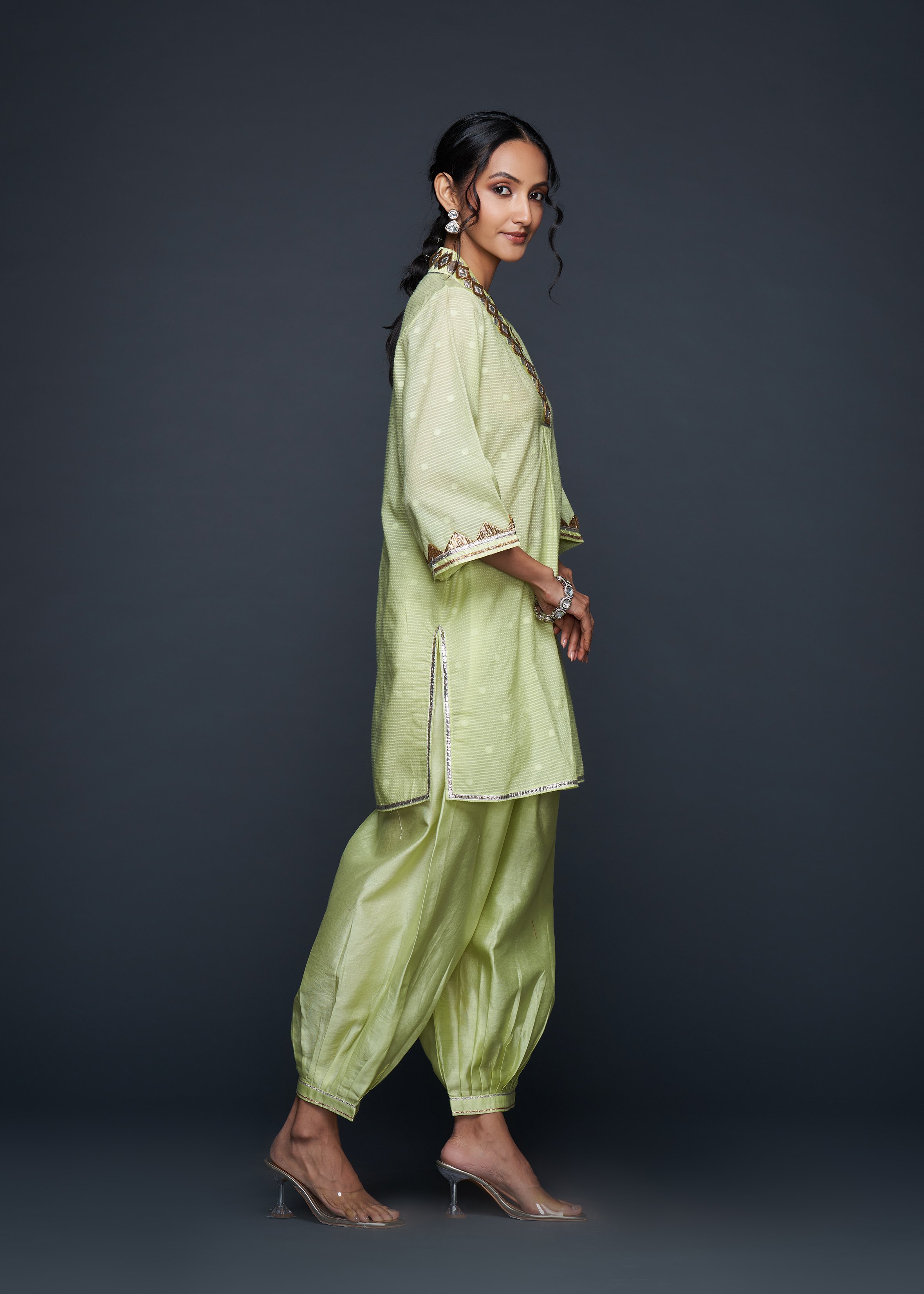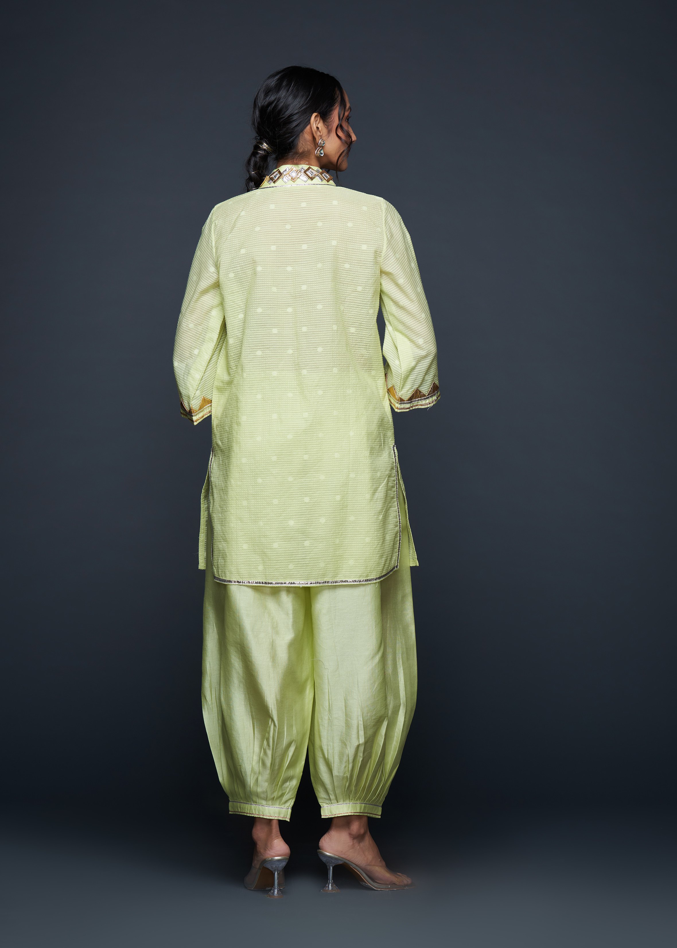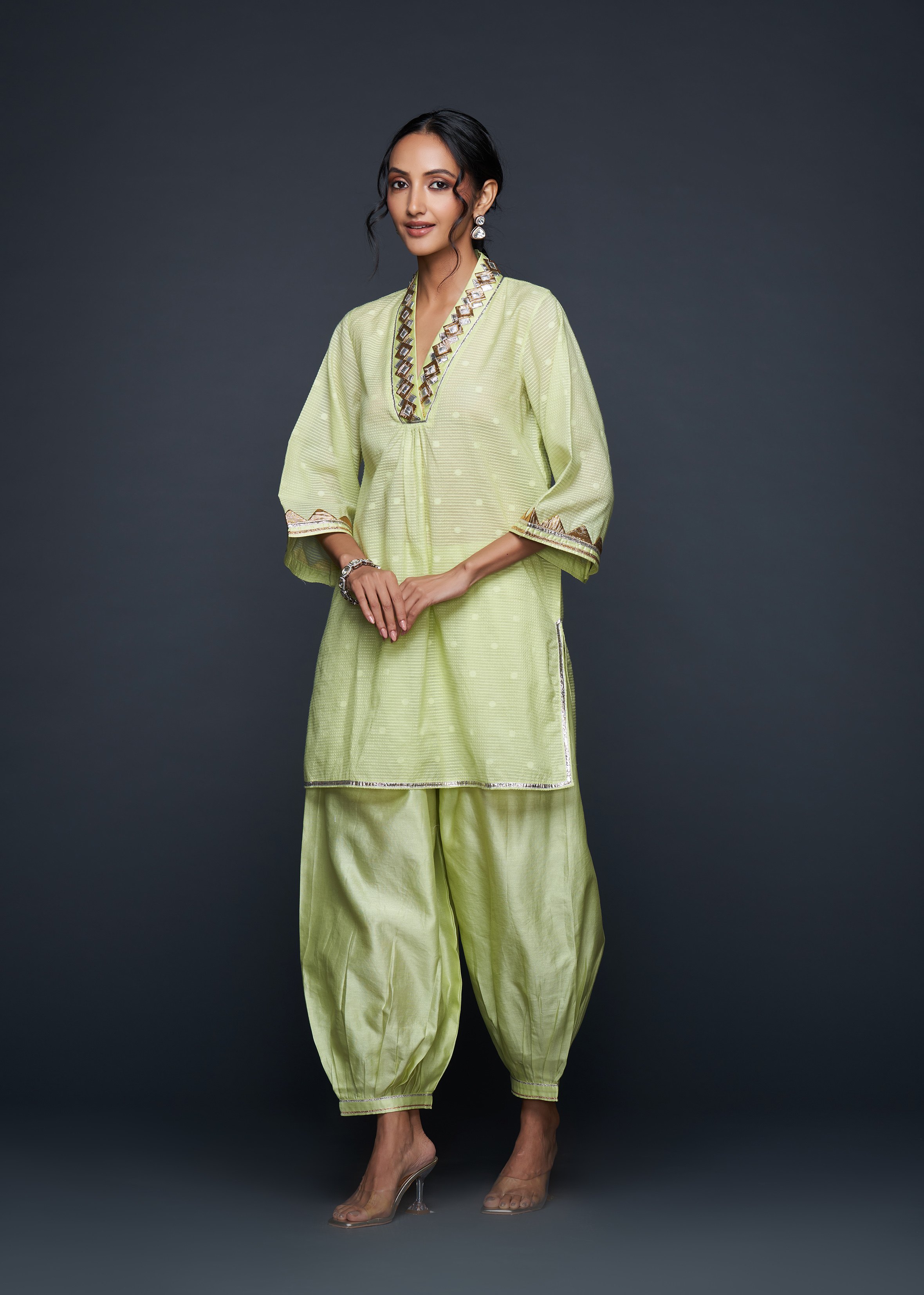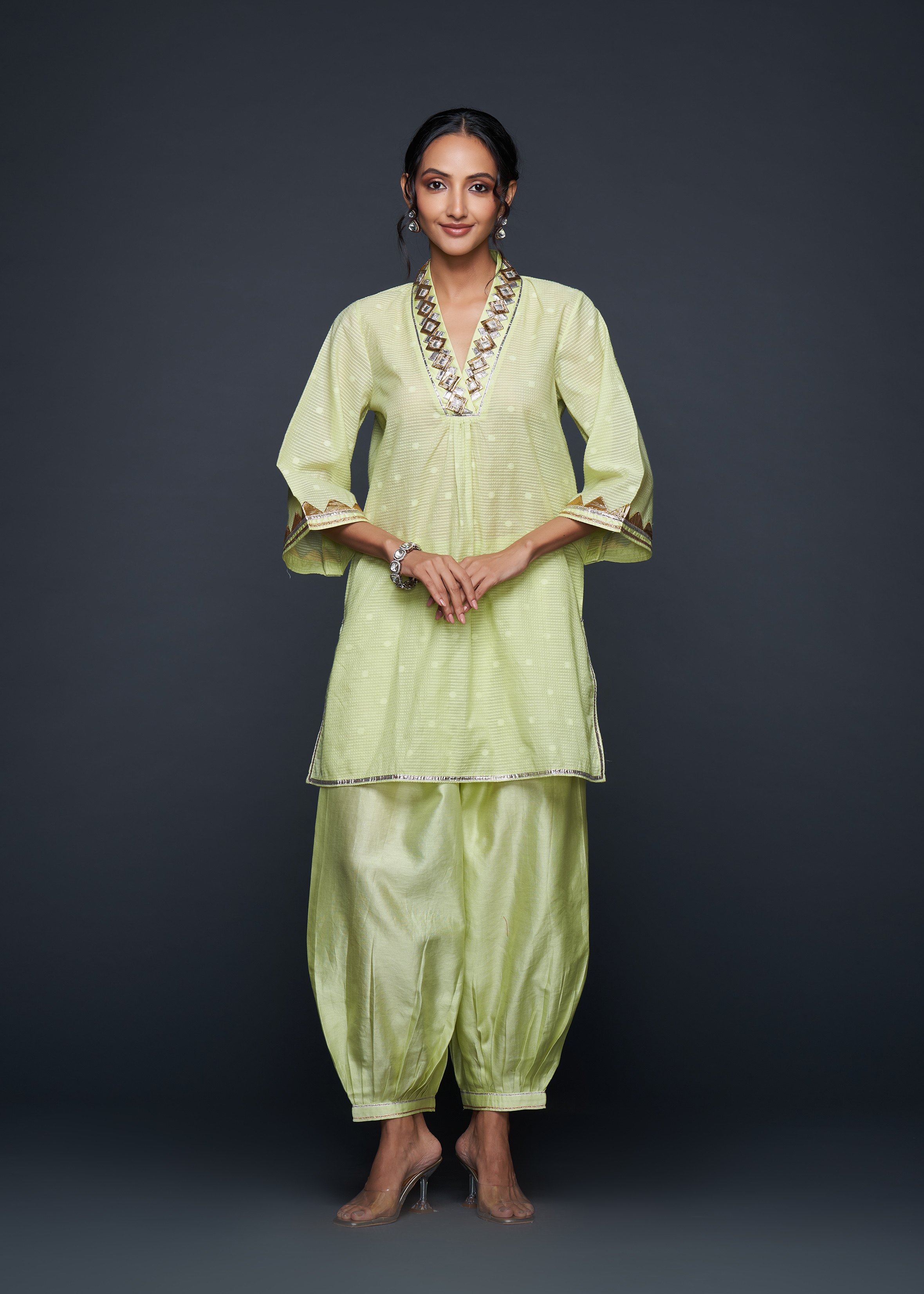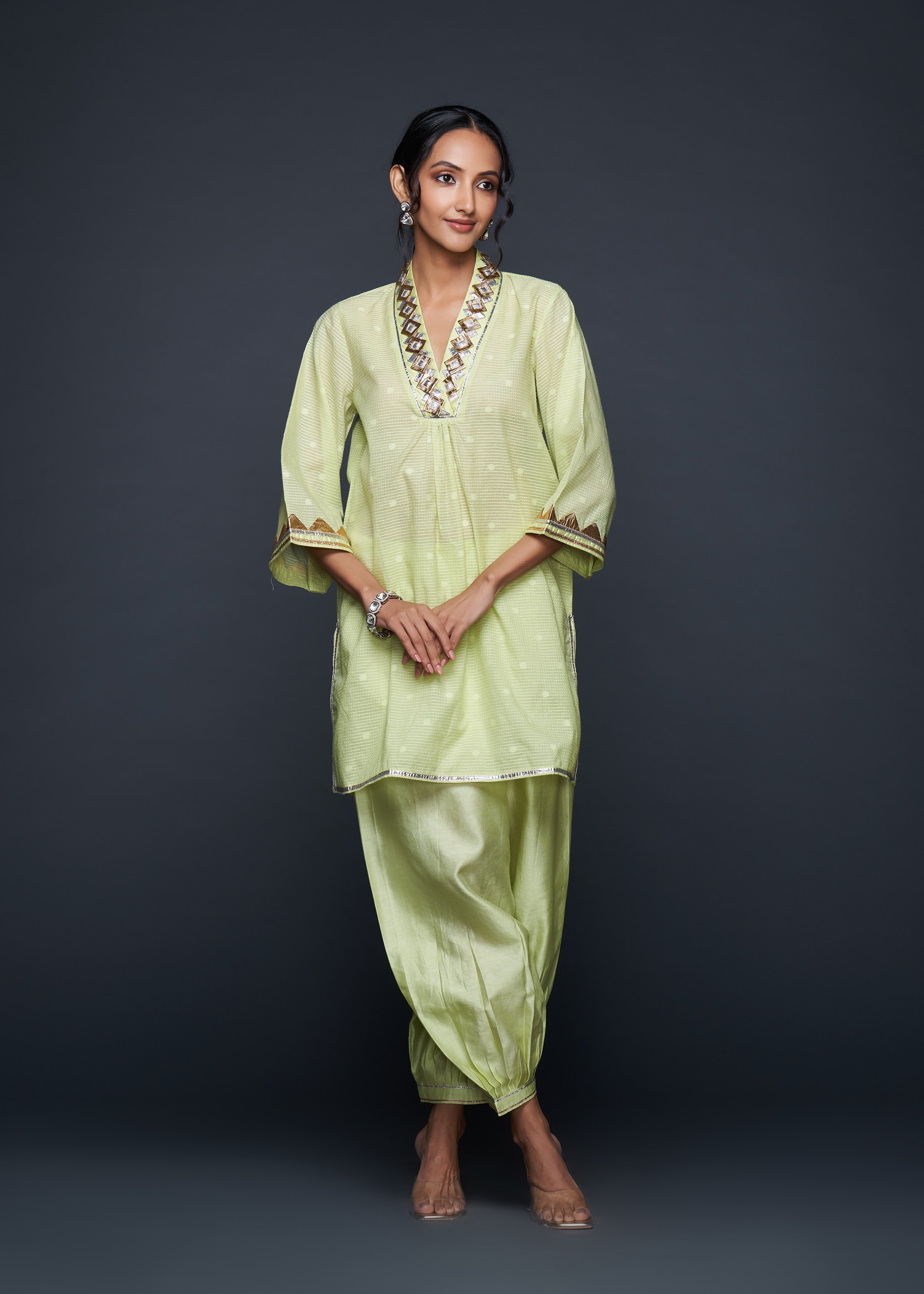 Designed to pair seamlessly with the Salwar, this Short Tunic merges modern silhouettes with traditional gota appliqués, embodying casual elegance.
