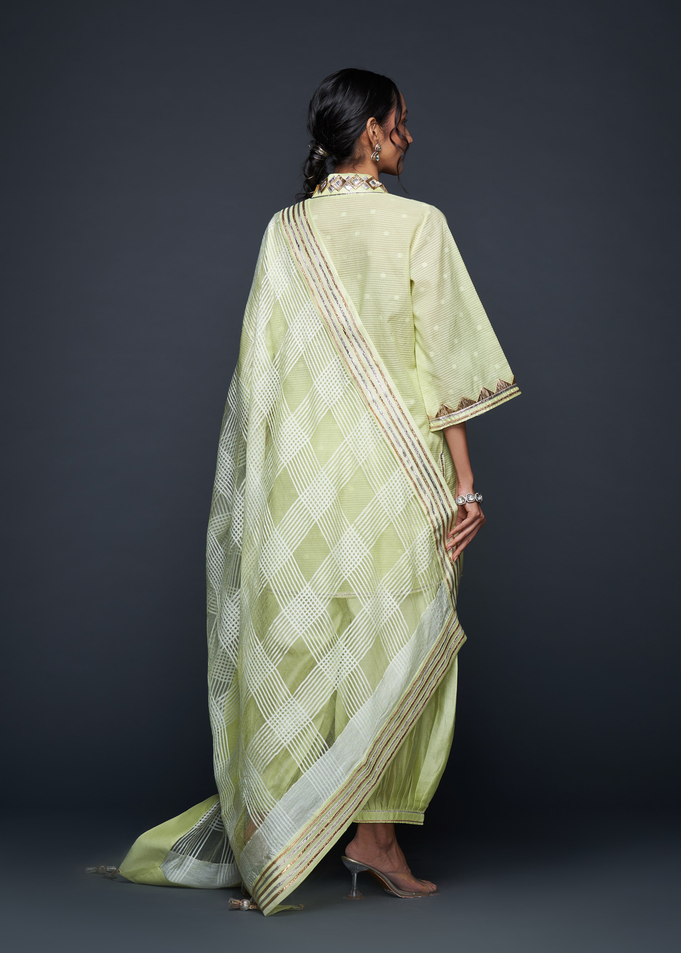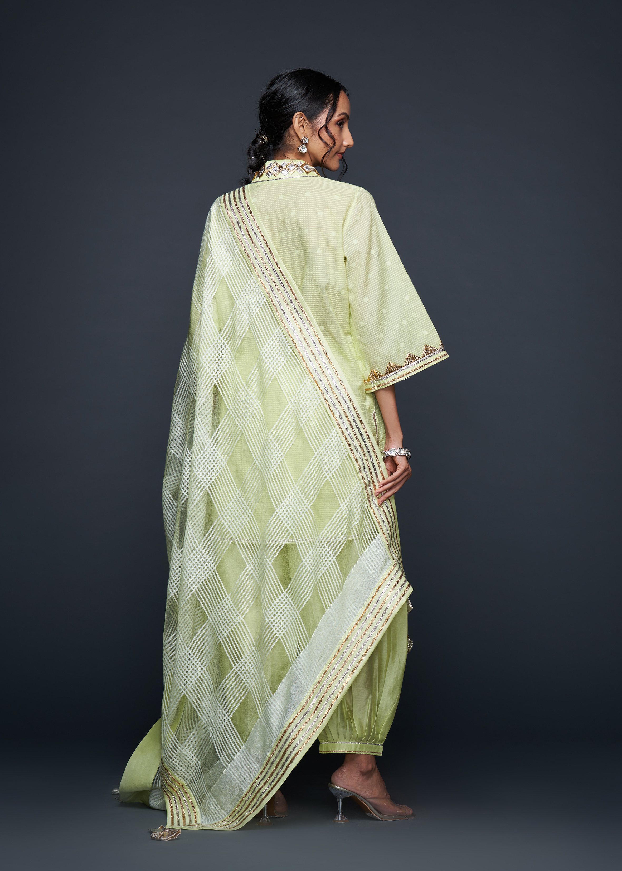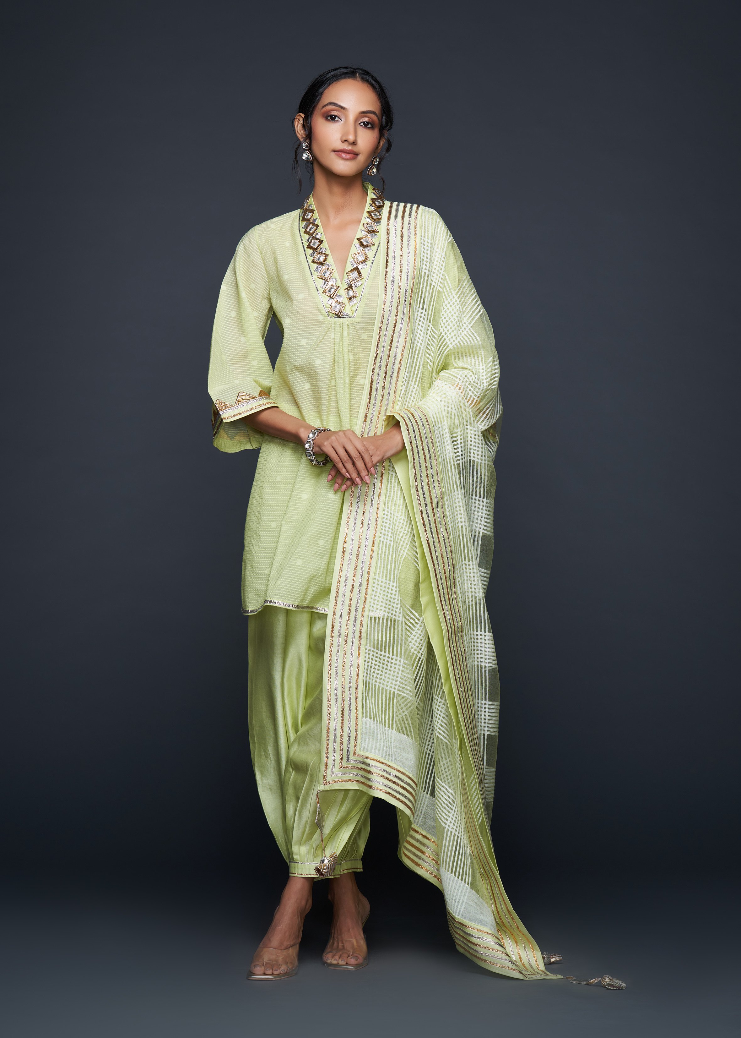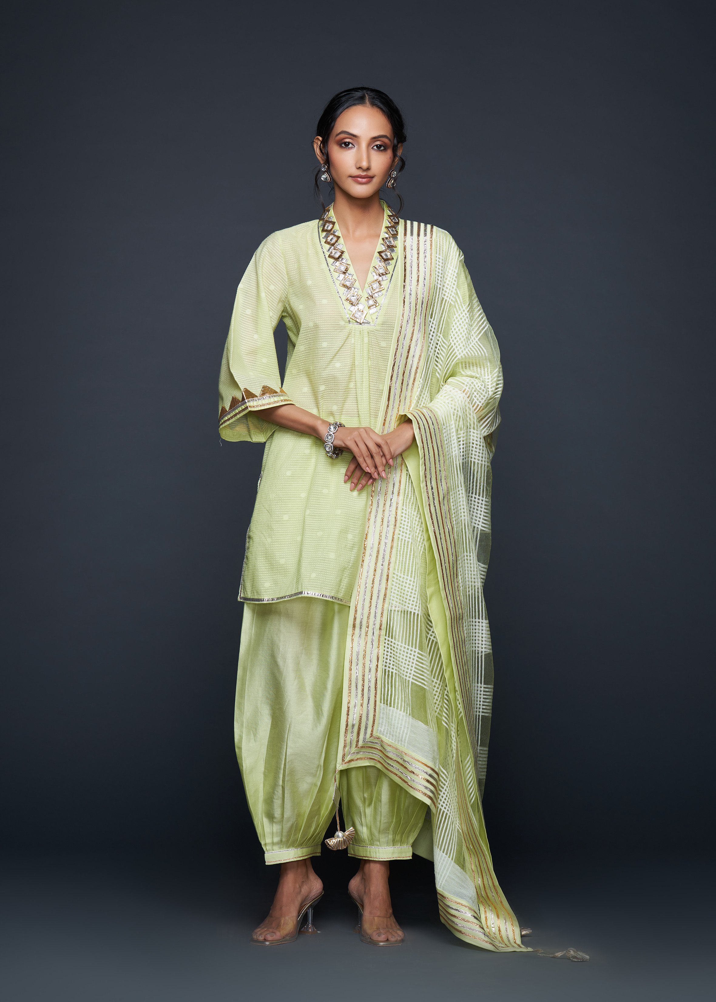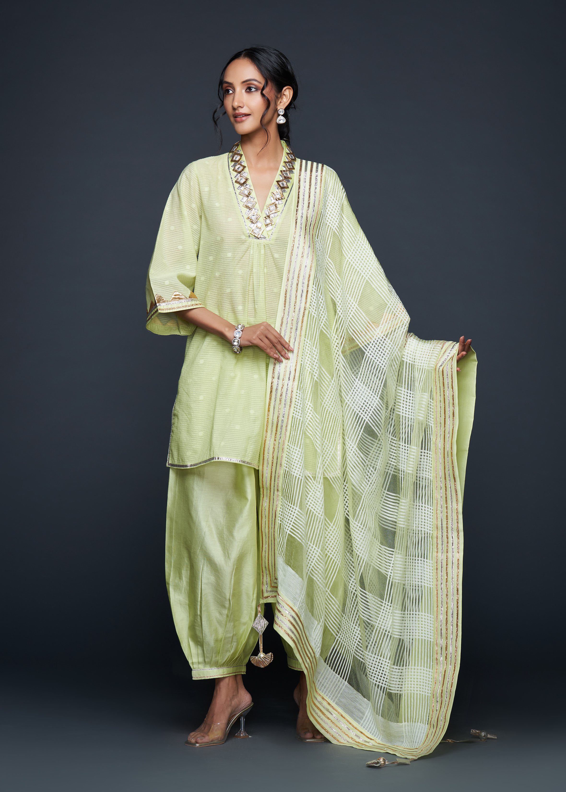 Designed to pair seamlessly with the Salwar, this Short Tunic merges modern silhouettes with traditional gota appliqués, embodying casual elegance.
