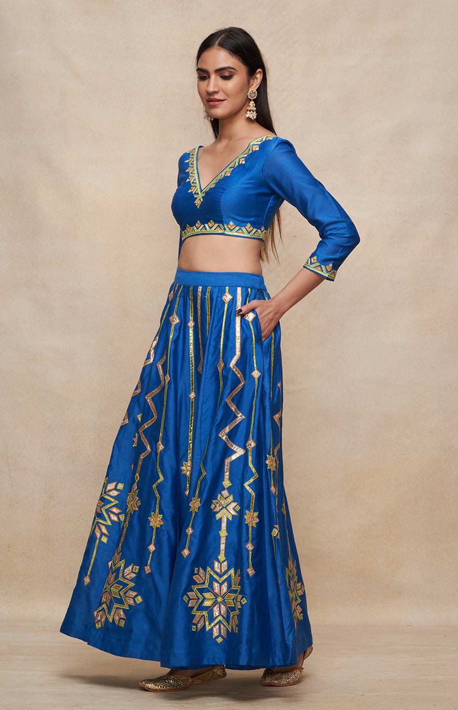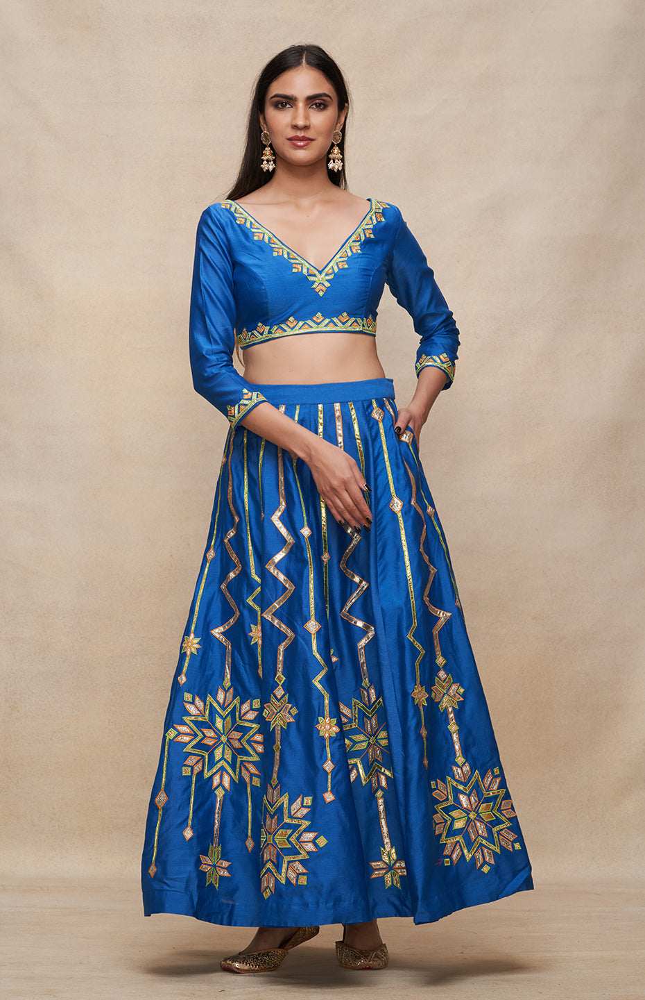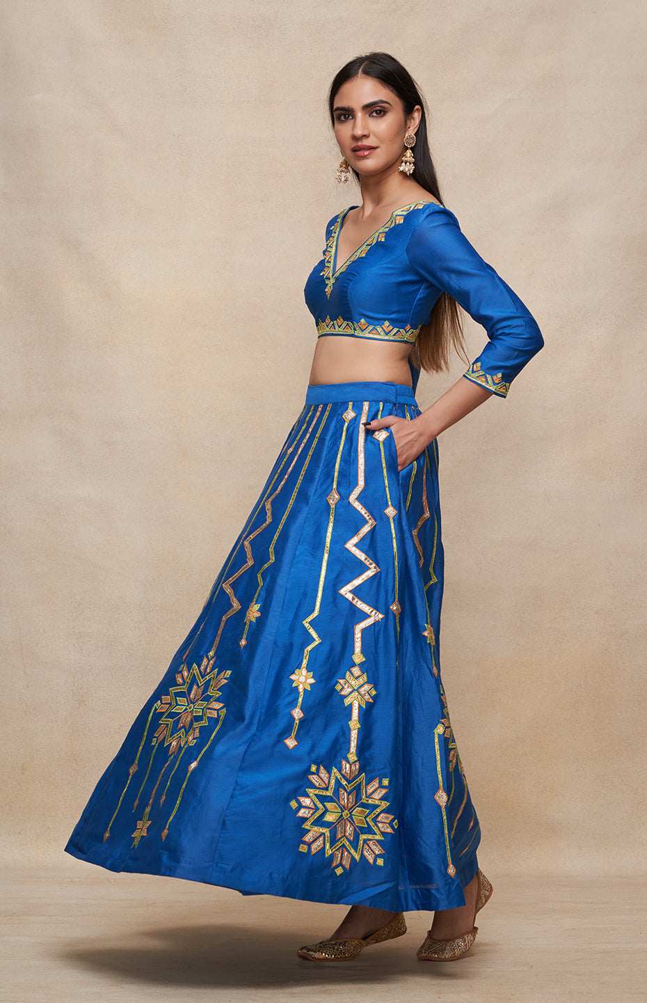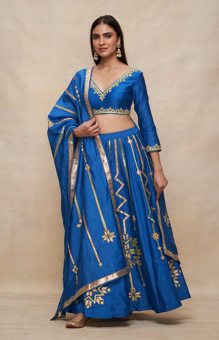 This multikali gota and resham lehenga is a must have for the season of festivities.