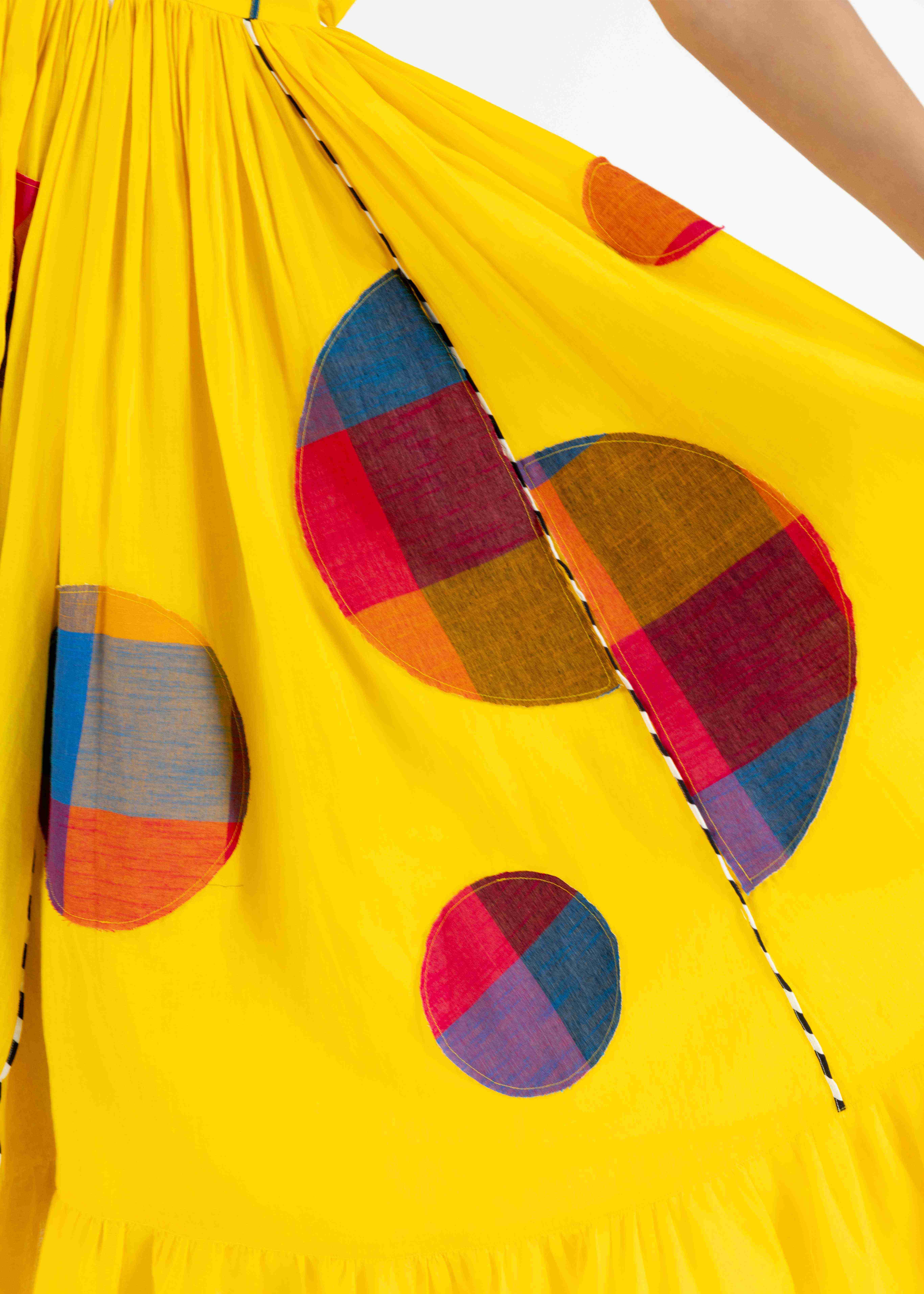 A Cheerful Yellow Gathered Dress Featuring Soft Gathers And A Light, Flowy Multi Panel Silhouette With Lots Of Flare, Detailed With Multicolor Polka Applique And Monochrome Printed Piping Perfect As Sun Dress For An Evening Out.