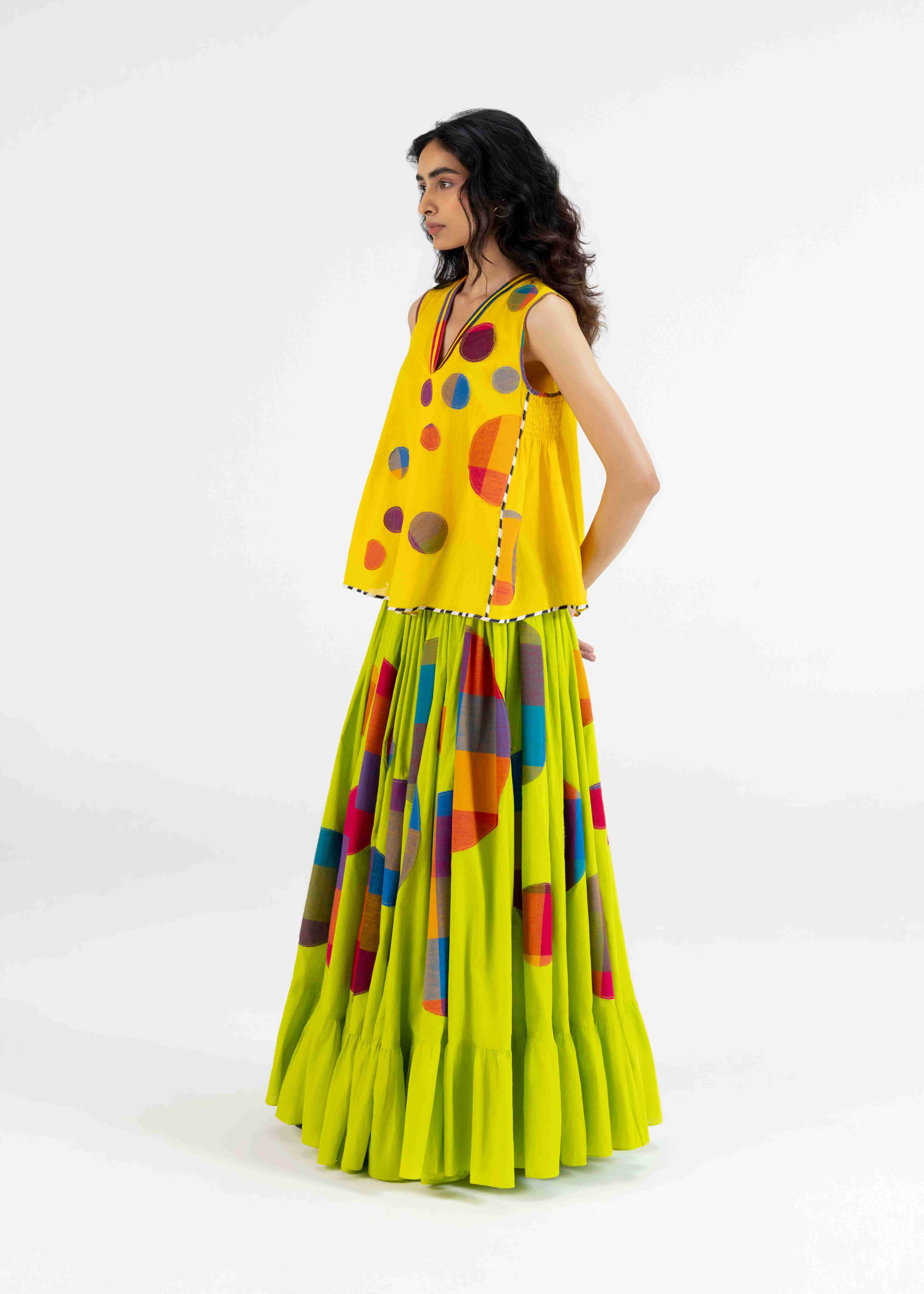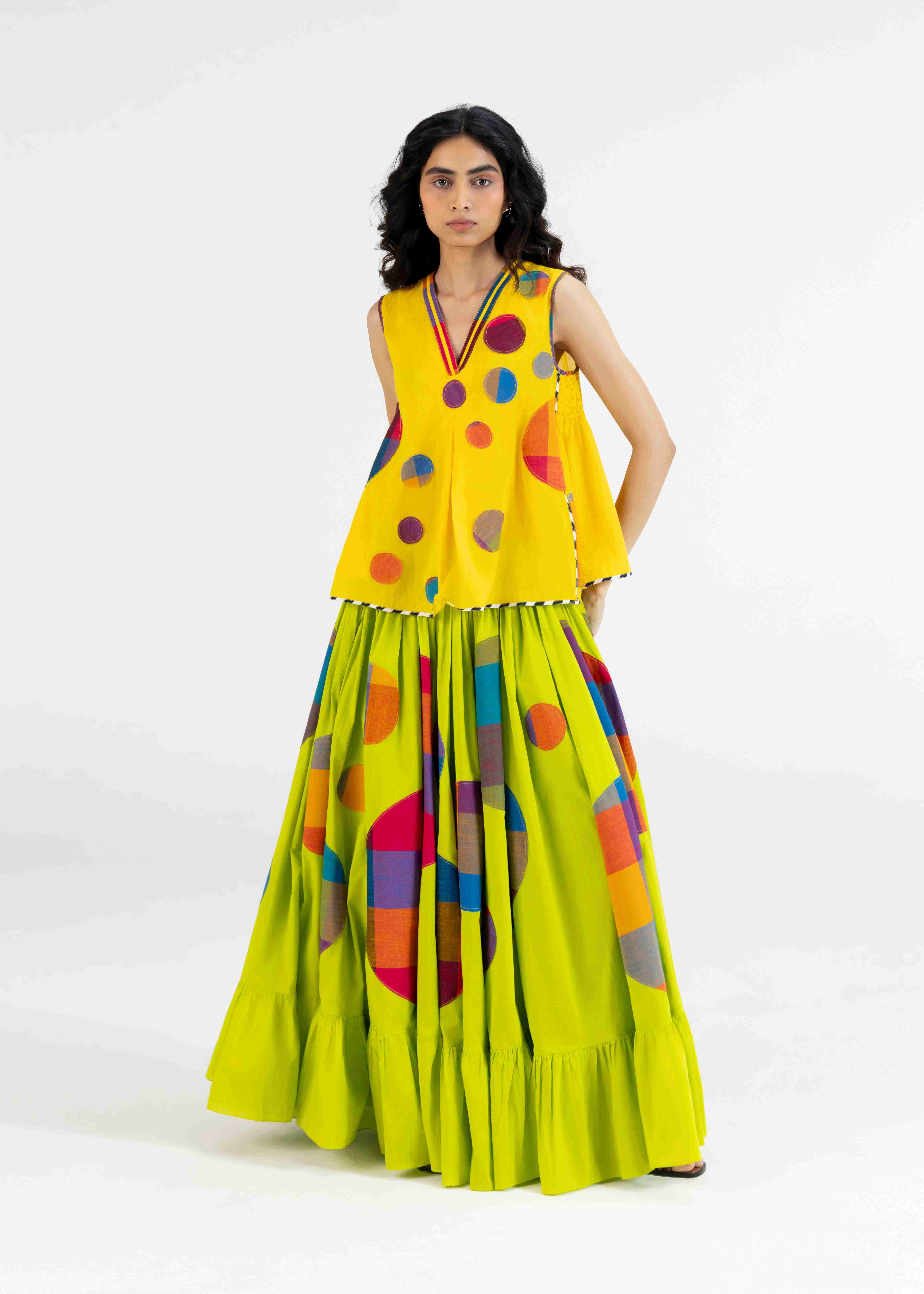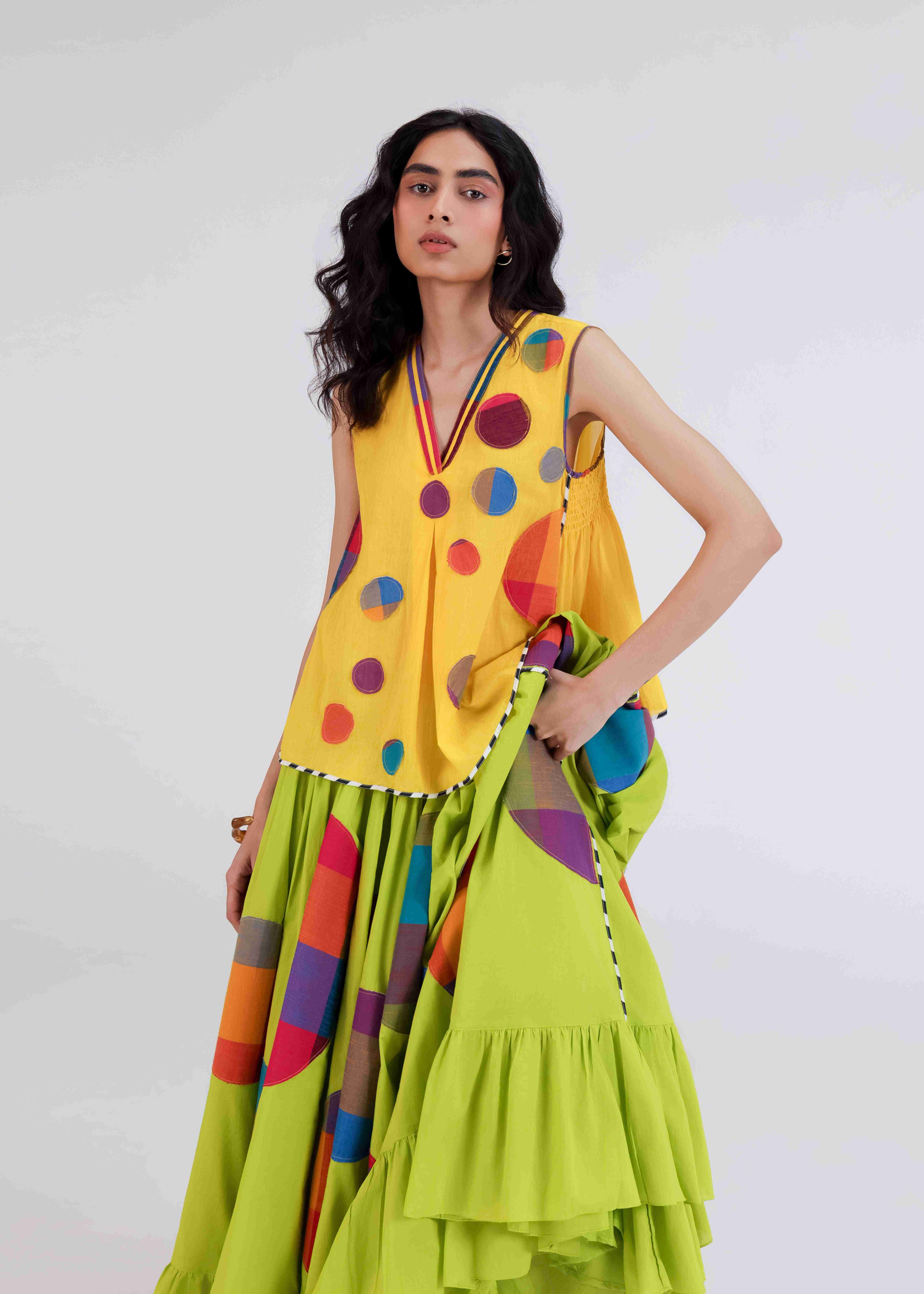A Playful Yellow Sleeveless Smock Detail Top Designed With Multicolour Polka Appliqué And Monochrome Printed Piping Detail For A Playful, Comfortable And Chic Look